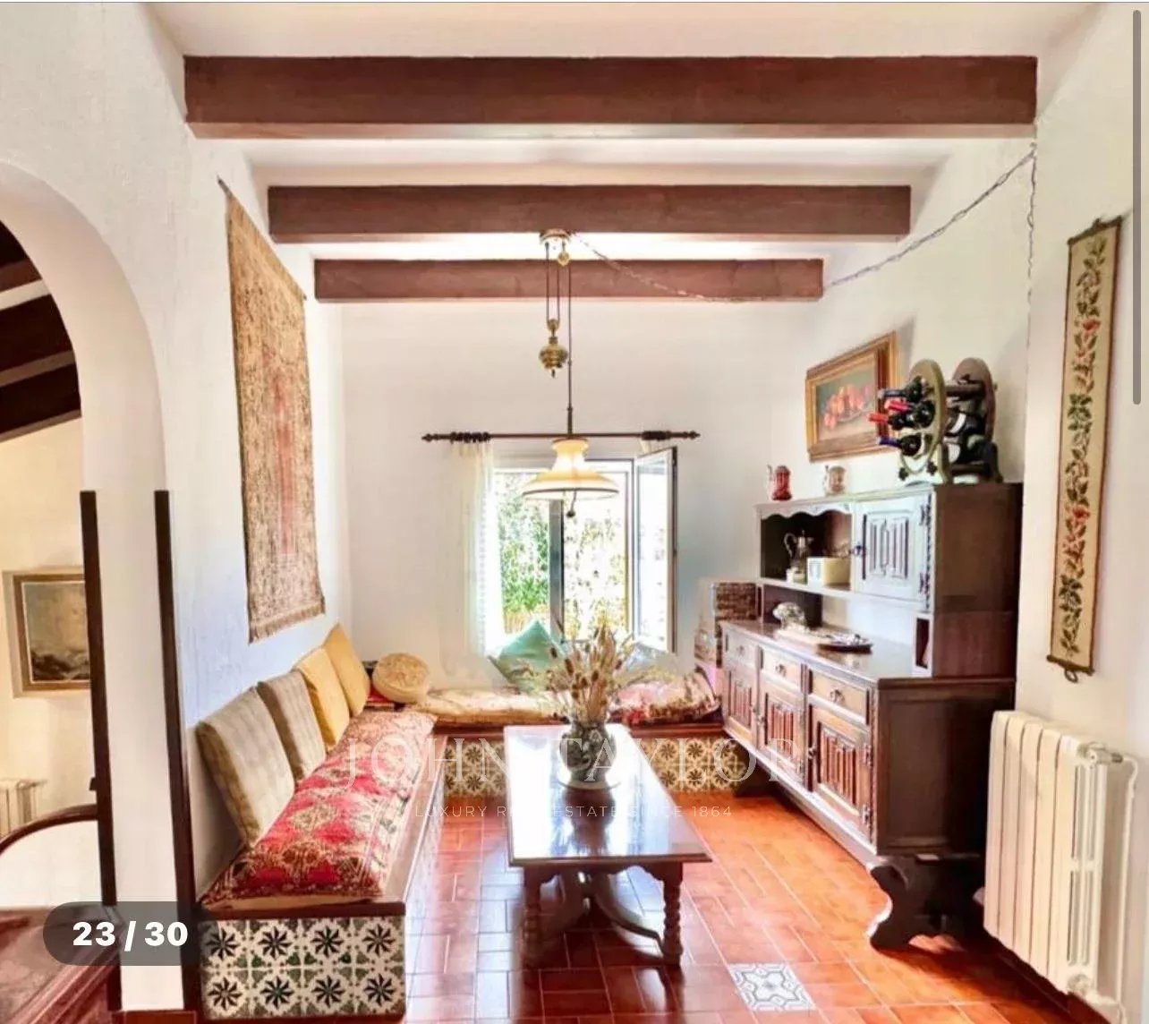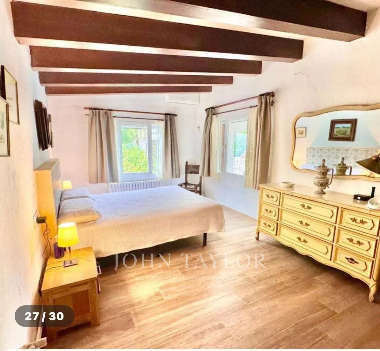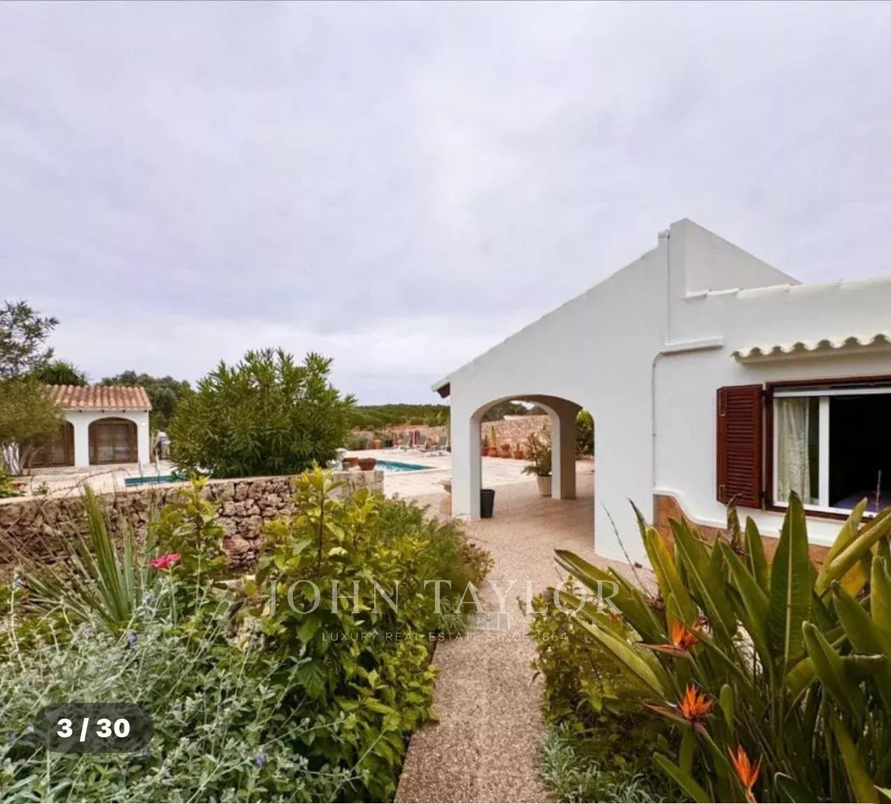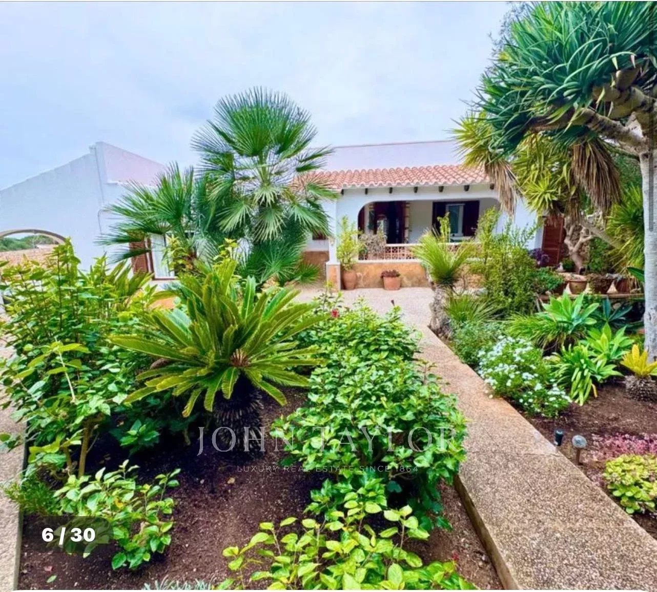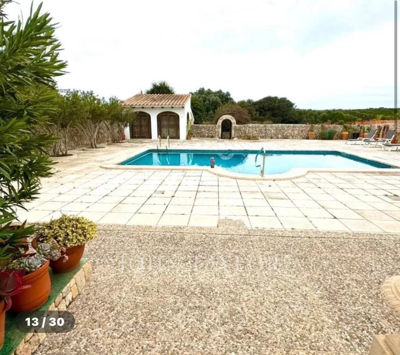 Construida sobre una amplia parcela de aproximadamente 3.370 m², la vivienda ofrece 331 m² de superficie y múltiples posibilidades para disfrutar de la vida mediterránea. Rodeada de un cuidado jardín, la casa se distribuye en una luminoso salón, cocina independiente, tres dormitorios de generosas dimensiones –uno de ellos con baño en suite– y una acogedora habitación en el sótano. Destaca su imponente comedor con acceso directo a la terraza cubierta, que conecta con el jardín y la piscina, y que podría convertirse fácilmente en un cuarto dormitorio.