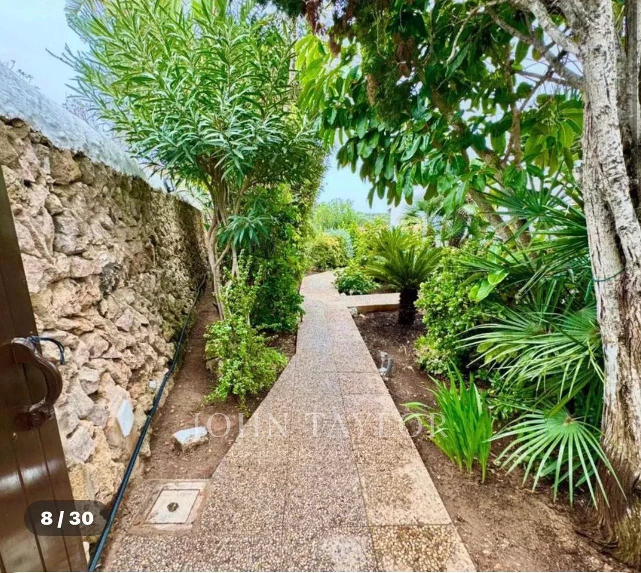 Desde la amplia terraza soleada, una encantadora puerta de madera conduce a un terreno perfecto para crear un huerto privado o un espacio de recreo al aire libre.