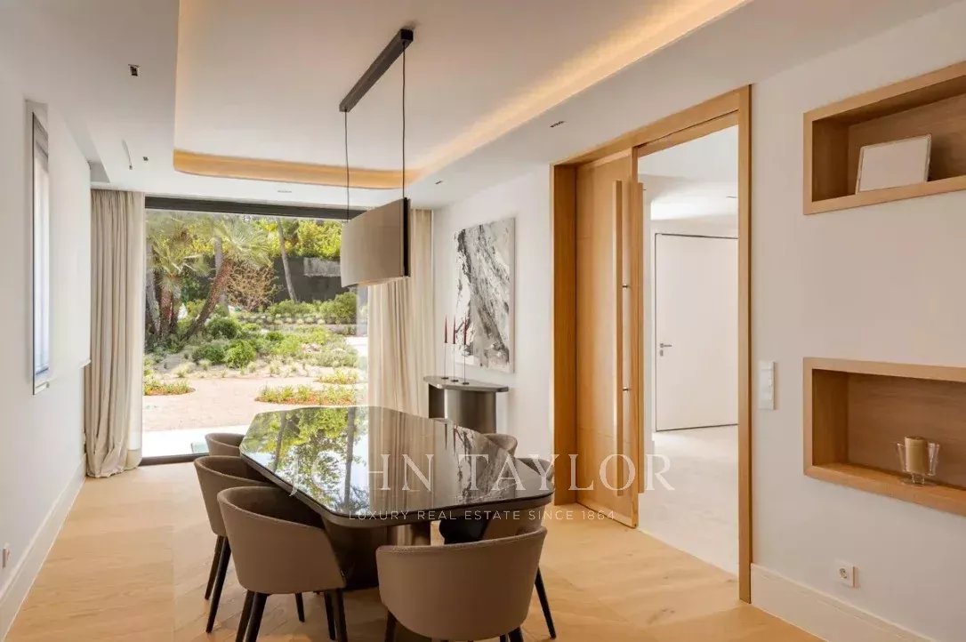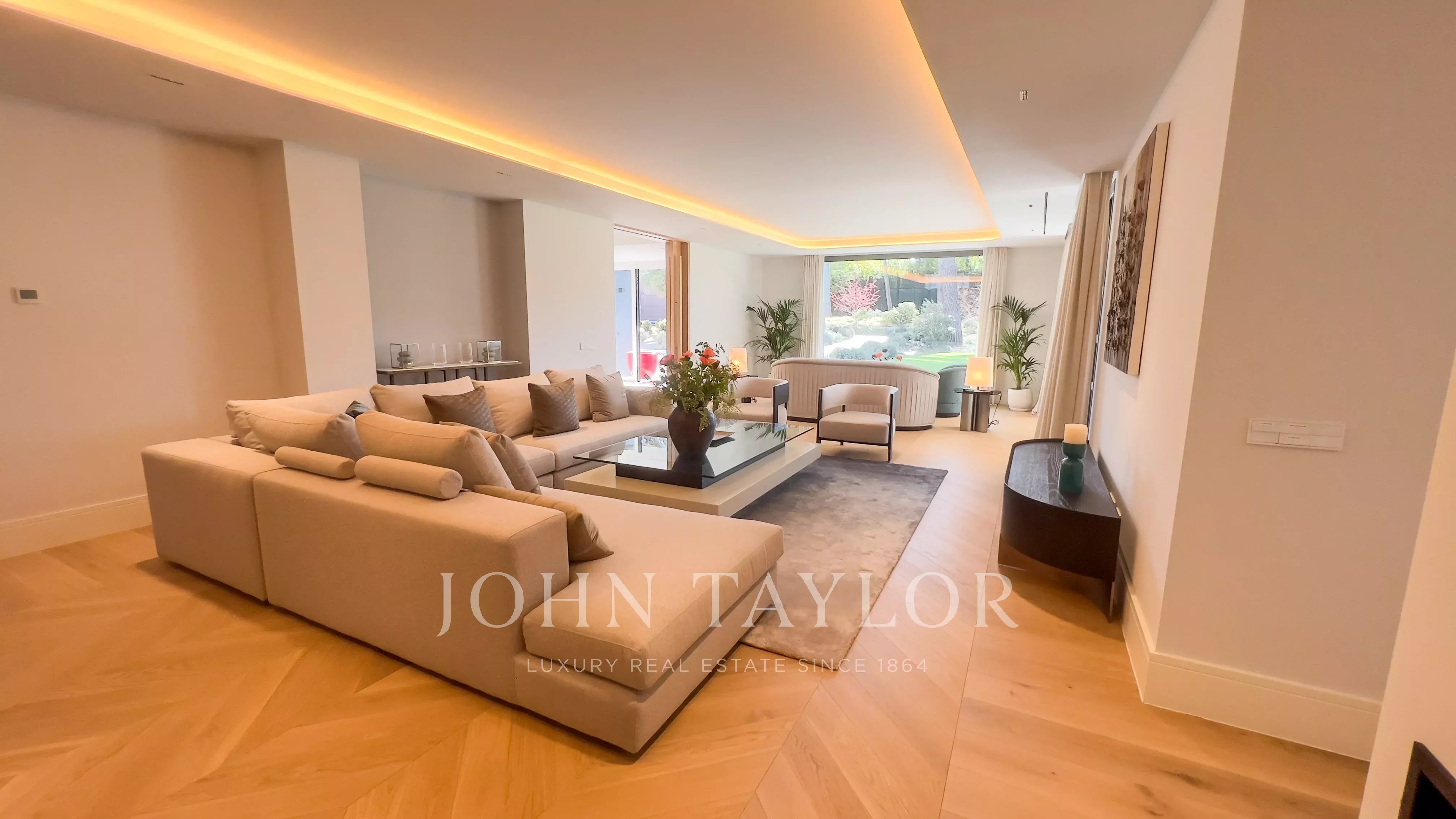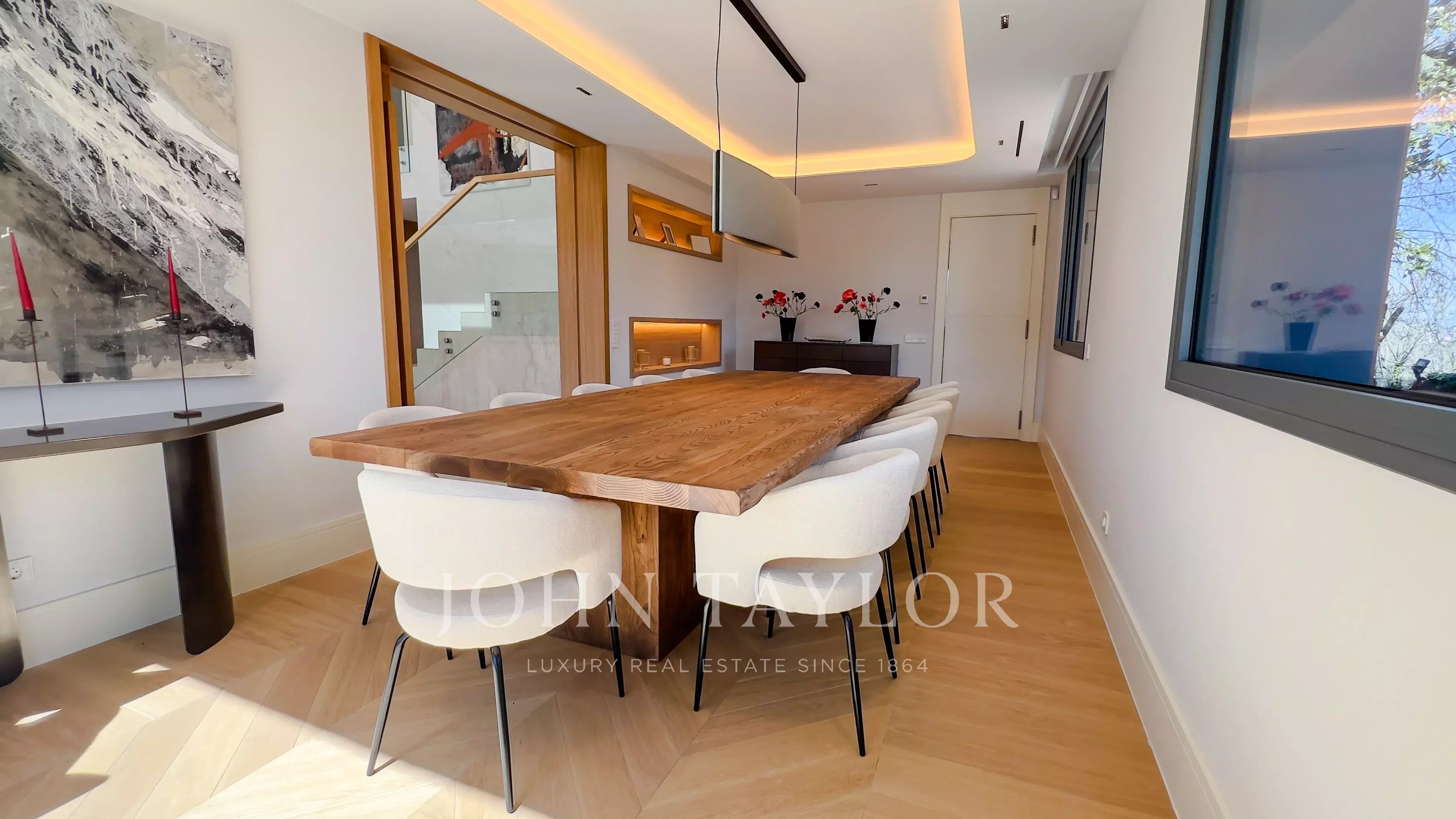 La planta principal alberga un elegante hall de doble altura, gran salón con salida al jardín y la piscina, sala de estar con bar, cocina de diseño equipada con electrodomésticos de Gaggenau y zona de office. En este nivel se sitúa también la suite principal, con salón privado, dos vestidores y baño en suite, además de aseo de invitados.