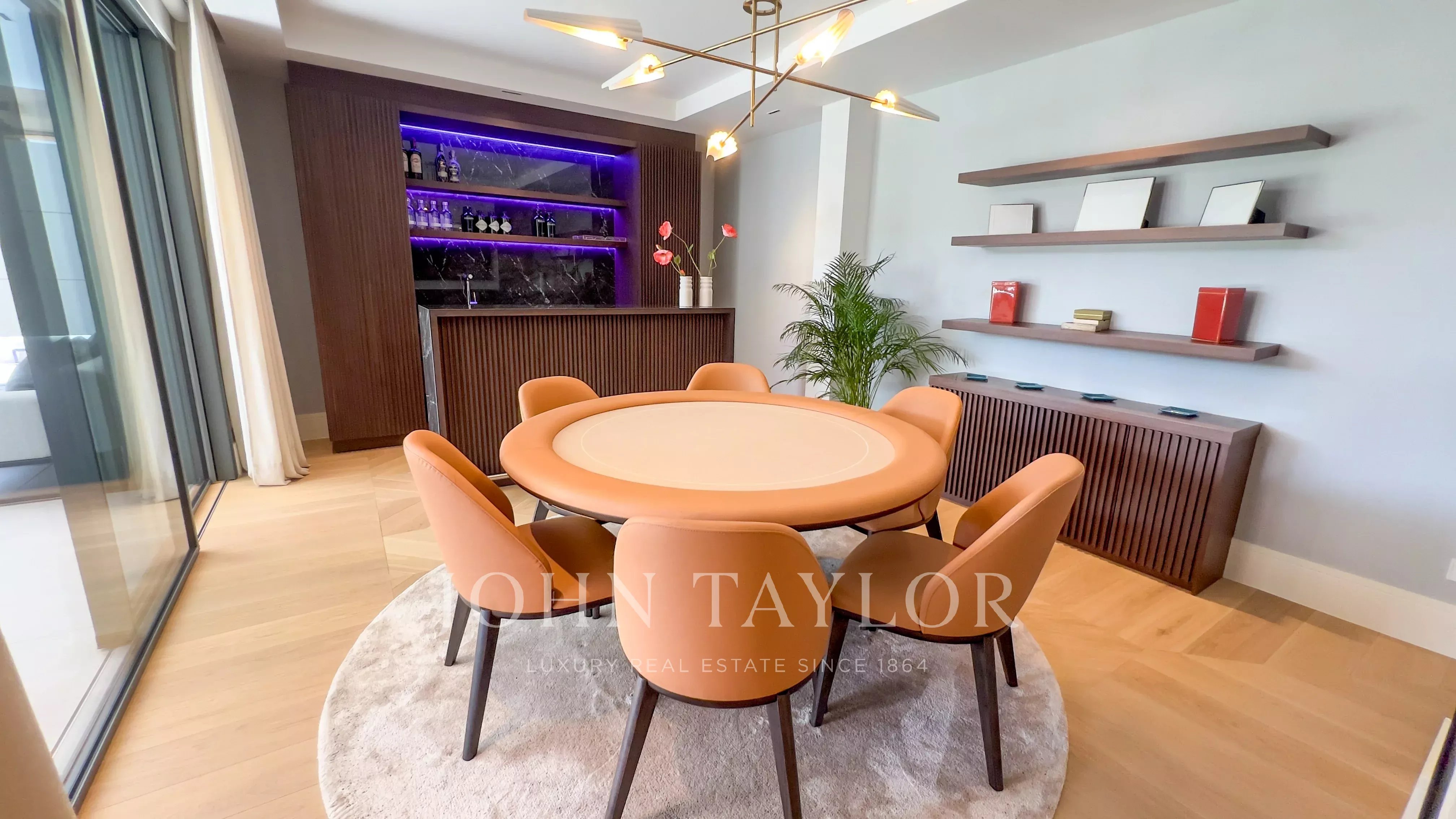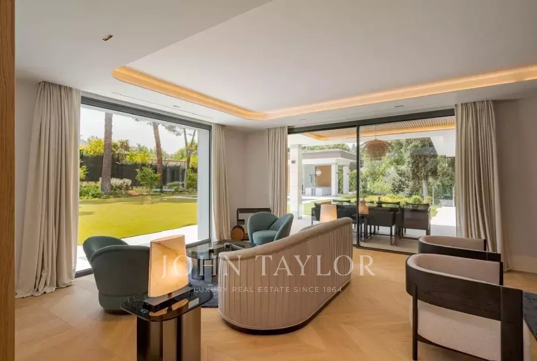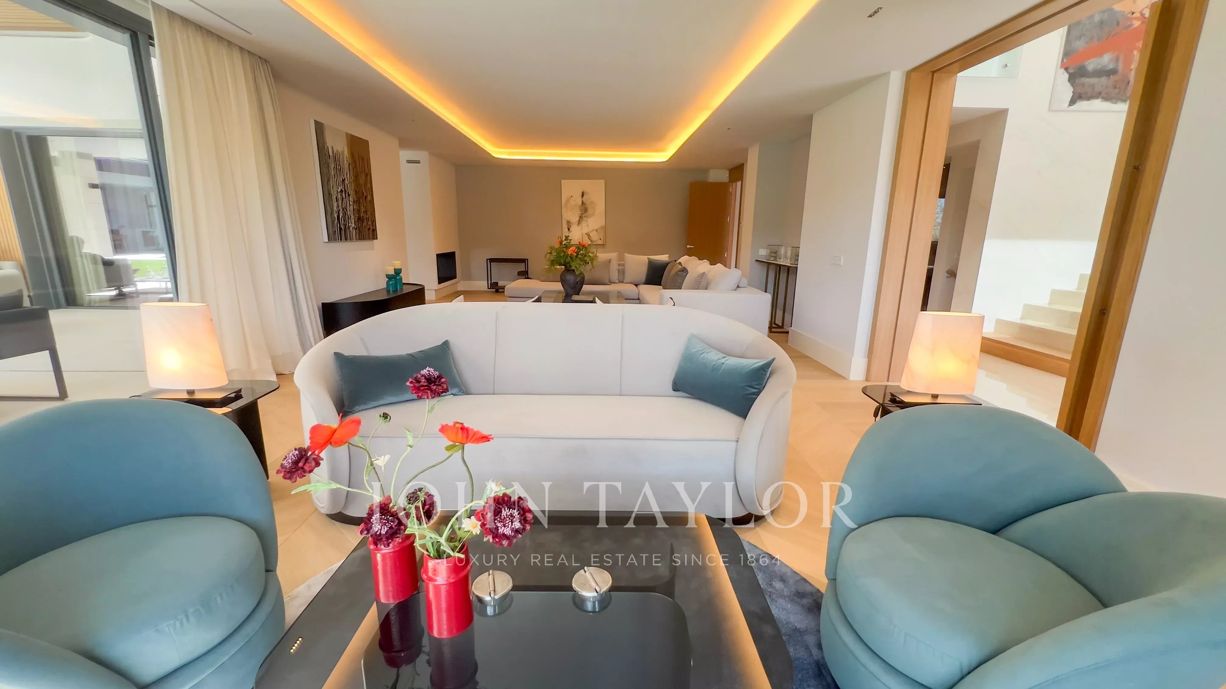 La planta principal alberga un elegante hall de doble altura, gran salón con salida al jardín y la piscina, sala de estar con bar, cocina de diseño equipada con electrodomésticos de Gaggenau y zona de office. En este nivel se sitúa también la suite principal, con salón privado, dos vestidores y baño en suite, además de aseo de invitados.