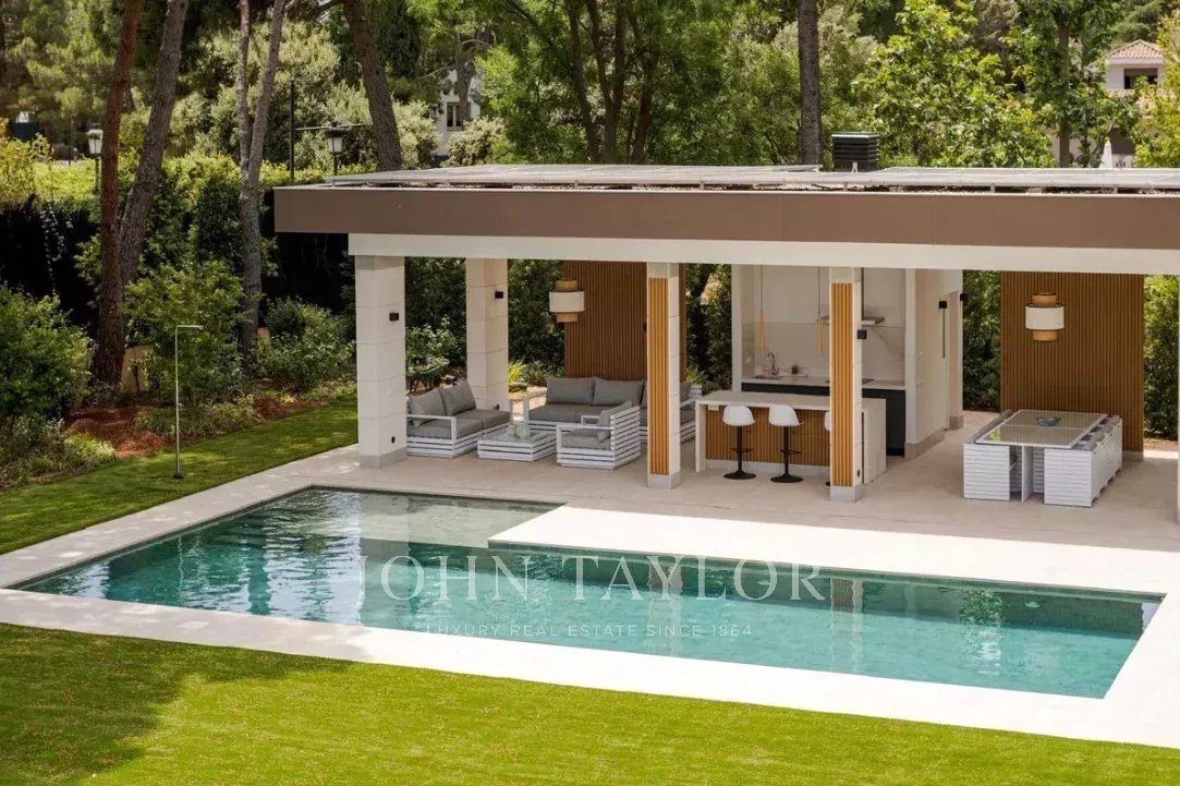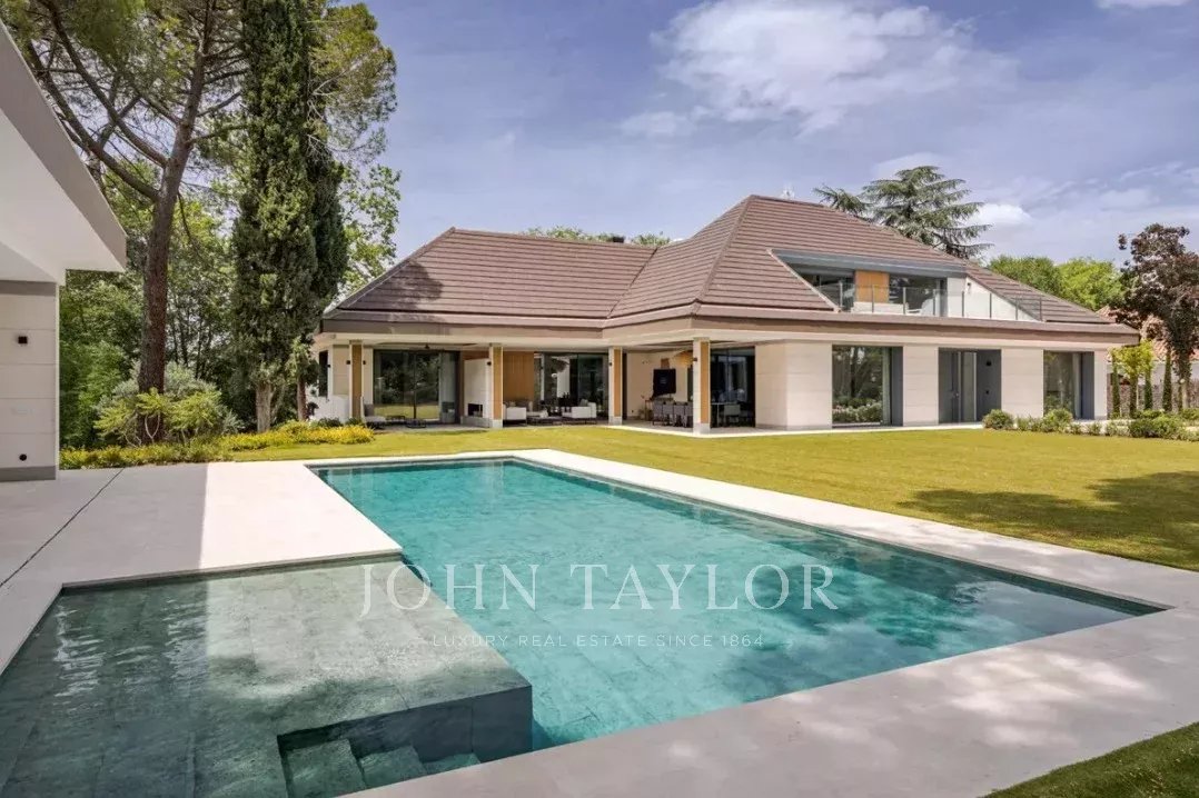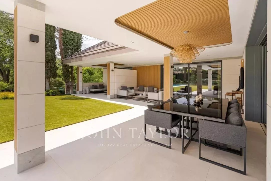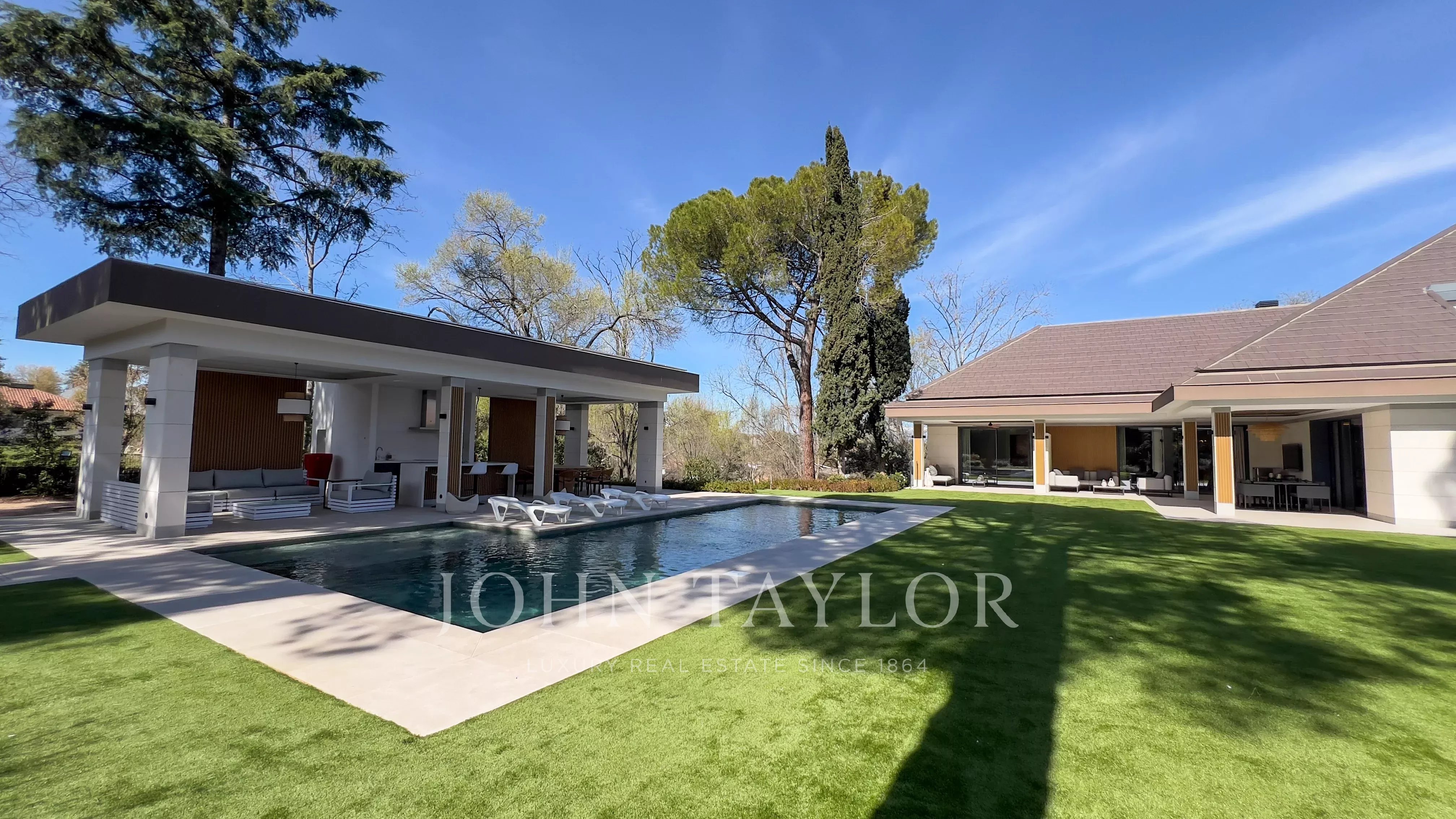 El jardín, con arbolado consolidado, piscina exterior y zona chill-out, completa esta propiedad que combina elegancia, privacidad y confort en uno de los enclaves residenciales más exclusivos de Madrid.