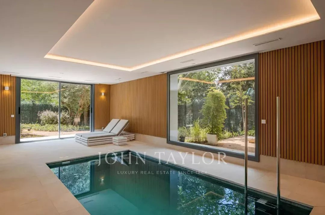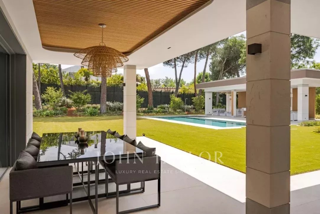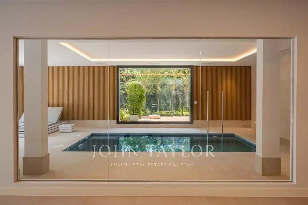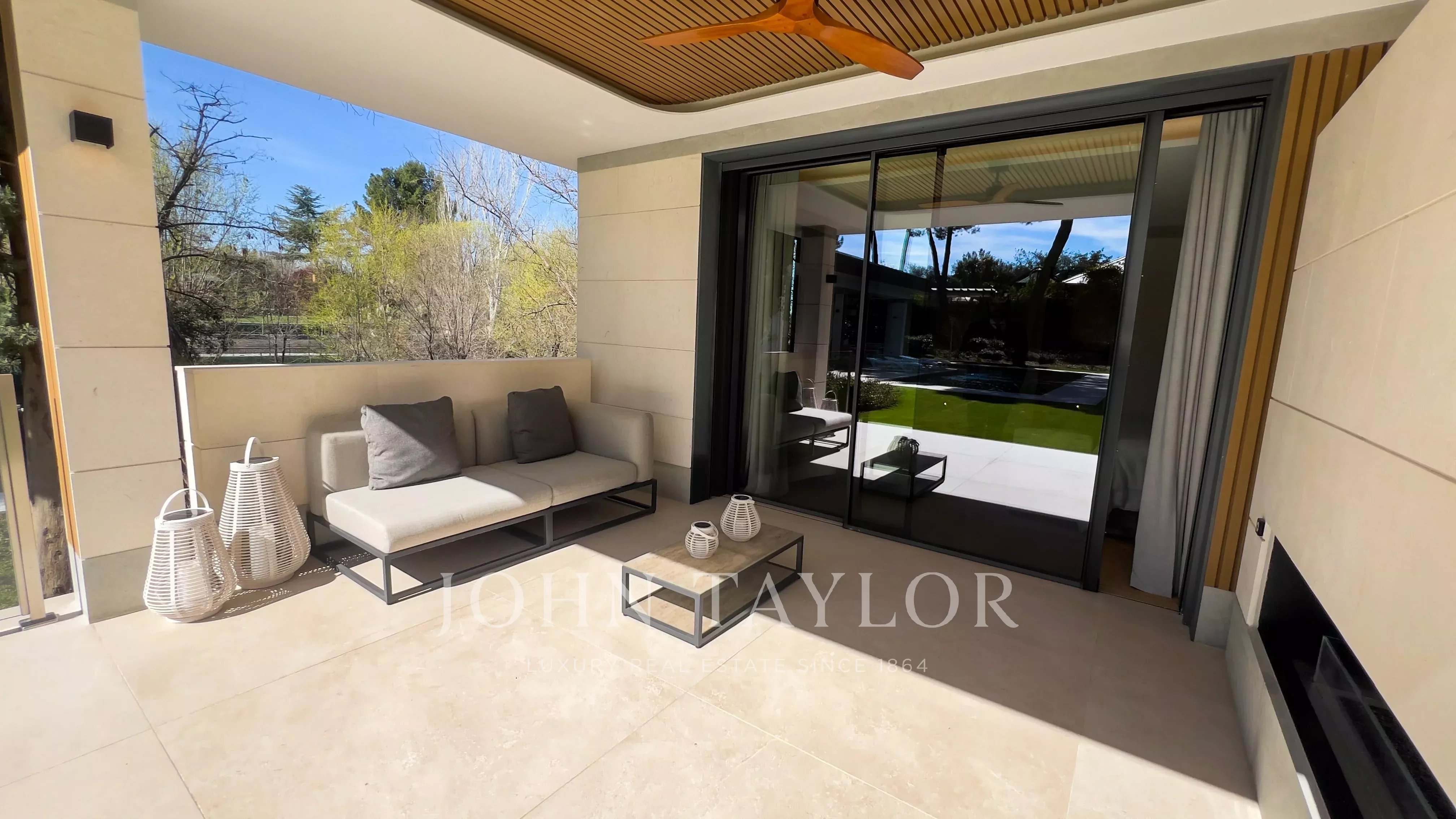El jardín, con arbolado consolidado, piscina exterior y zona chill-out, completa esta propiedad que combina elegancia, privacidad y confort en uno de los enclaves residenciales más exclusivos de Madrid.