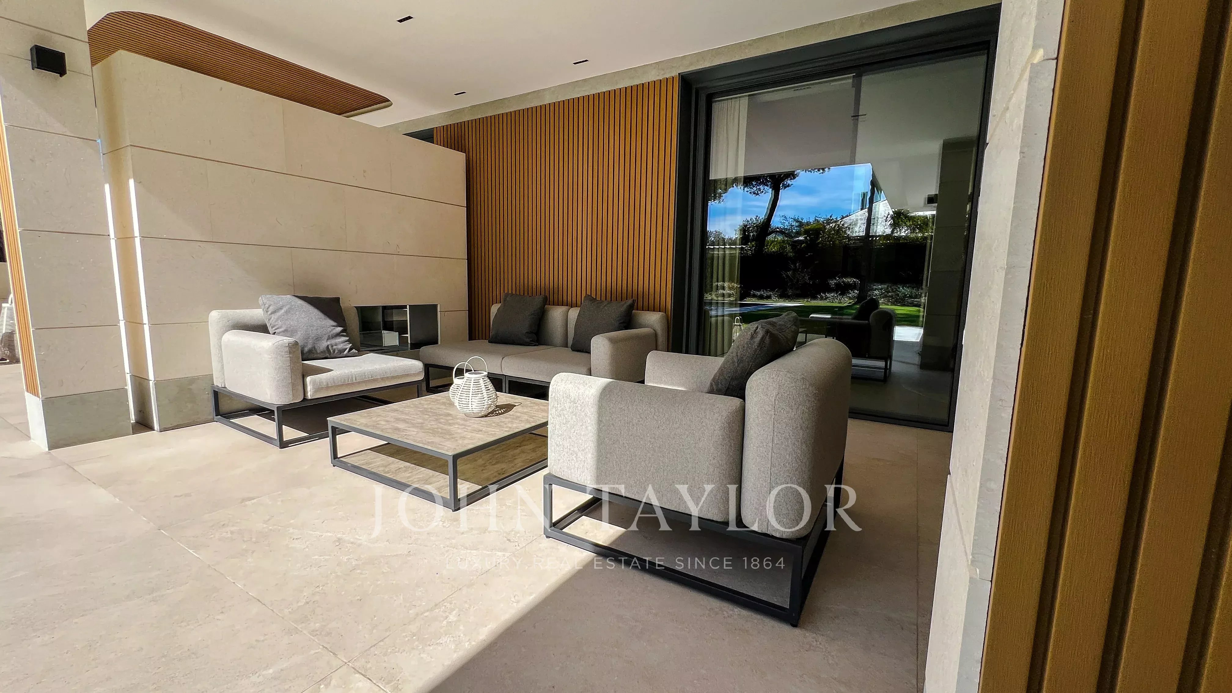 La planta superior dispone de tres dormitorios adicionales, dos de ellos en suite con vestidor y todos con acceso a terrazas con vistas al jardín.