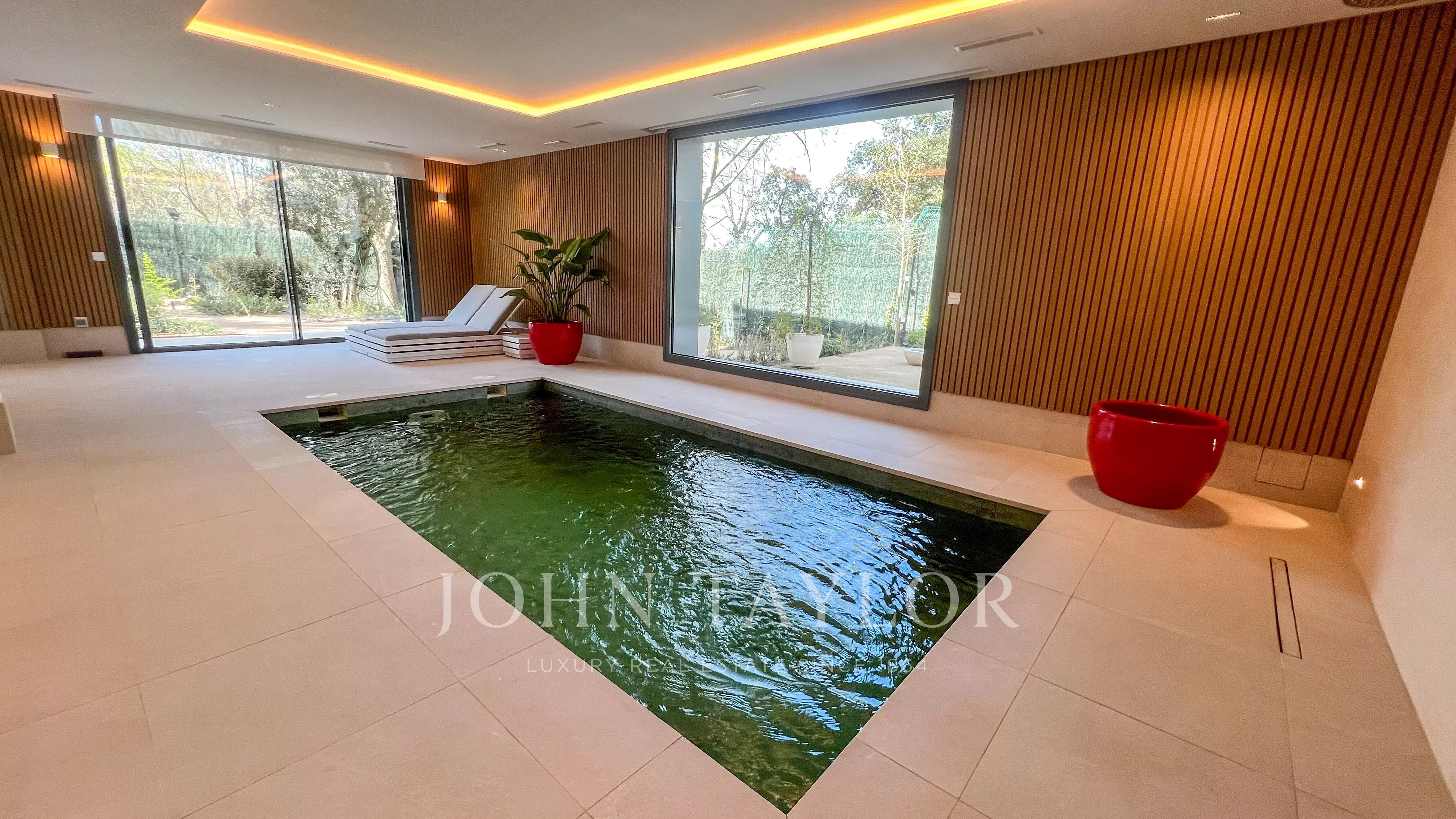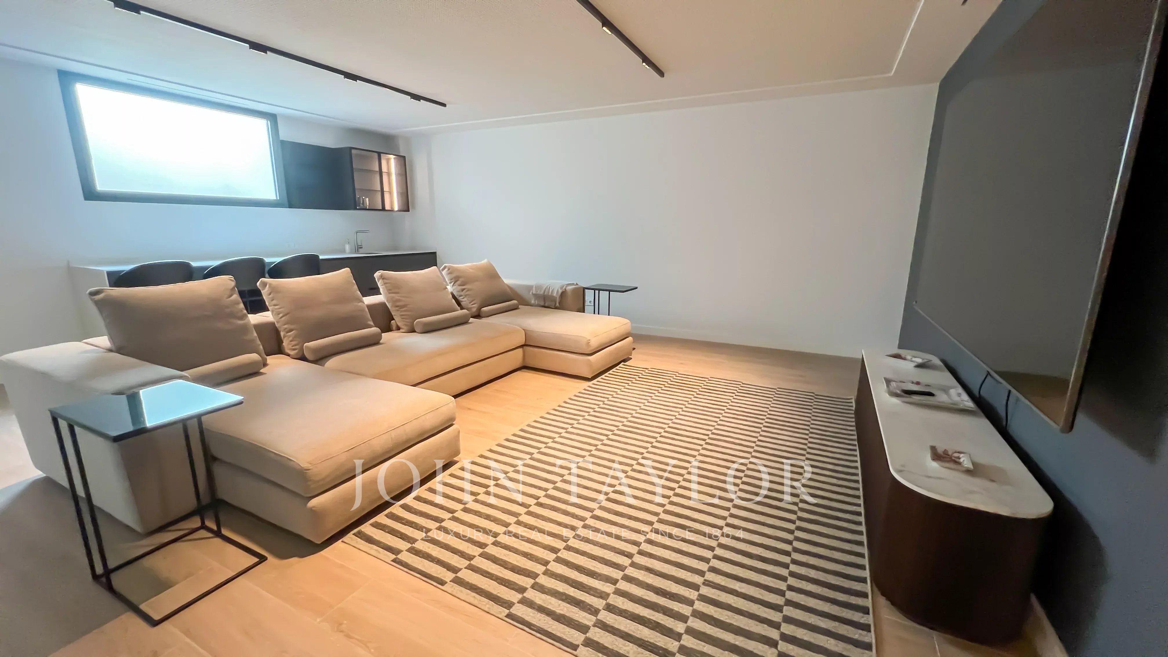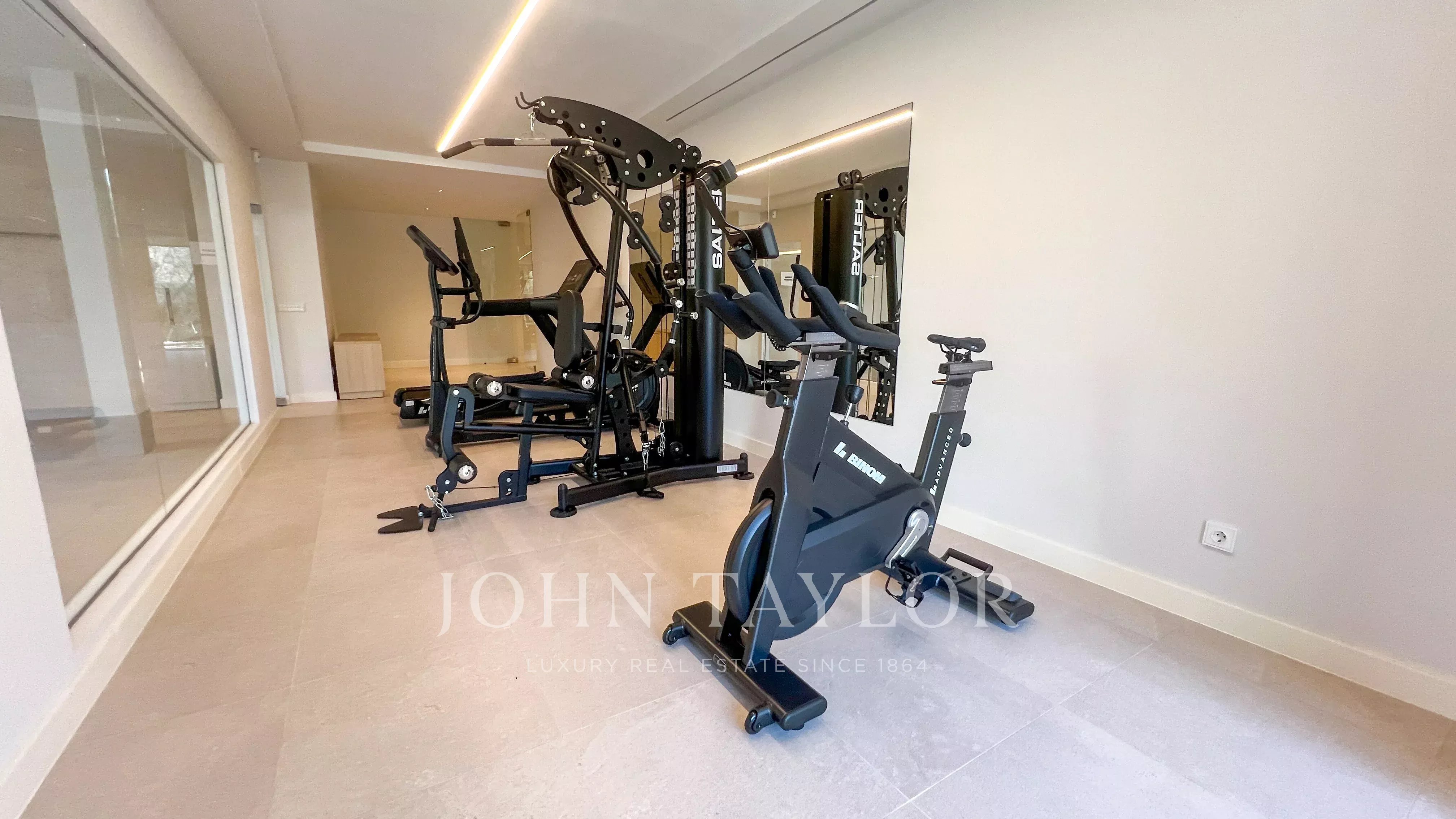 El nivel inferior está destinado al ocio y bienestar, con sala de cine, piscina interior con gimnasio, sauna, sala de masajes, bodega, trastero y garaje con preinstalación para cargador eléctrico.