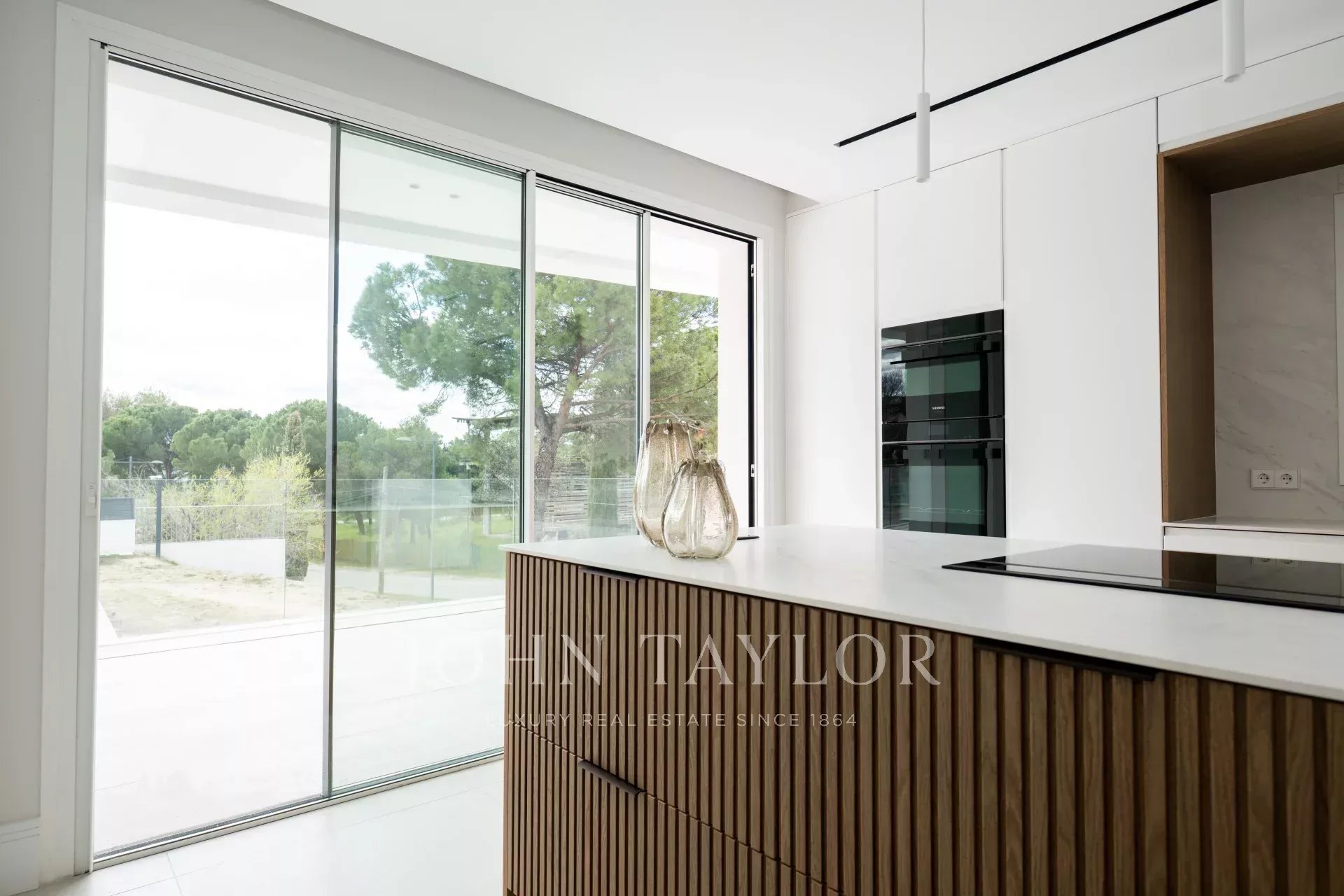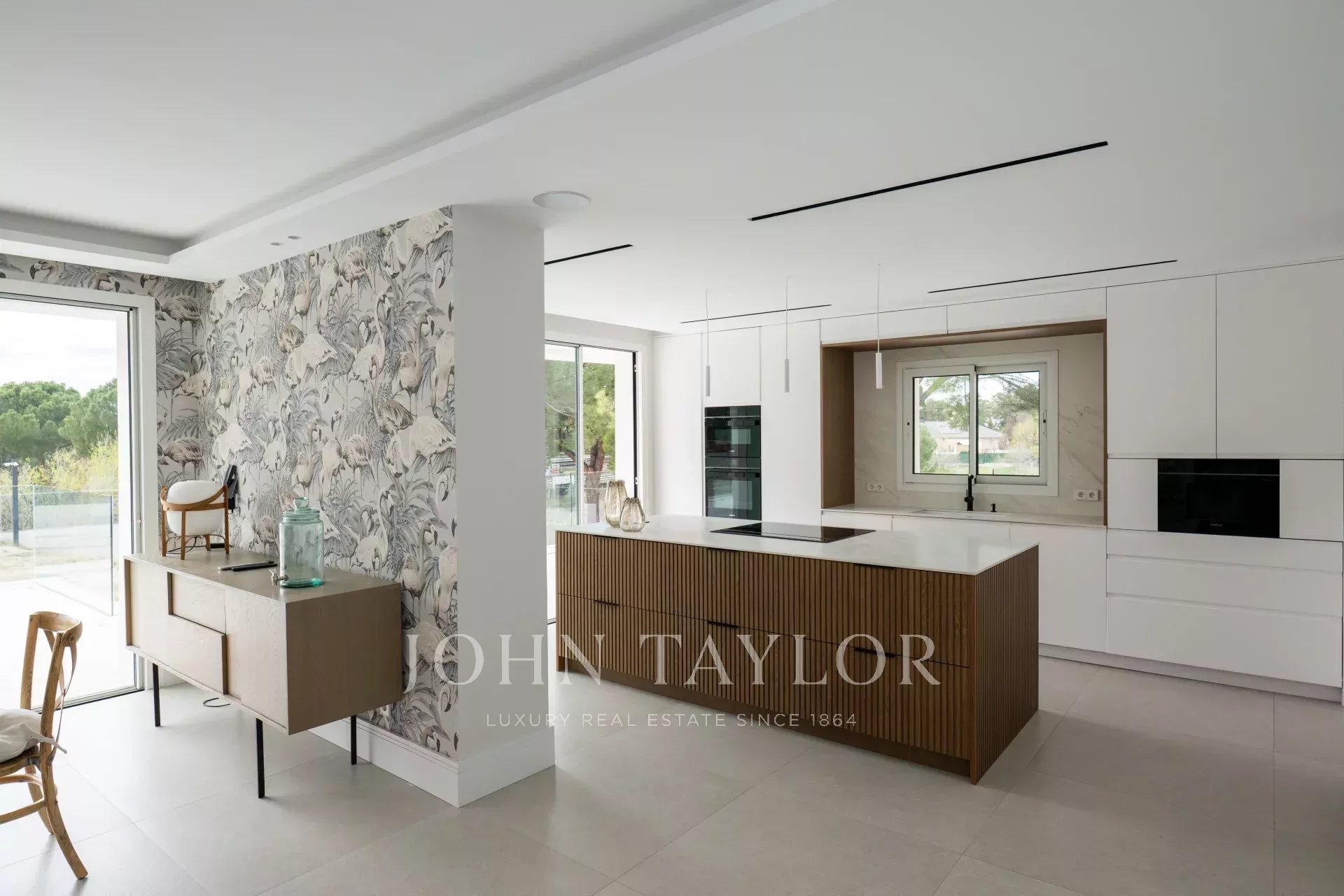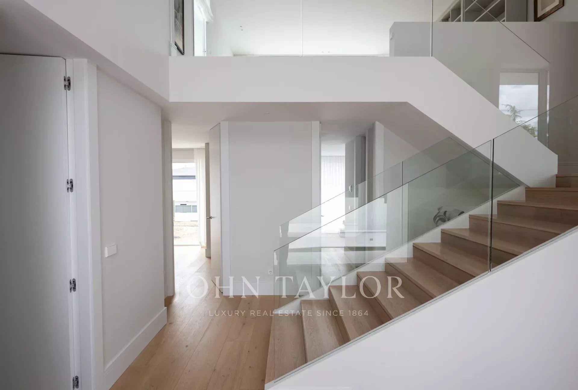 La vivienda, de 1679m2 construidos en total, se erige como un homenaje a la luz. El acceso principal es una preciosa escalinata que desemboca en una preciosa puerta de entrada de grandes dimensiones. El recibidor, con dos inmensos ventanales de una pieza, ilumina toda la planta principal de la vivienda, y nos conecta con una salón comedor a dos alturas, de grandes dimensiones. Junto al comedor, la cocina, de altísima gama y domotizada, cuenta con doble frigorífico, una gran isla central, acceso a una gran terraza exterior y una zona de office perfecta para las comidas de diario de una familia. Además, se puede acceder a la zona de servicio, que cuenta con un amplio dormitorio con baño.