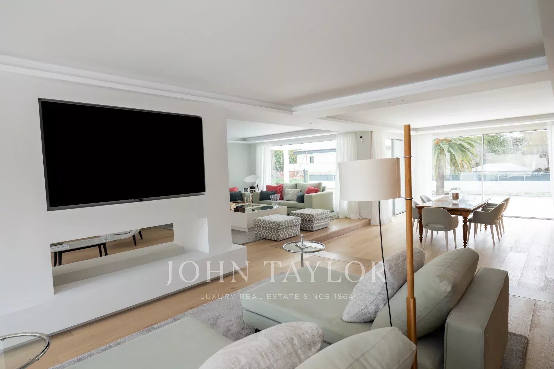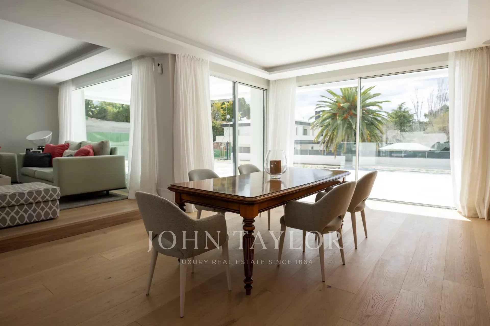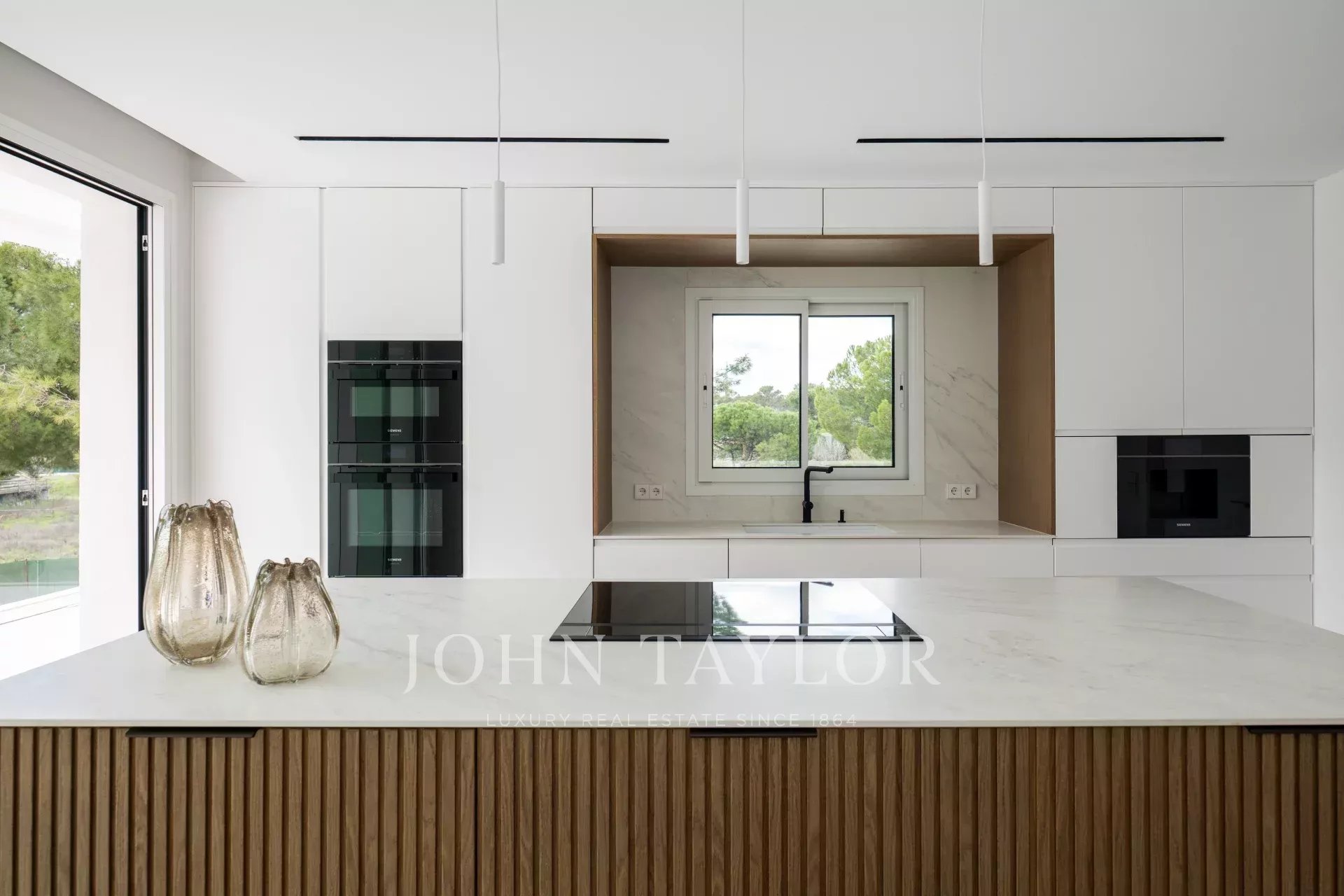 La vivienda, de 1679m2 construidos en total, se erige como un homenaje a la luz. El acceso principal es una preciosa escalinata que desemboca en una preciosa puerta de entrada de grandes dimensiones. El recibidor, con dos inmensos ventanales de una pieza, ilumina toda la planta principal de la vivienda, y nos conecta con una salón comedor a dos alturas, de grandes dimensiones. Junto al comedor, la cocina, de altísima gama y domotizada, cuenta con doble frigorífico, una gran isla central, acceso a una gran terraza exterior y una zona de office perfecta para las comidas de diario de una familia. Además, se puede acceder a la zona de servicio, que cuenta con un amplio dormitorio con baño.