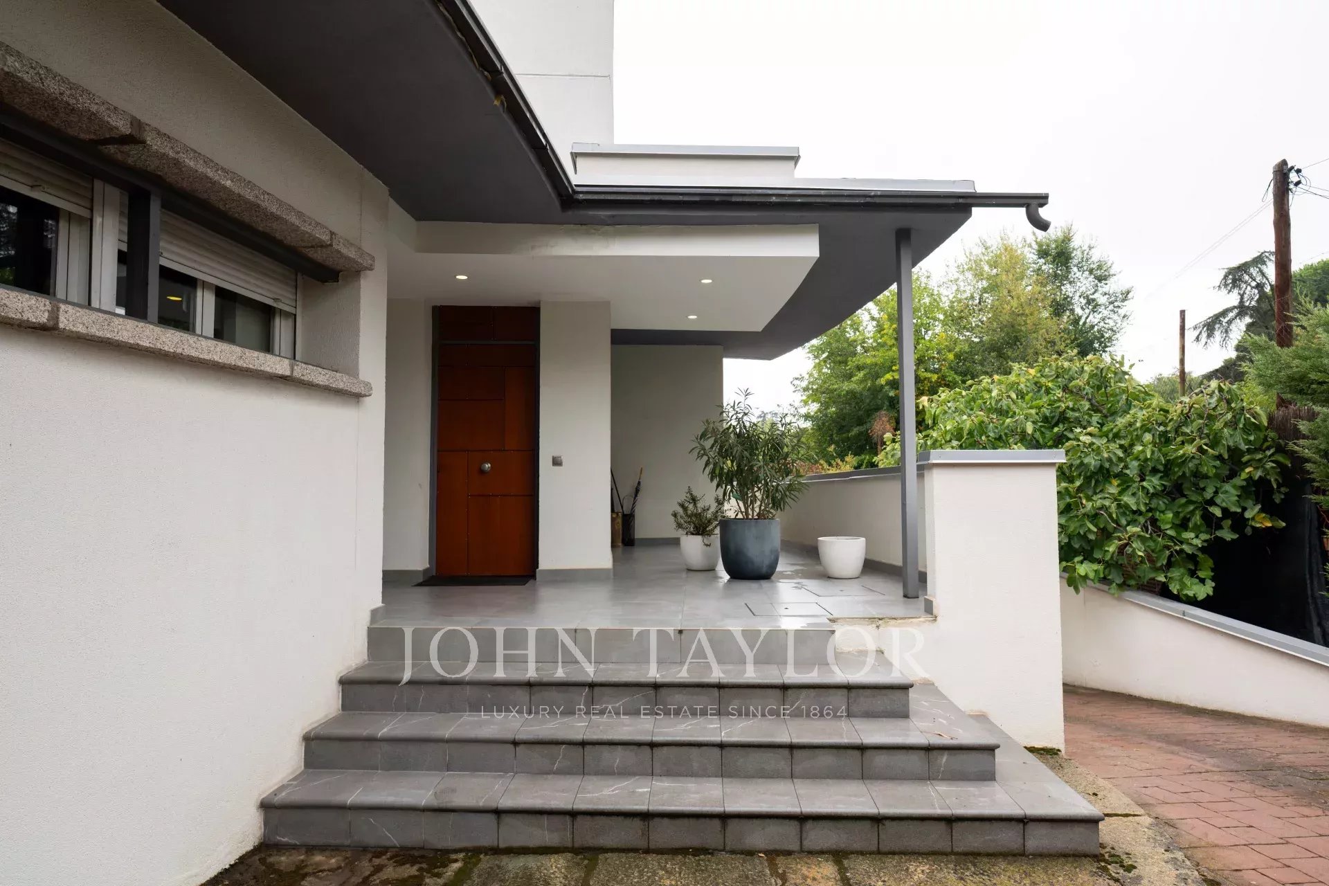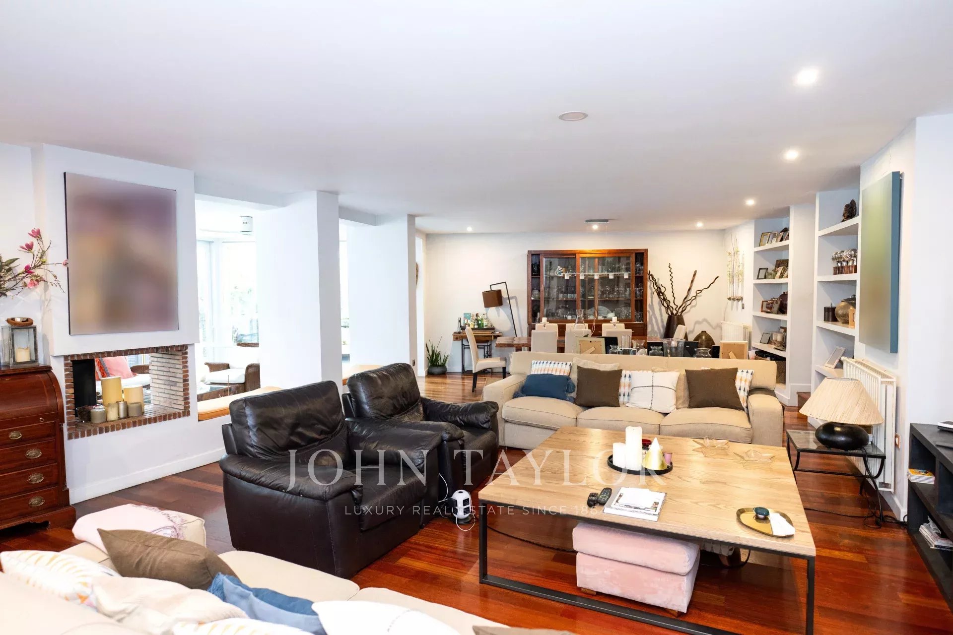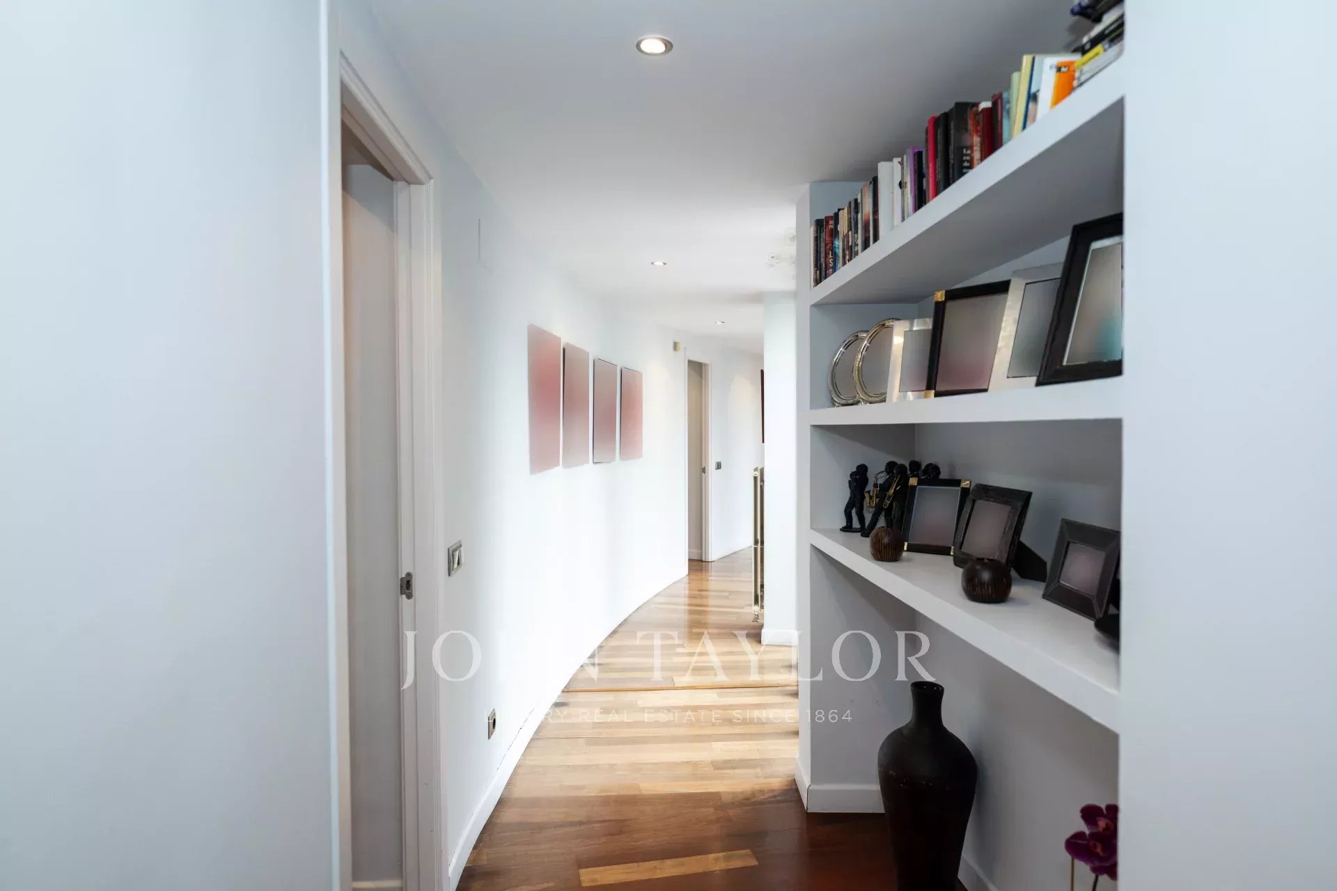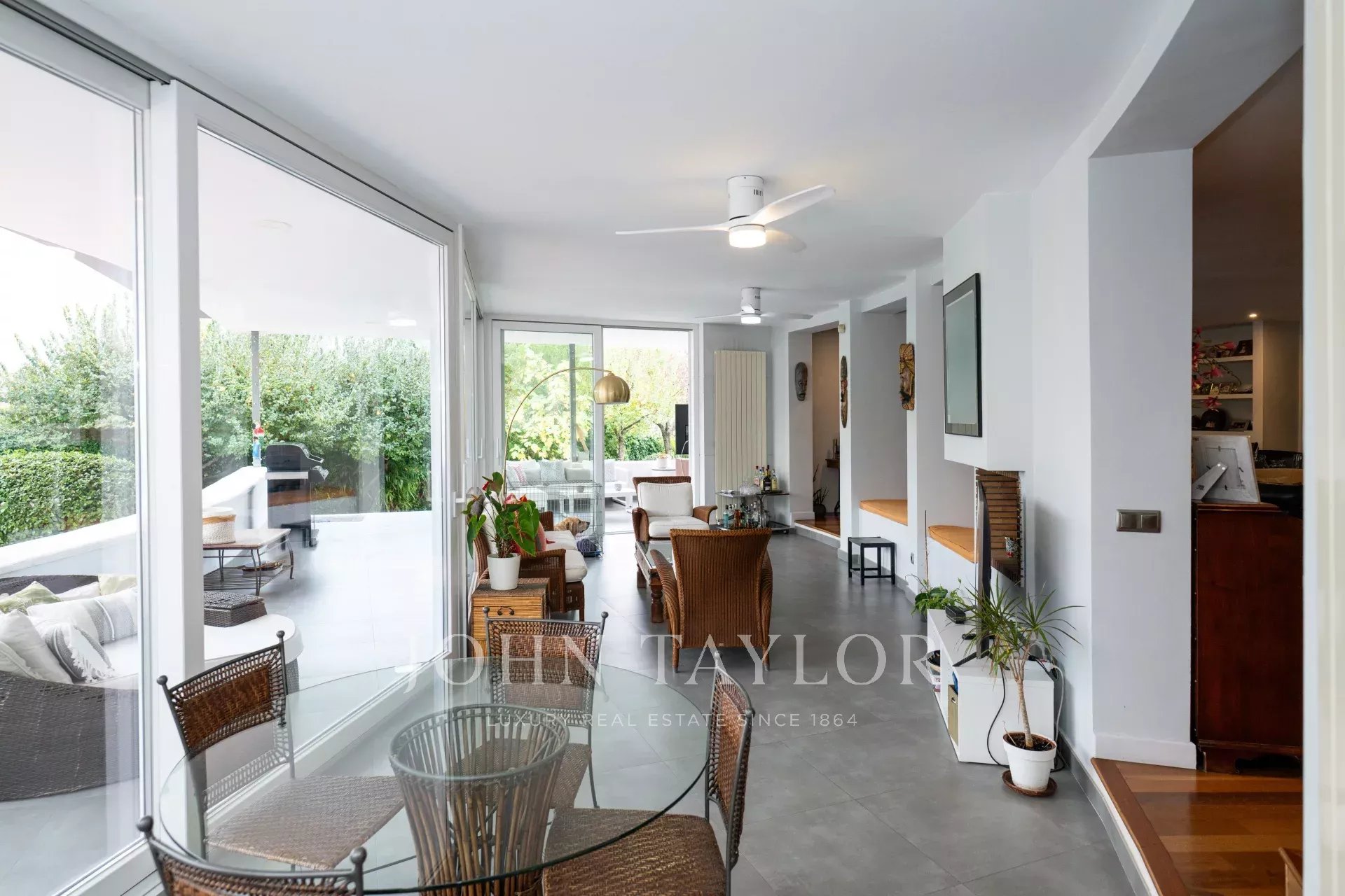 Desde el elegante hall de entrada, se accede a un precioso salón-comedor, con acceso directo a la cocina, a 5 de los dormitorios y baños y a un gran porche semicircular y terraza con vistas al jardín que rodean toda la vivienda, creando una experiencia de vida interior-exterior sin interrupciones.