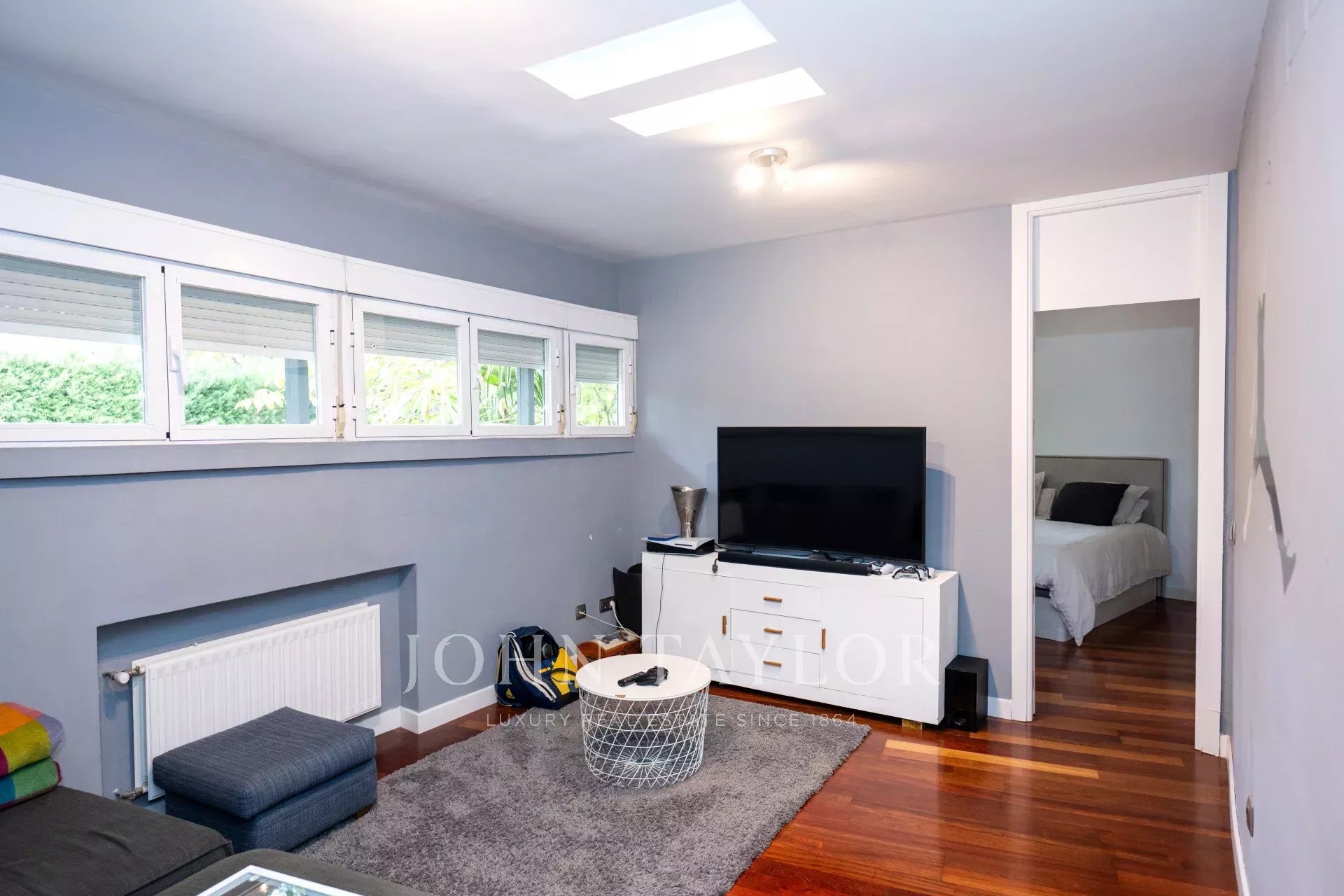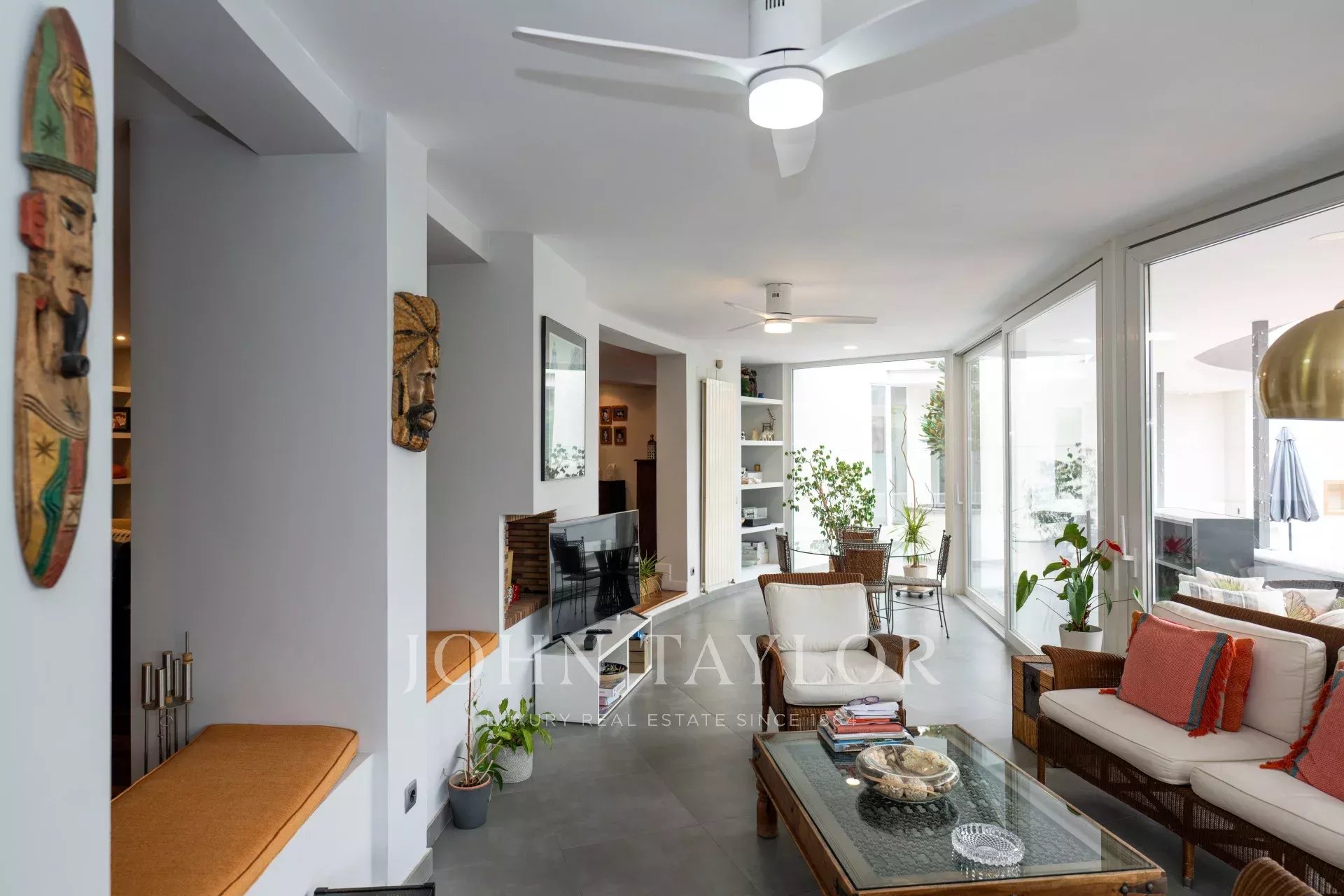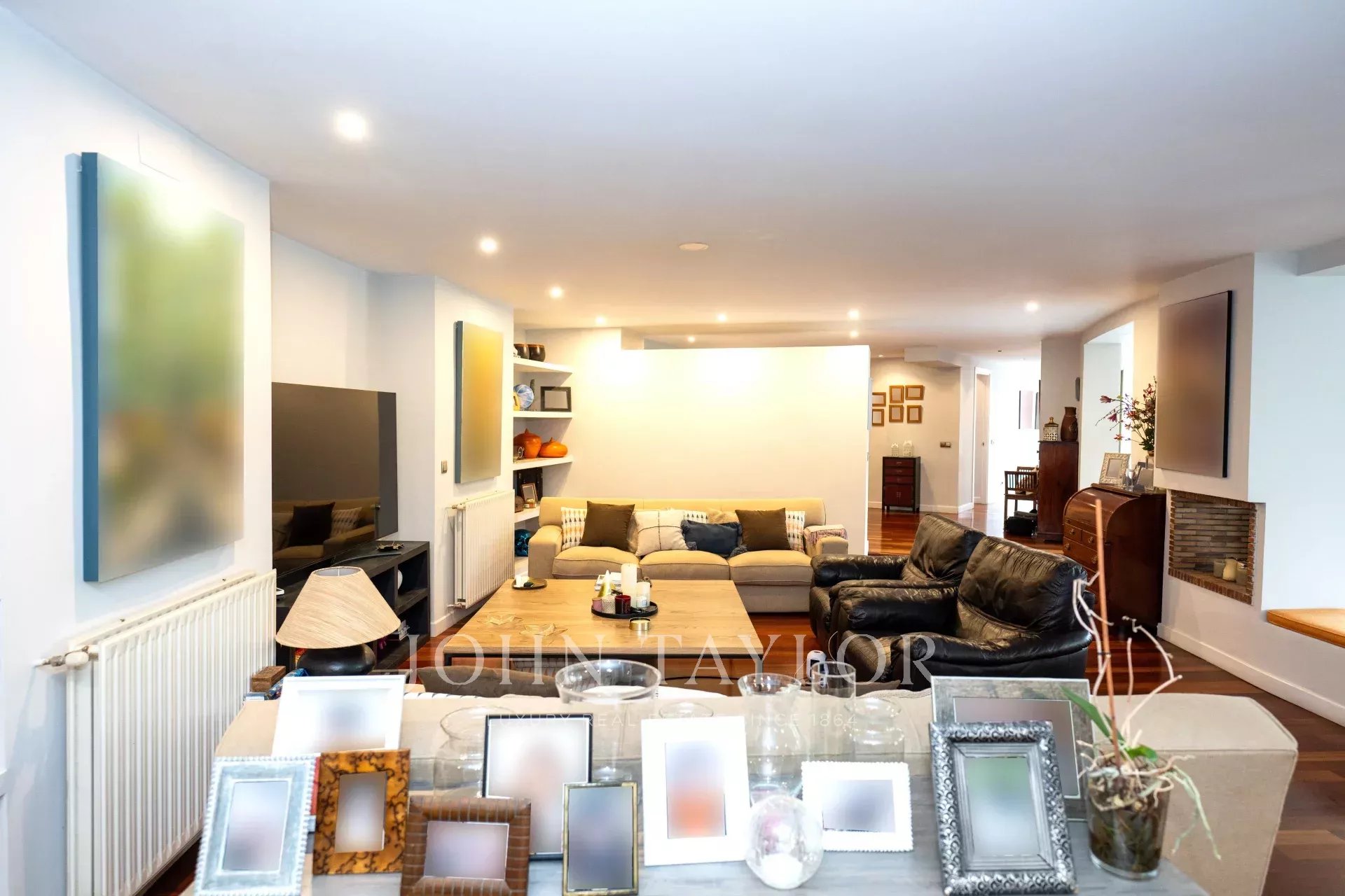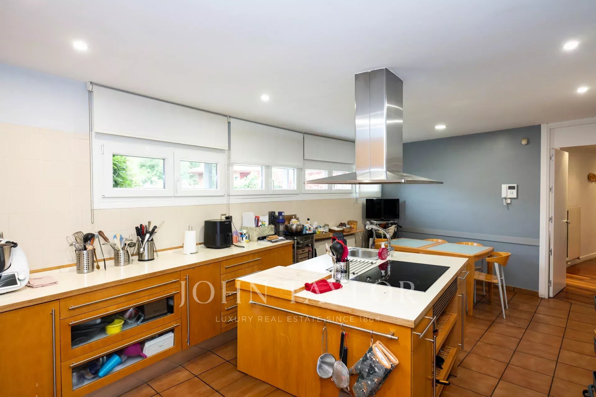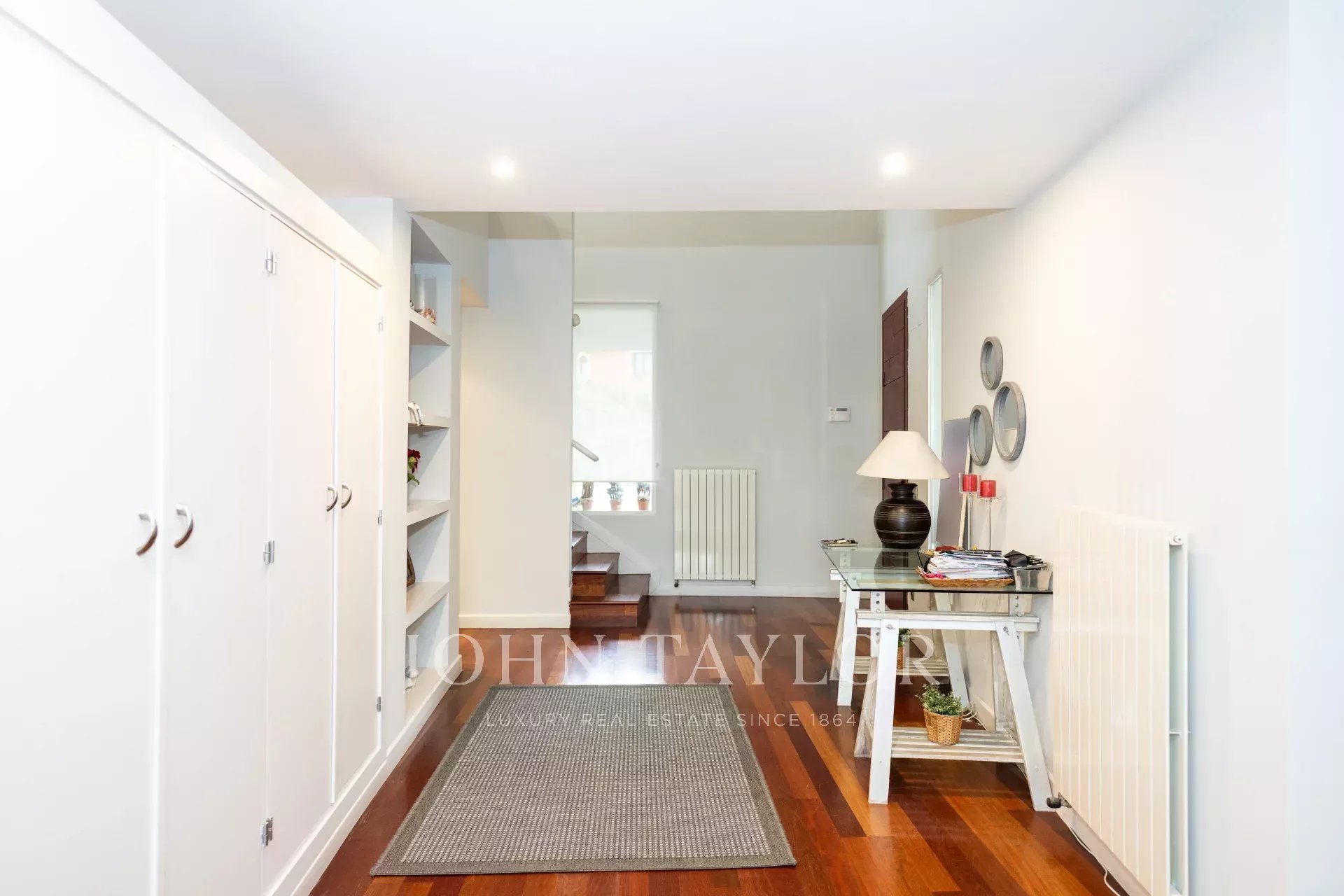 Desde el elegante hall de entrada, se accede a un precioso salón-comedor, con acceso directo a la cocina, a 5 de los dormitorios y baños y a un gran porche semicircular y terraza con vistas al jardín que rodean toda la vivienda, creando una experiencia de vida interior-exterior sin interrupciones.