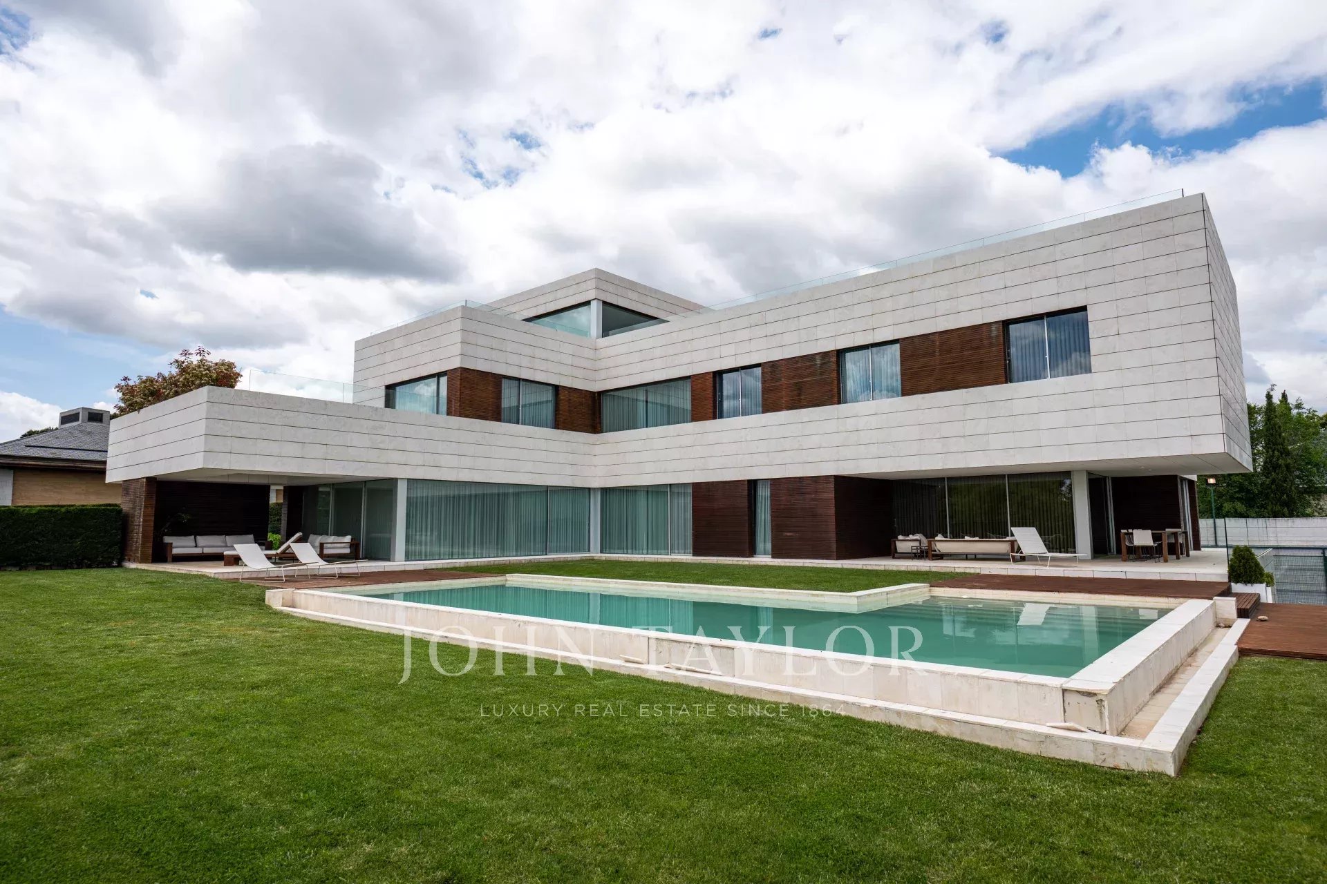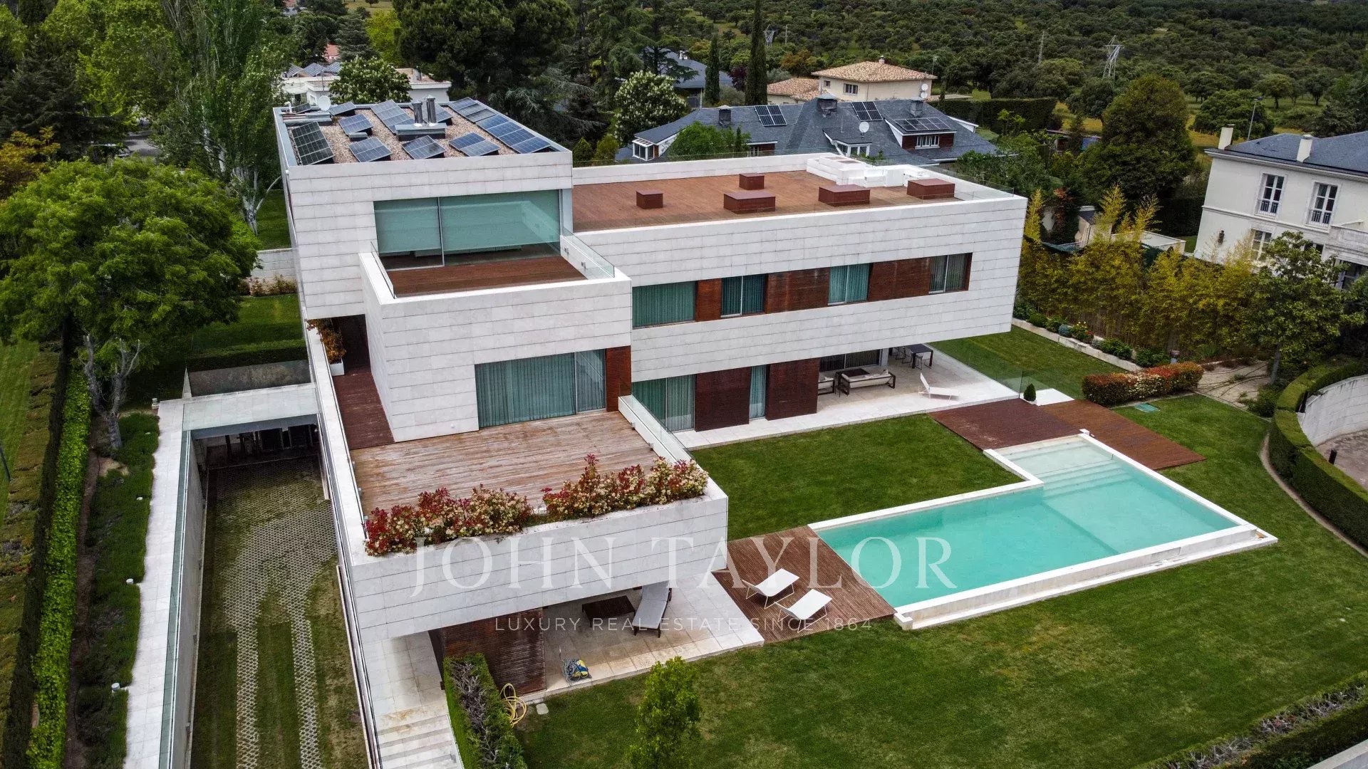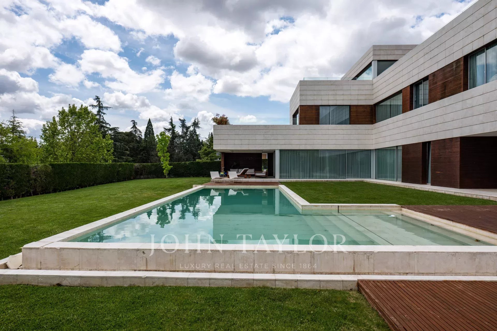 En una amplia parcela que garantiza privacidad y tranquilidad, esta vivienda se despliega en armonía con su entorno. Con líneas modernas y elegantes, sus espacios han sido concebidos para disfrutar de la luz, las vistas y el silencio. Desde los ventanales, se contempla la sierra madrileña, El Pardo, el Palacio de La Zarzuela y las emblemáticas Torres de Madrid. Una panorámica que cambia con las estaciones y regala momentos irrepetibles cada día.
