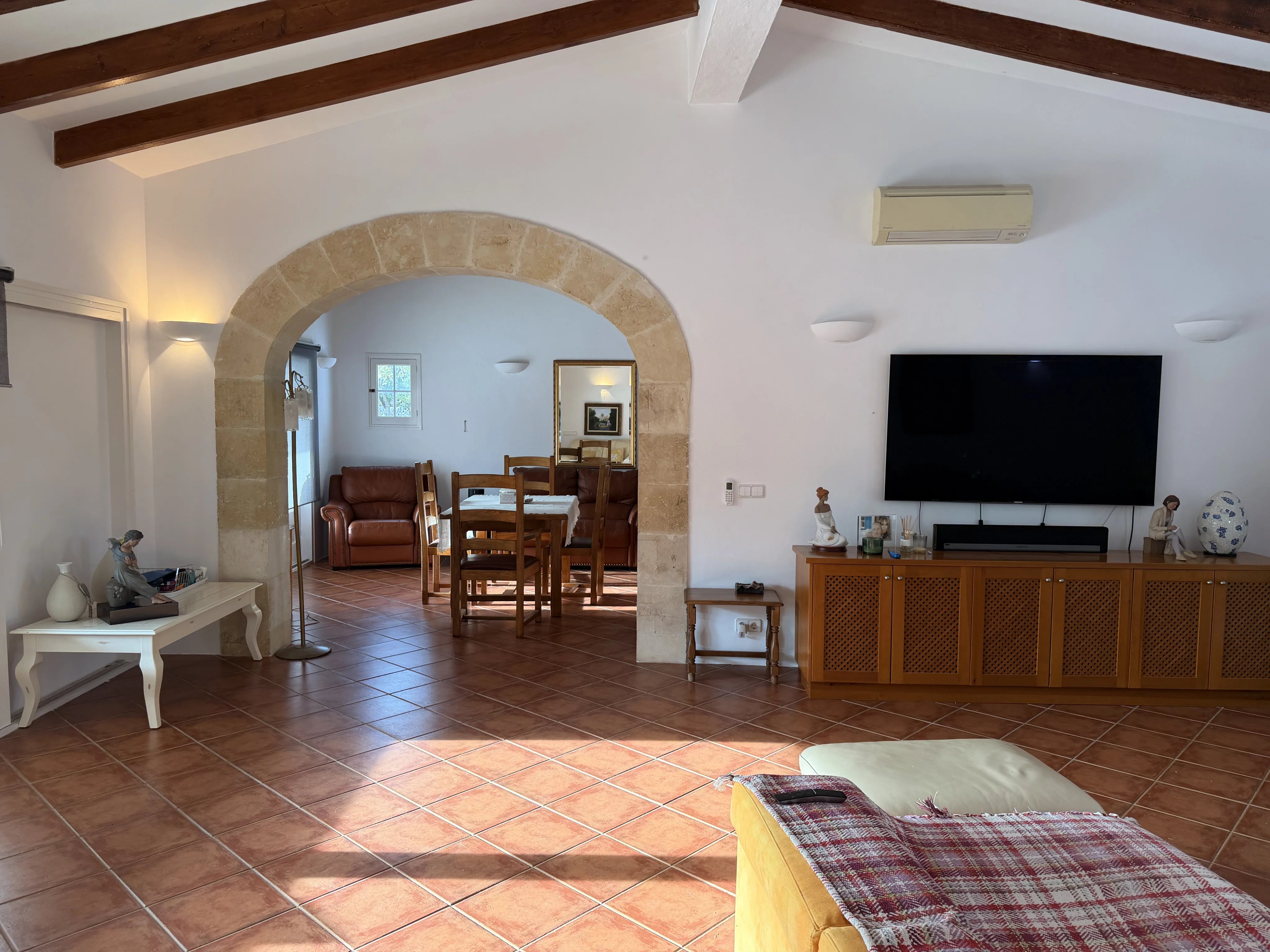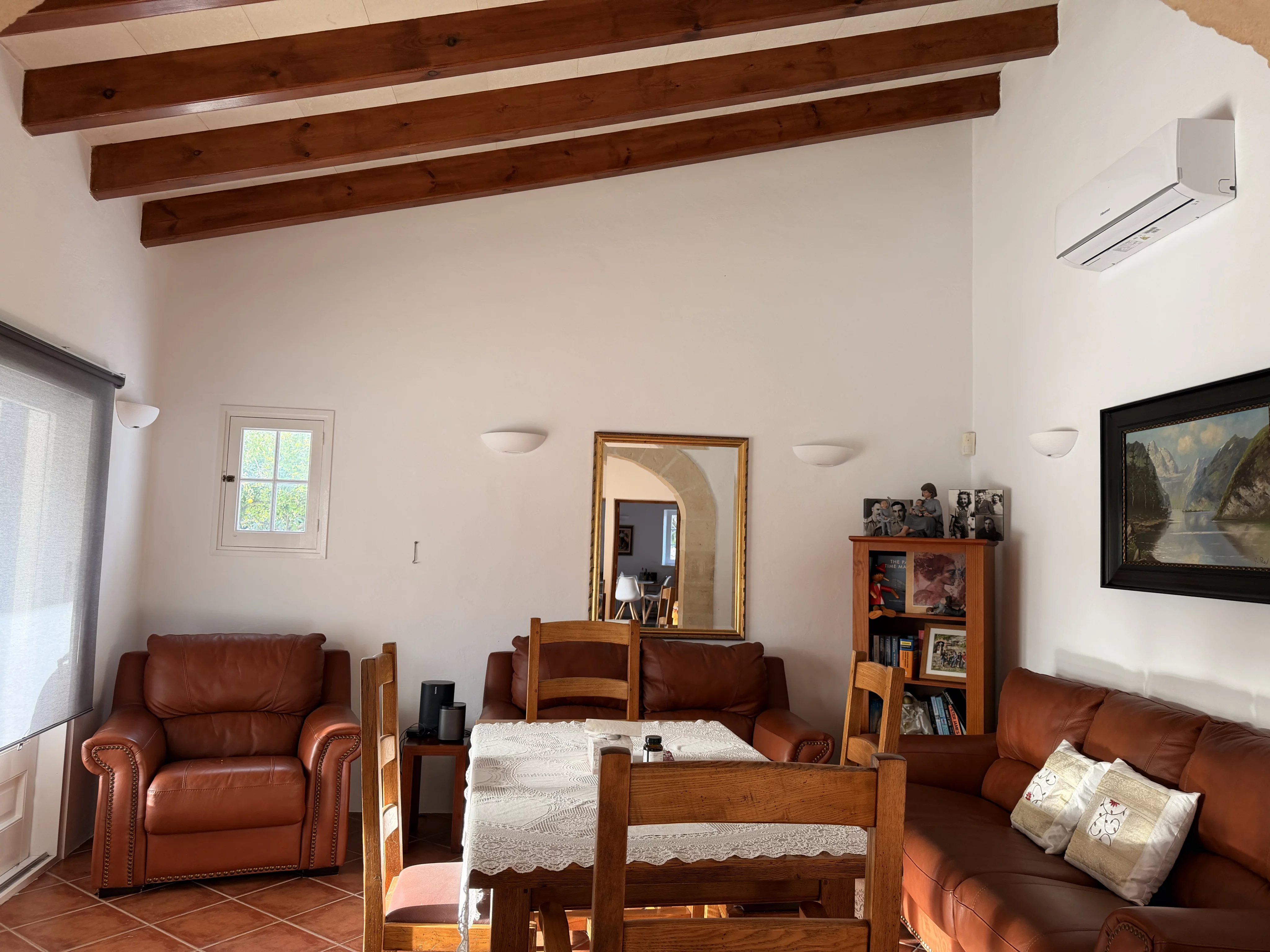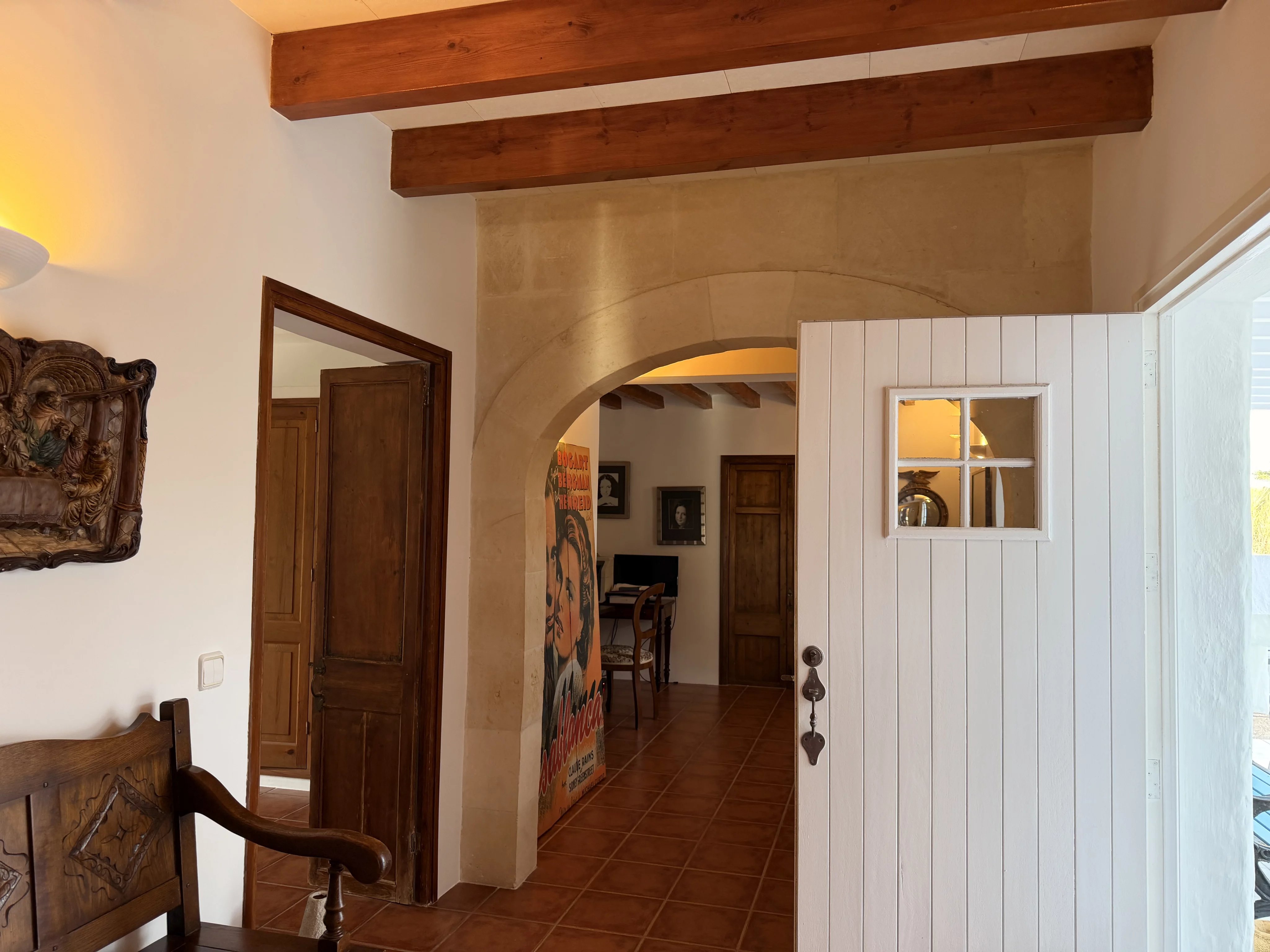 La zona de día ofrece un amplio y luminoso salón-comedor, que se abre a una cocina completamente renovada y equipada. Desde aquí, se accede a la parte posterior de la casa, donde una gran terraza exterior acoge la piscina, una ducha al aire libre y un entorno perfecto para disfrutar de la tranquilidad del campo menorquín.