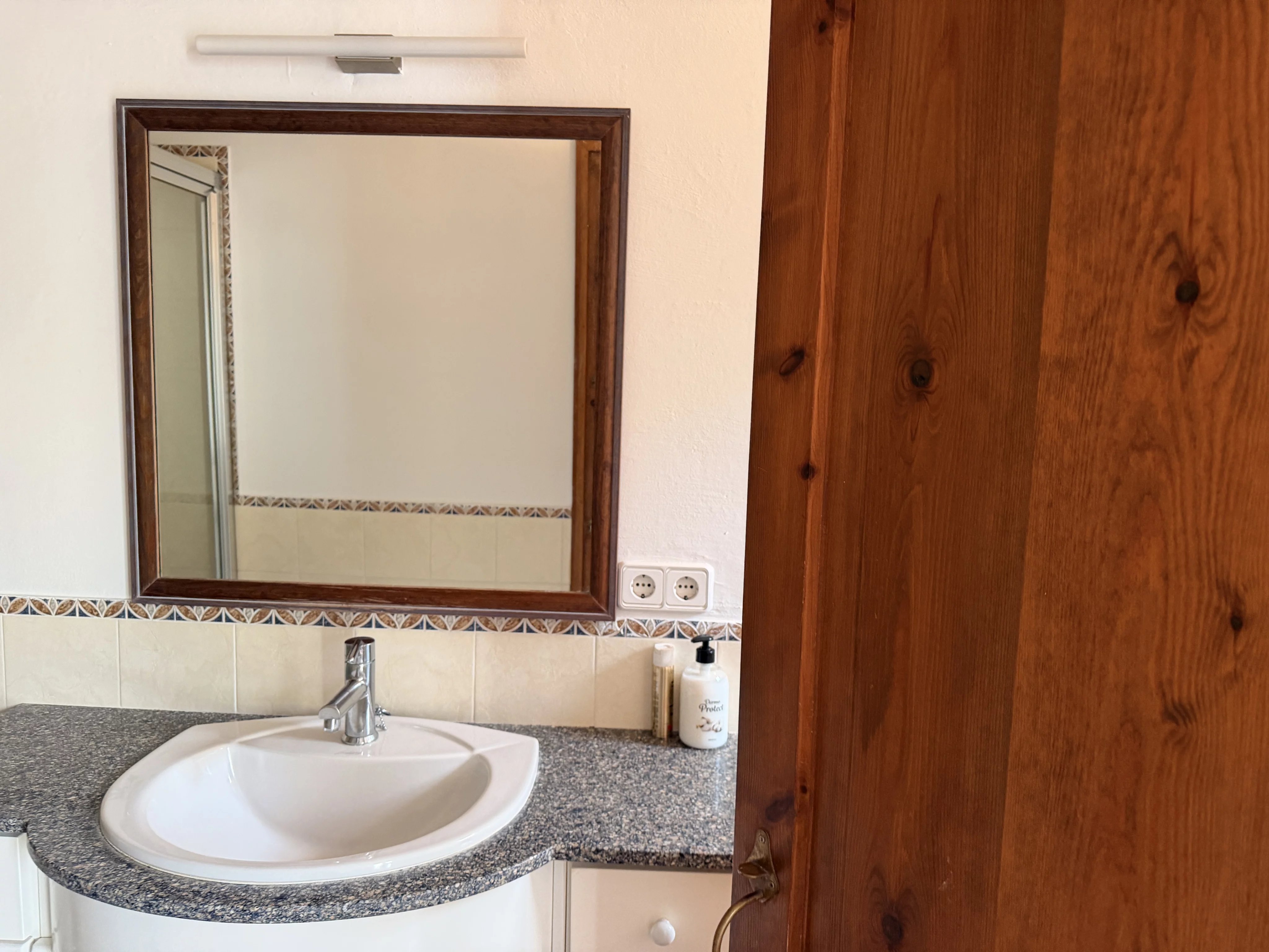 Al acceder a la finca, un amplio jardín da la bienvenida, junto con una cómoda zona de aparcamiento. La vivienda principal se desarrolla principalmente en planta baja. A través de un encantador porche menorquín, se accede al recibidor que distribuye dos dormitorios dobles con dos baños completos. Unas escaleras conducen a la suite principal, que disfruta de una terraza privada con vistas al entorno natural, dos vestidores y un baño completo.