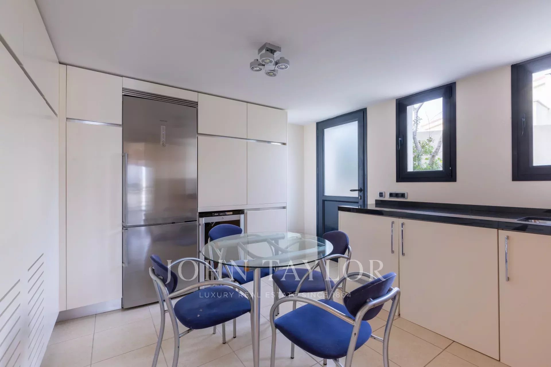 Su diseño elegante, con predominio del blanco, potencia la sensación de amplitud y claridad en todos los espacios. La vivienda se distribuye en dos plantas más un solárium. En la planta principal, un amplio y luminoso salón con grandes cristaleras se abre directamente a la terraza y la piscina, creando un ambiente fluido entre interior y exterior.