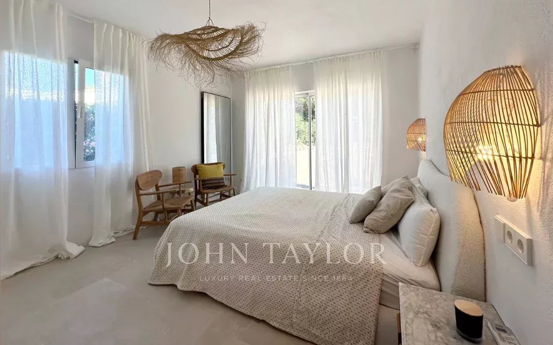 El interior es luminoso y espacioso, con una cocina abierta, comedor y un salón con chimenea. Además, dispone de un lavadero y despensa. Consta de cuatro dormitorios y dos baños. El dormitorio principal, con techos altos y vigas de madera, incluye un baño privado y acceso al exterior. Los otros dos dormitorios son amplios, y el cuarto baño es familiar. También hay aire acondicionado y acceso a una terraza en la azotea.