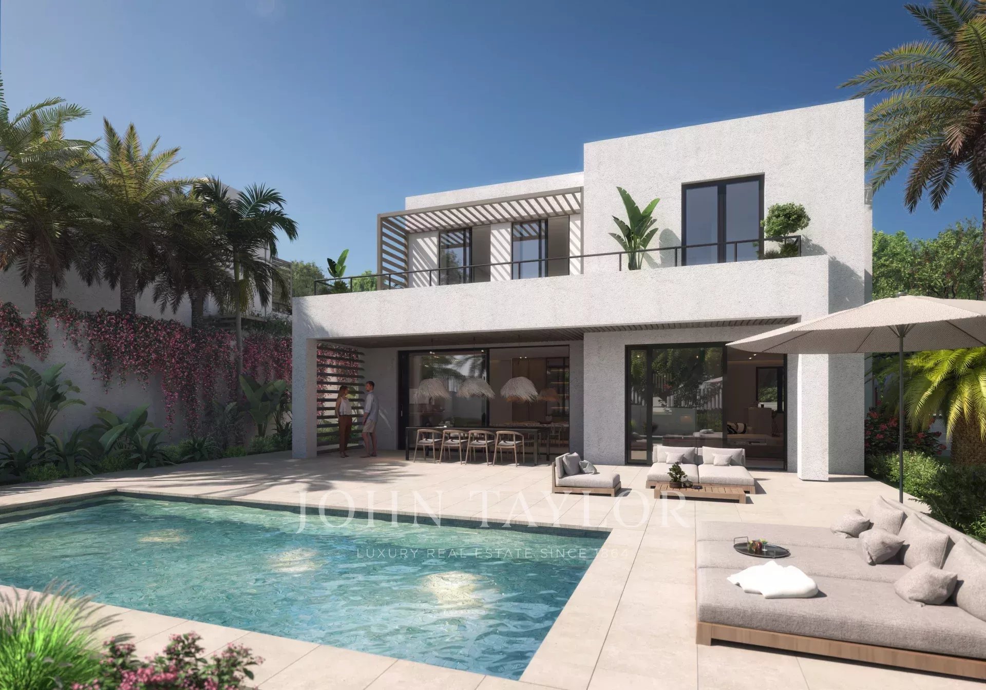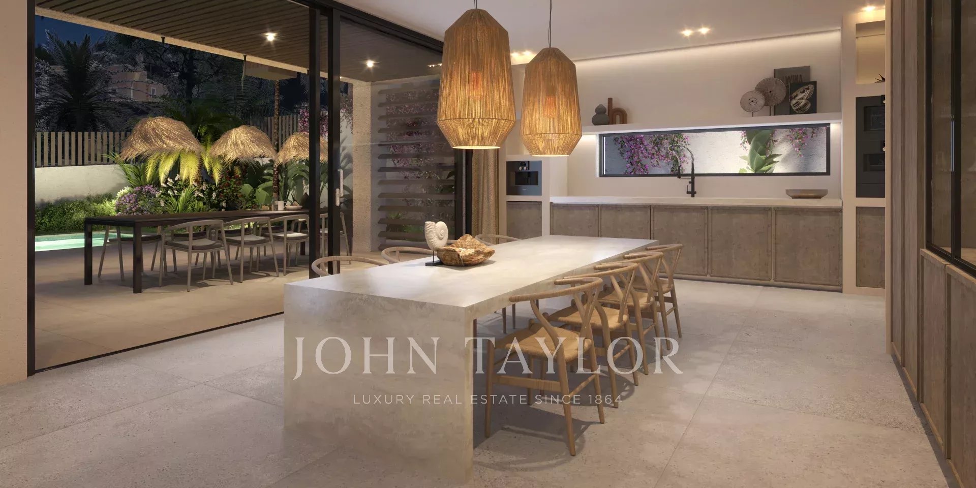 El exterior ha sido diseñado como un oasis privado con jardín, piscina y zona chill-out, con posibilidad de incluir cocina exterior, barbacoa o chimenea. La parcela incluye tres plazas de aparcamiento.