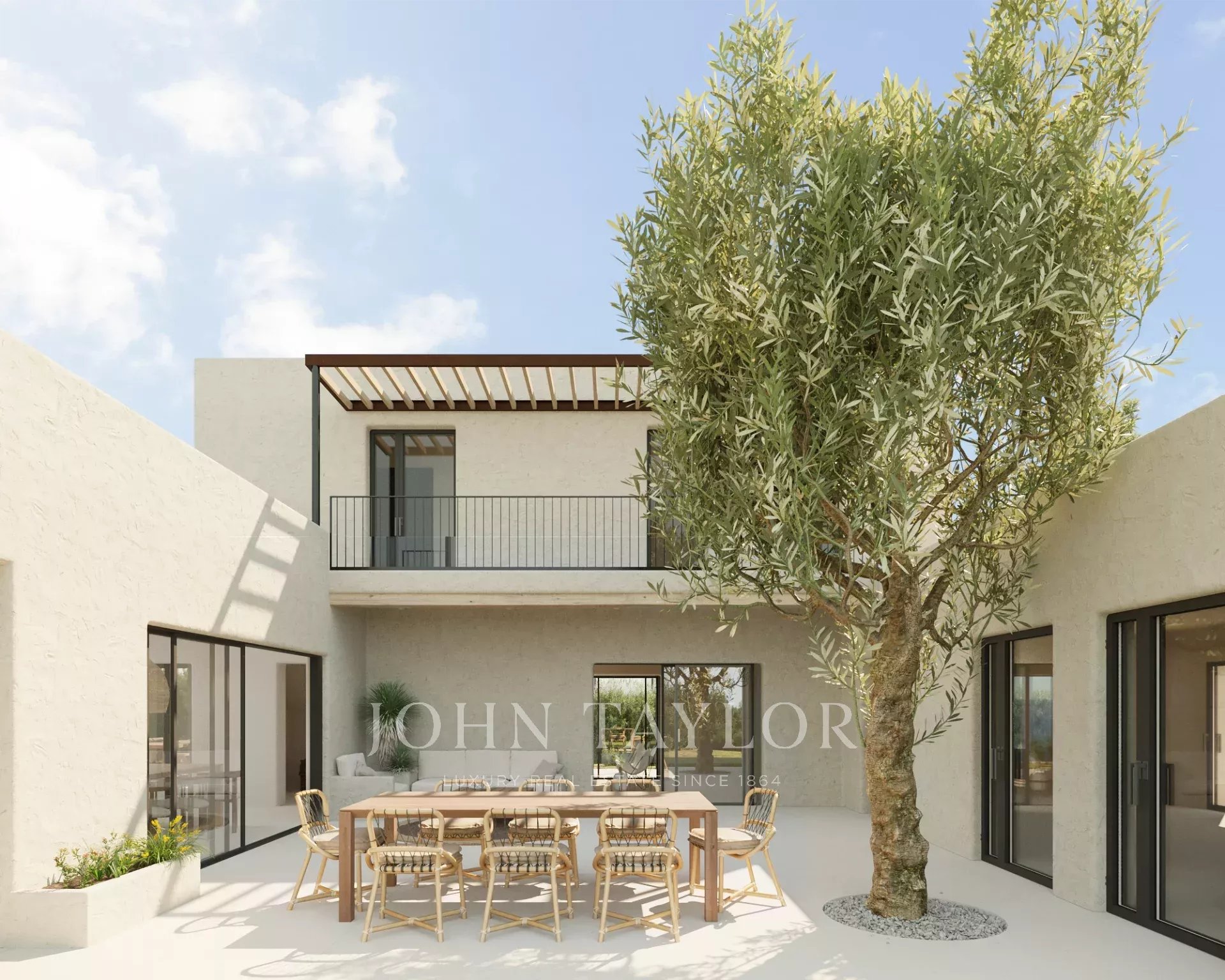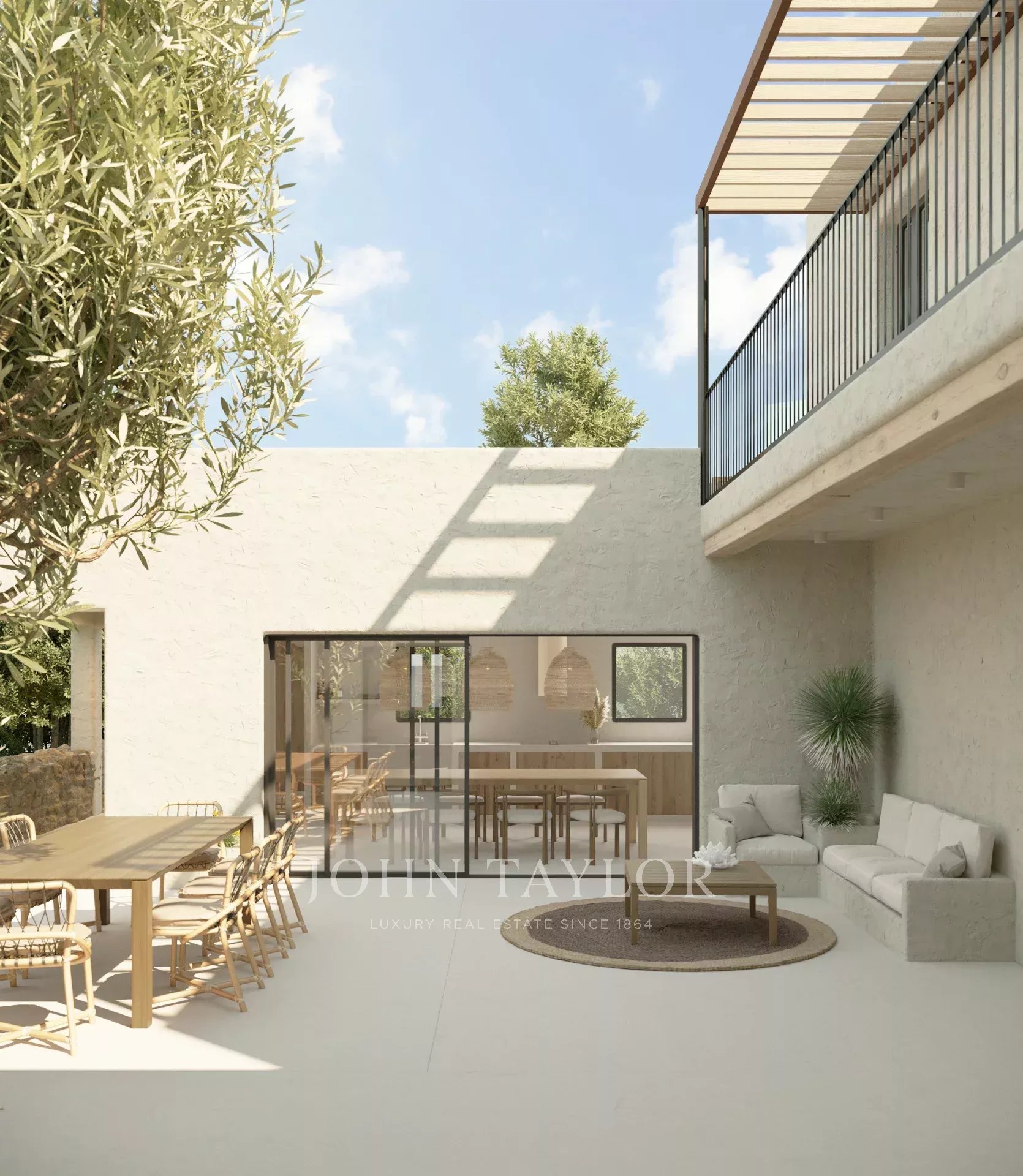 La planta baja de 157,35m2 cuenta con un gran salón con chimenea, una cocina independiente, tres dormitorios y tres cuartos de baño. Todas las estancias dan a un gran patio central.