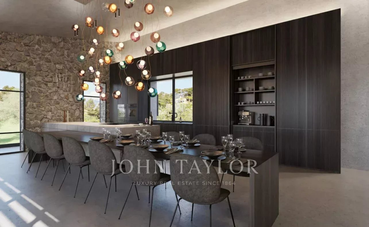 Desde el primer paso dentro del elegante recibidor, se revela un diseño arquitectónico que armoniza a la perfección los espacios interiores y exteriores. La distribución de concepto abierto conecta el salón principal, la cocina y el comedor con diversas terrazas cubiertas, ideales para disfrutar de cenas al aire libre, junto a una cocina exterior totalmente equipada. El exterior también alberga una gran piscina, un verdadero remanso de paz enmarcado por vistas panorámicas del paisaje circundante.