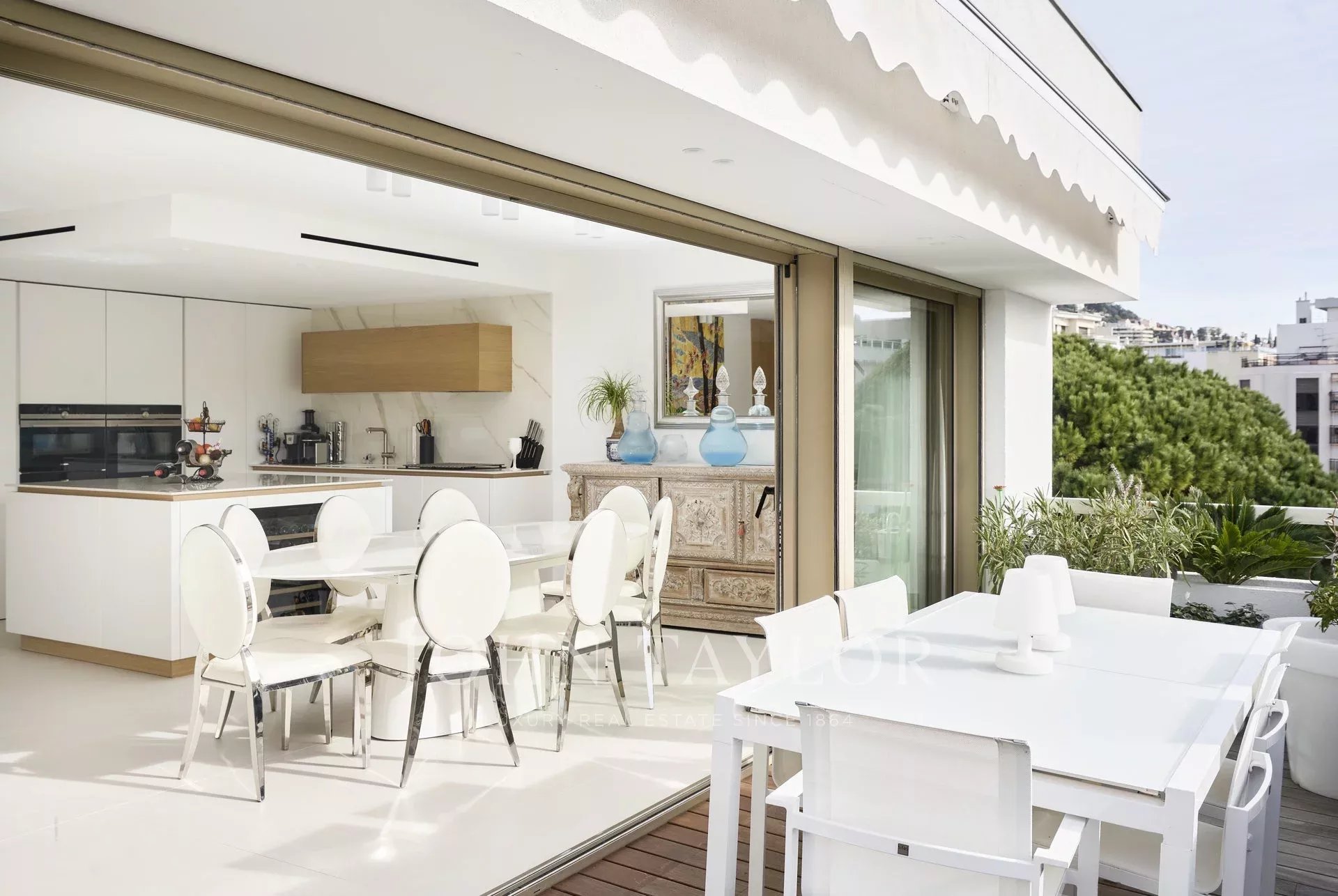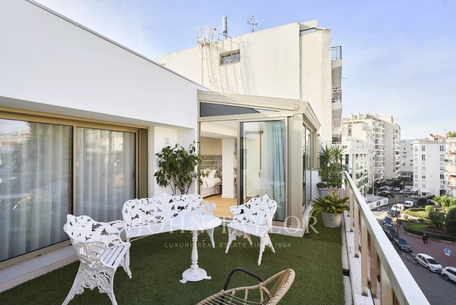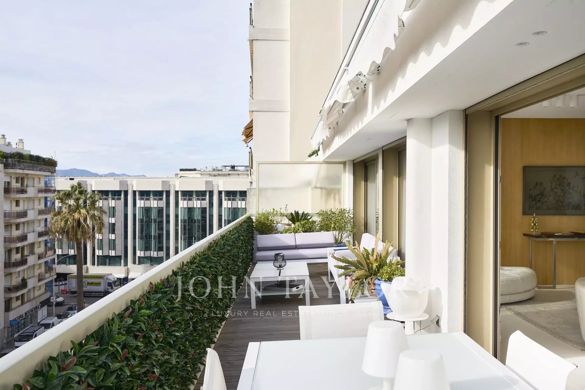 Piso contemporáneo de 165 m2 con aire acondicionado, orientado al sur, situado en el último piso (5º) de una residencia del centro de la ciudad, a pocos minutos a pie de las playas y del Palacio de Festivales.