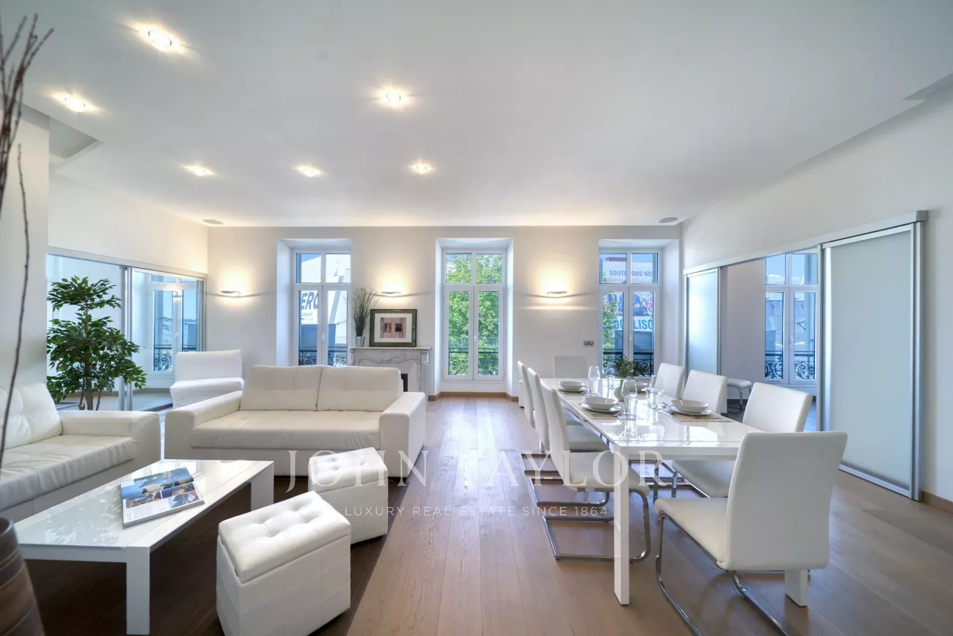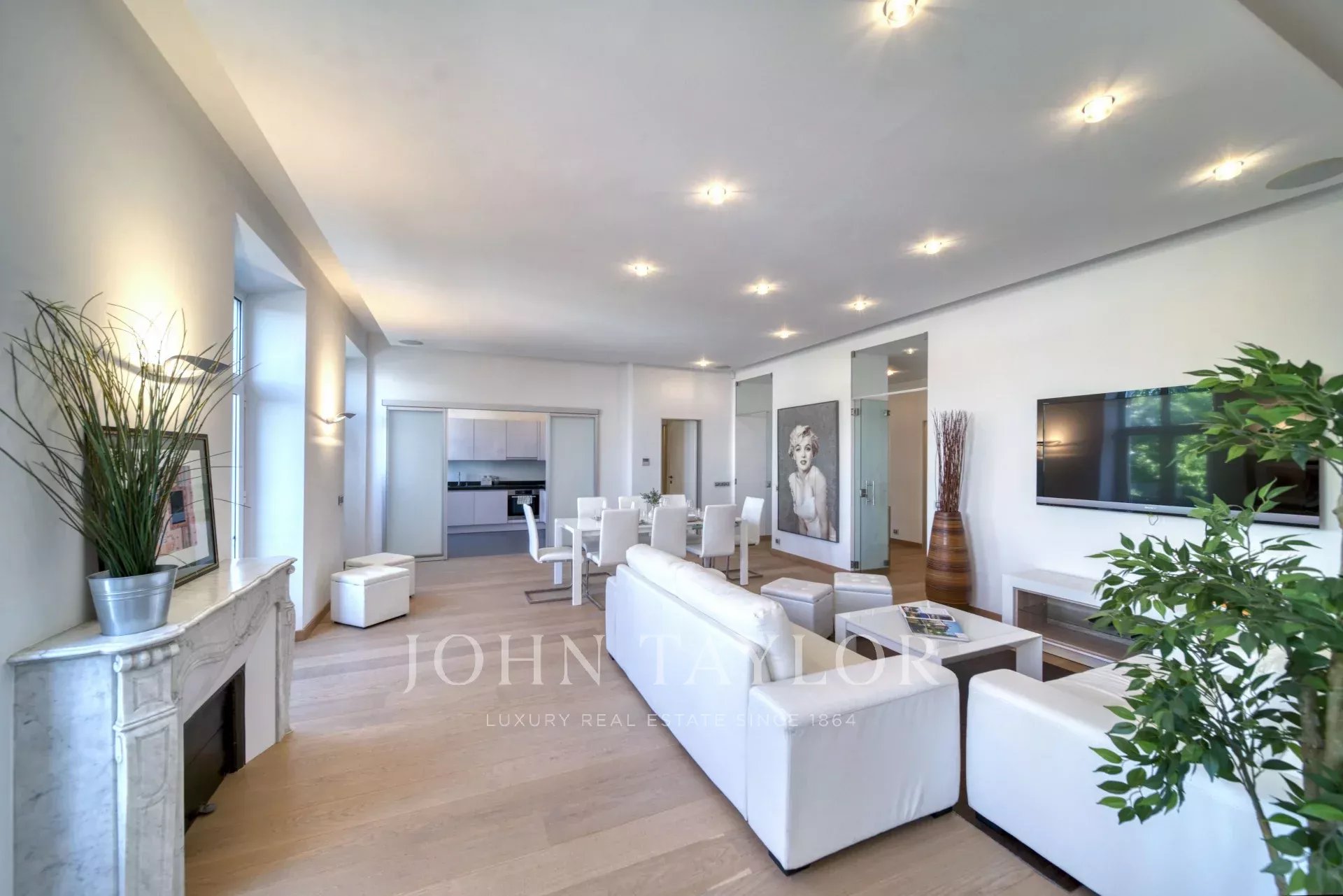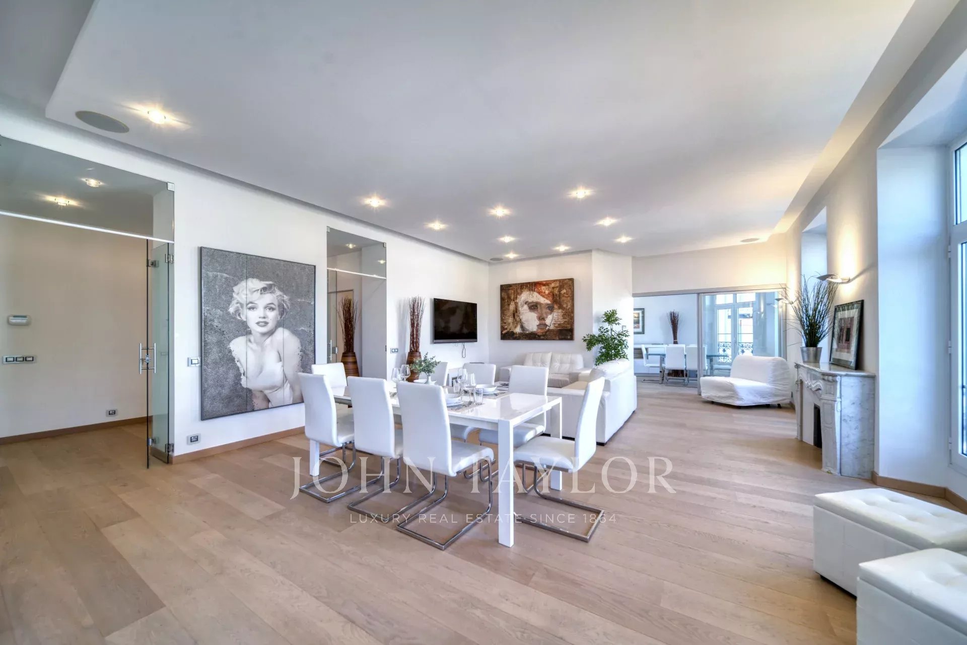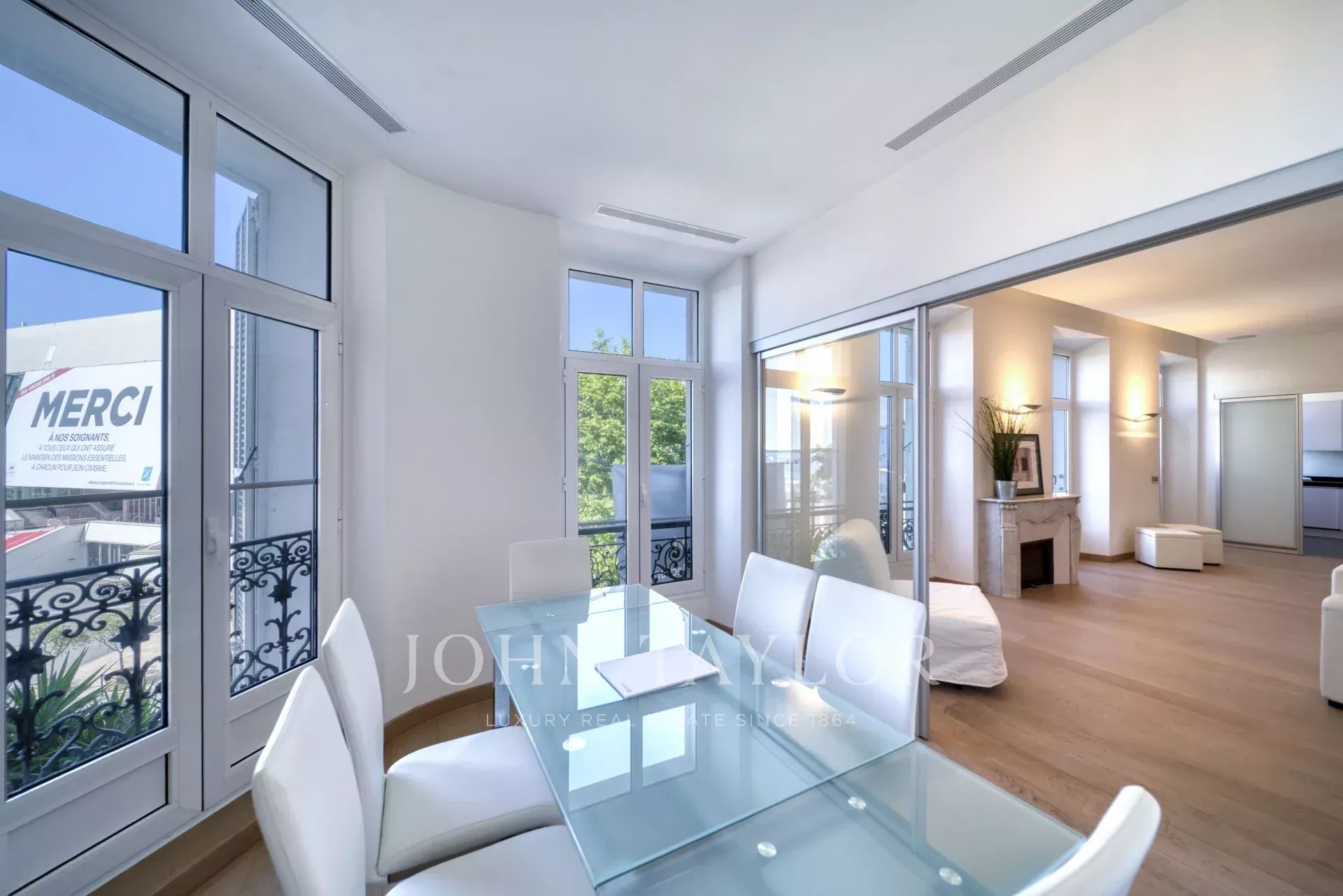 Frente al Palais des Festivals, una gran sala de recepción con salón, comedor y cocina americana equipada