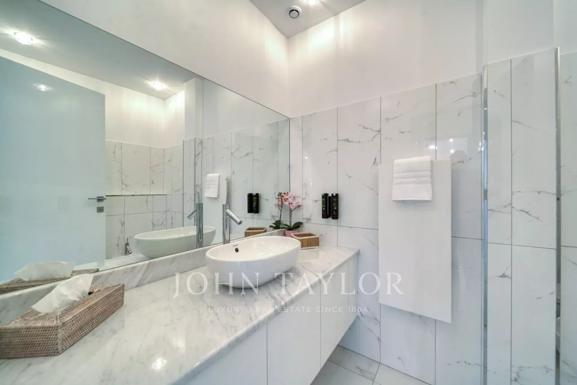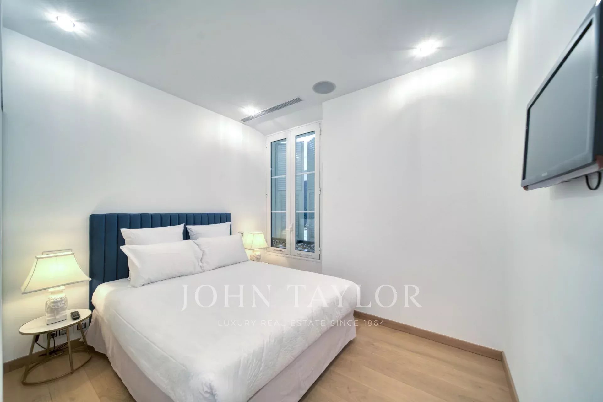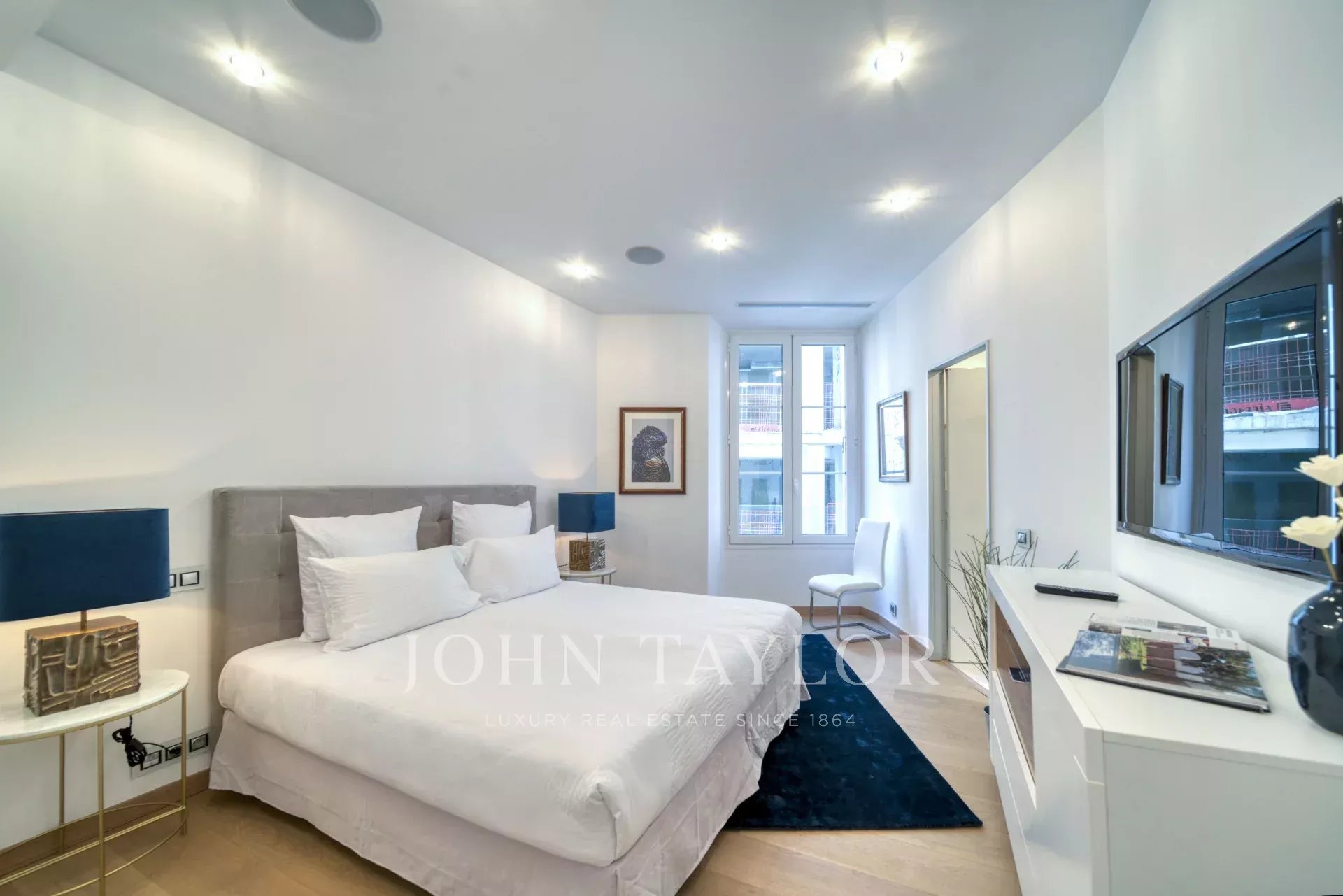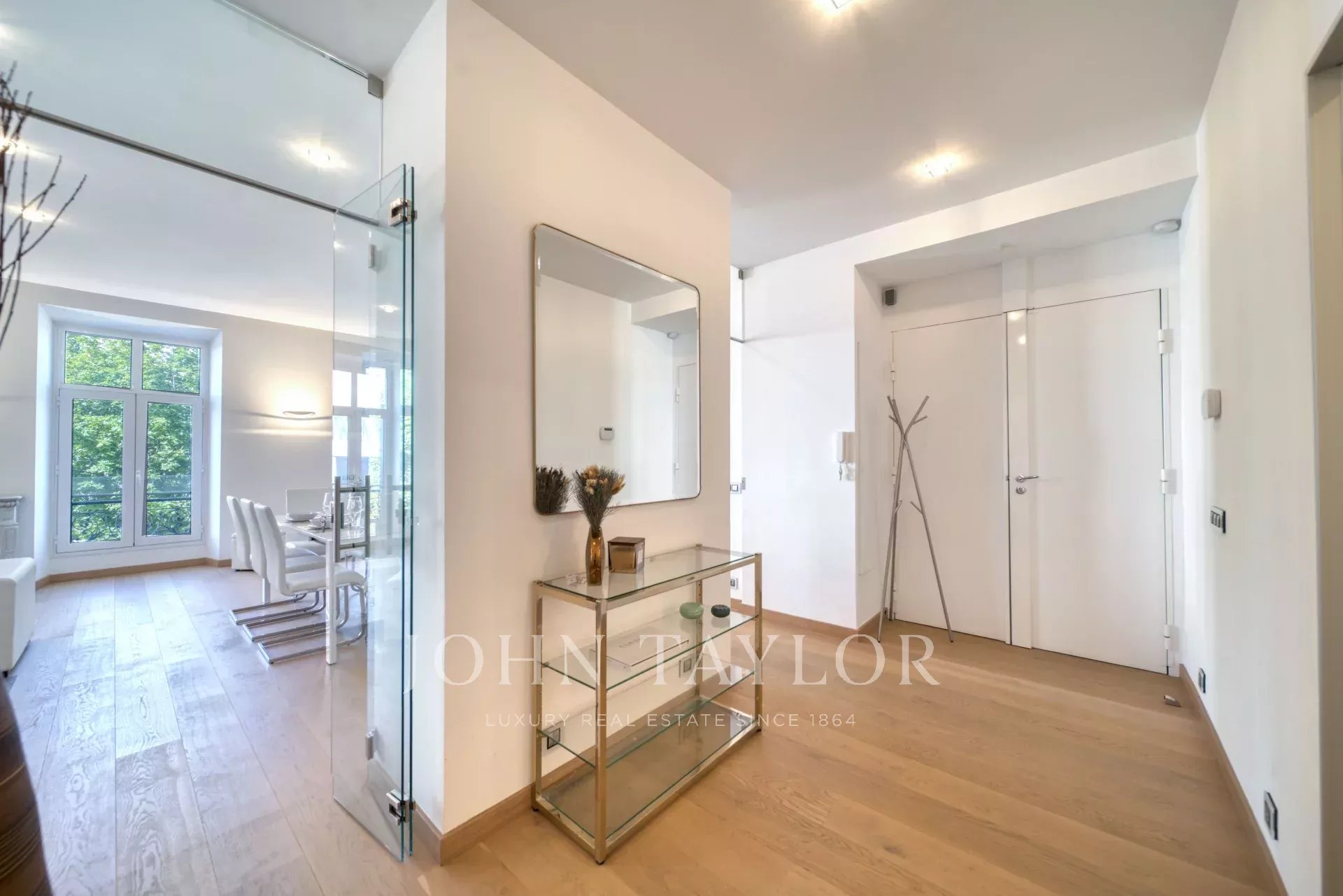 En la 2ª planta de un edificio de clase media, frente al Palais des Festivals y las playas de la Croisette, cerca de la rue d'Antibes, el mercado de Forville y el casco antiguo de Cannes "Le Suquet", piso contemporáneo con aire acondicionado, totalmente renovado, con 141 m2 de superficie habitable de la siguiente manera: