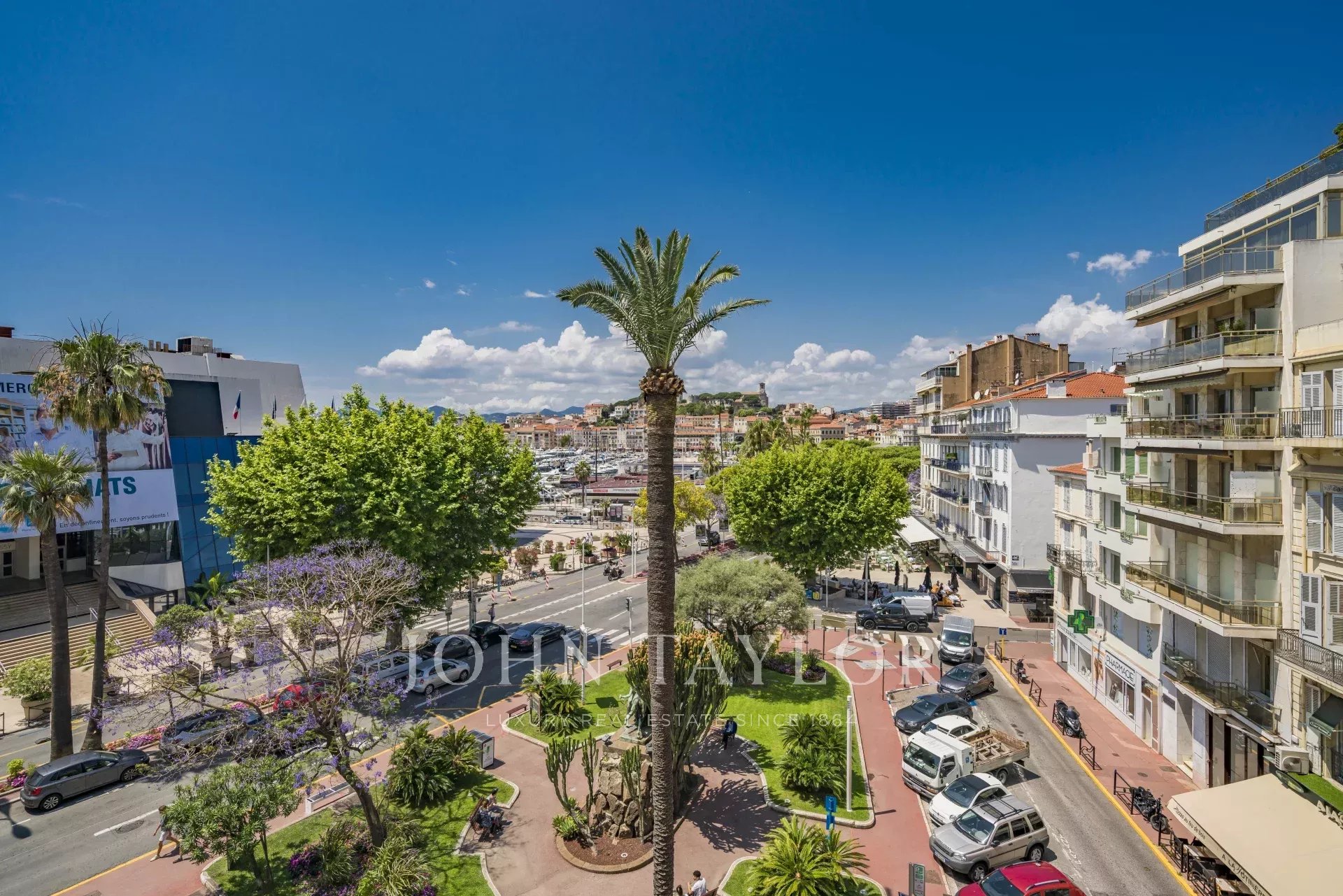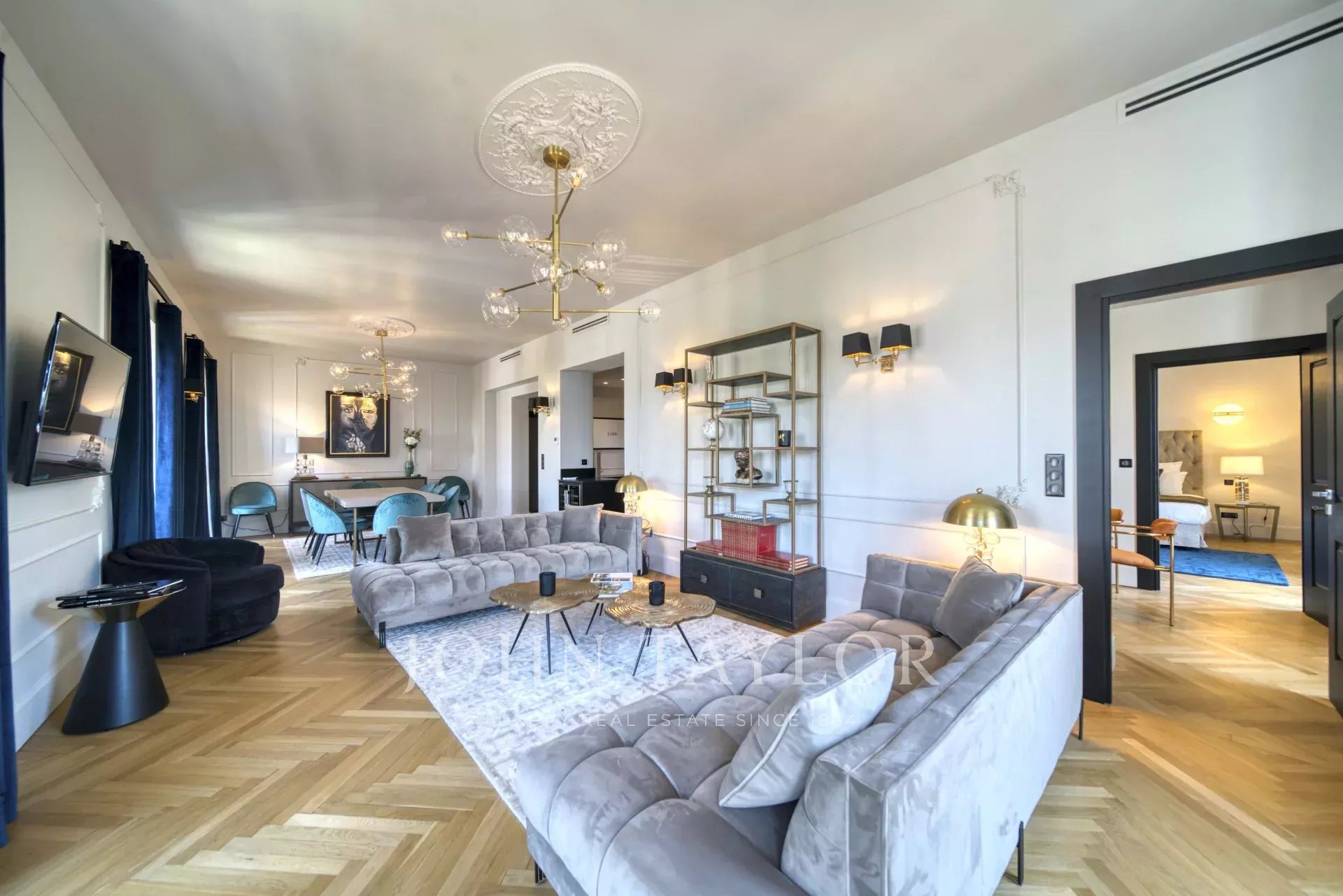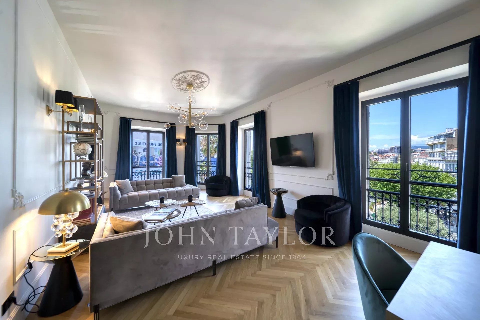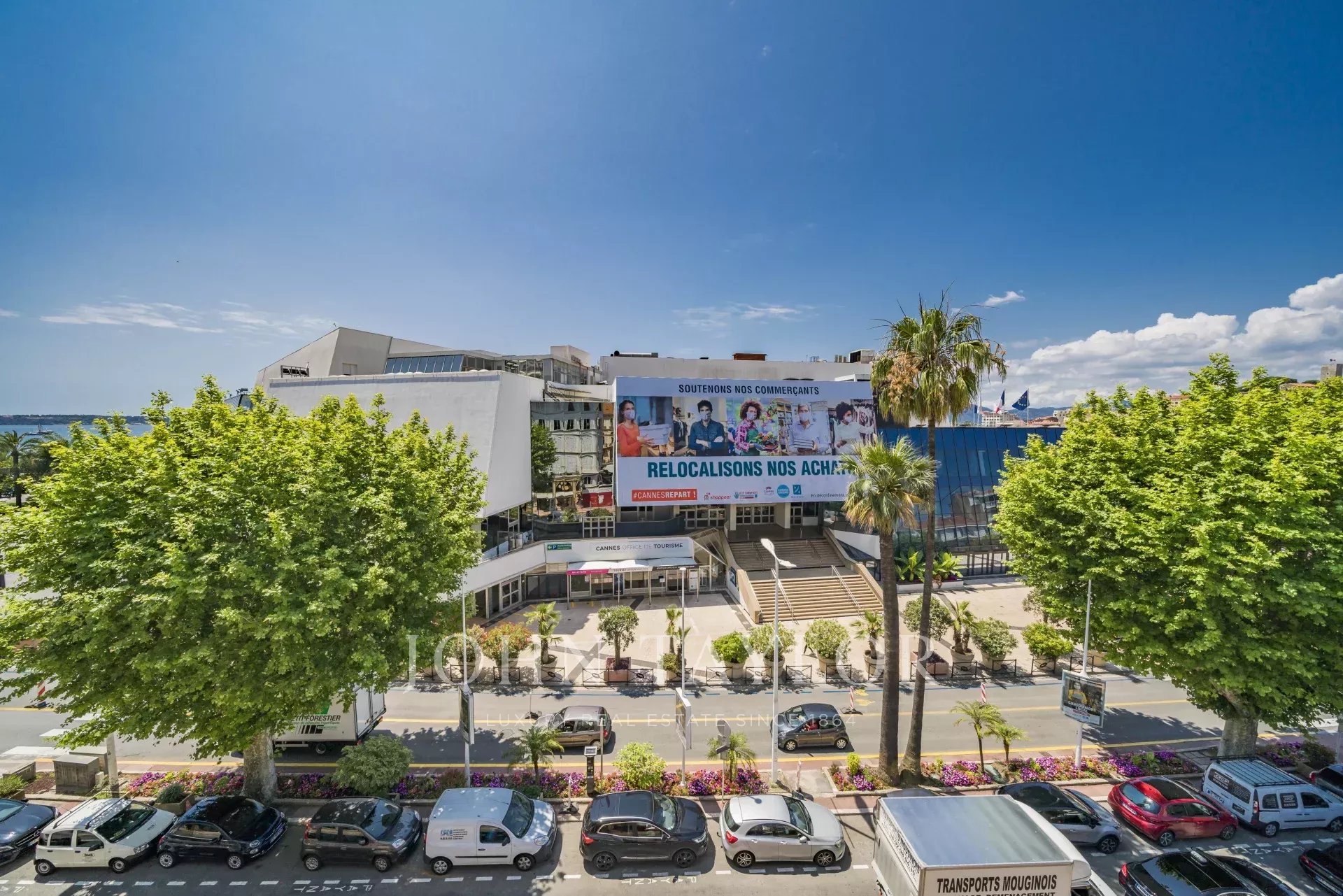 En la 3ª planta de un edificio de clase media, frente al Palais des Festivals y las playas de la Croisette, a 1 minuto de la rue d'Antibes, piso contemporáneo totalmente renovado con aire acondicionado y 195 m2 de superficie habitable: