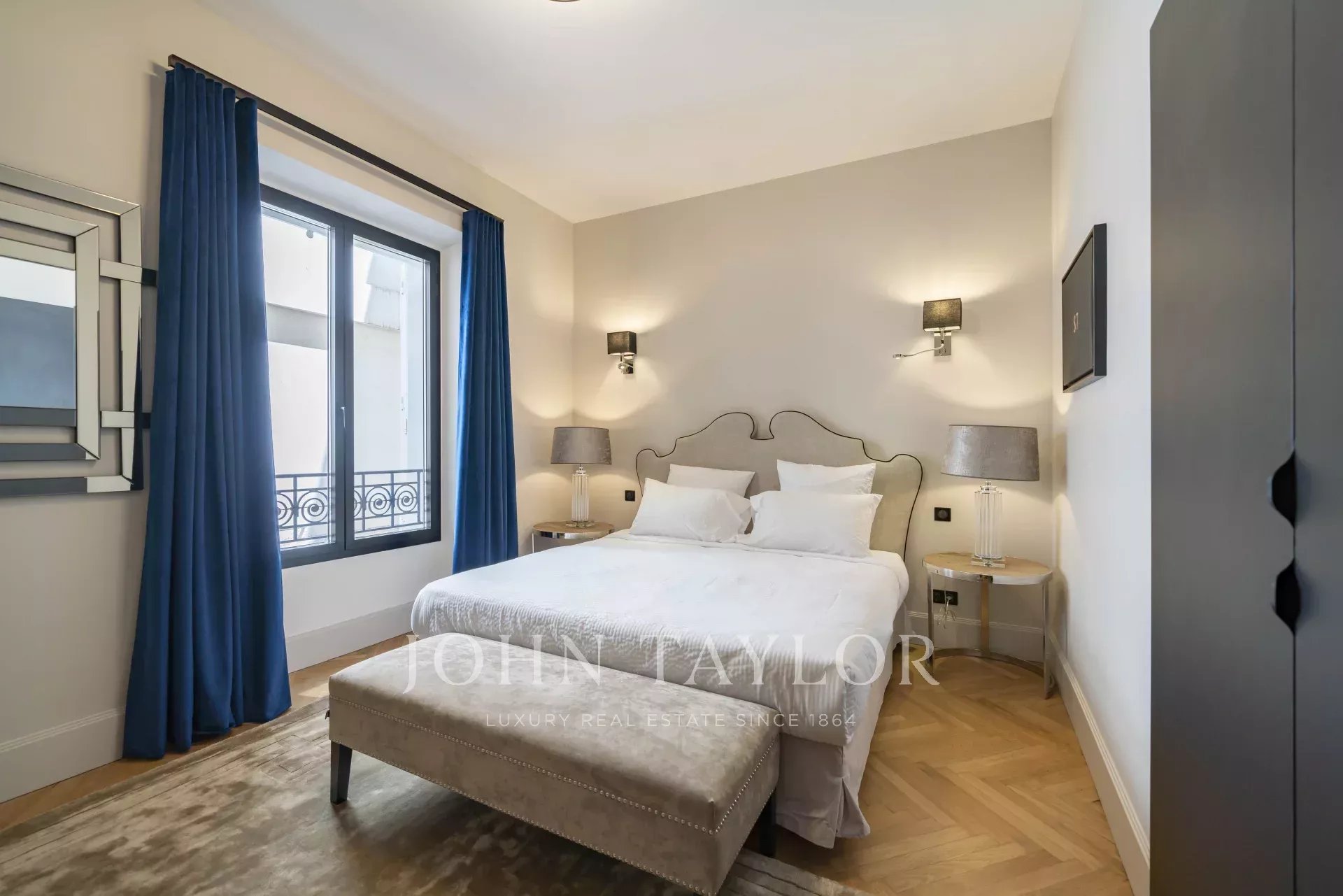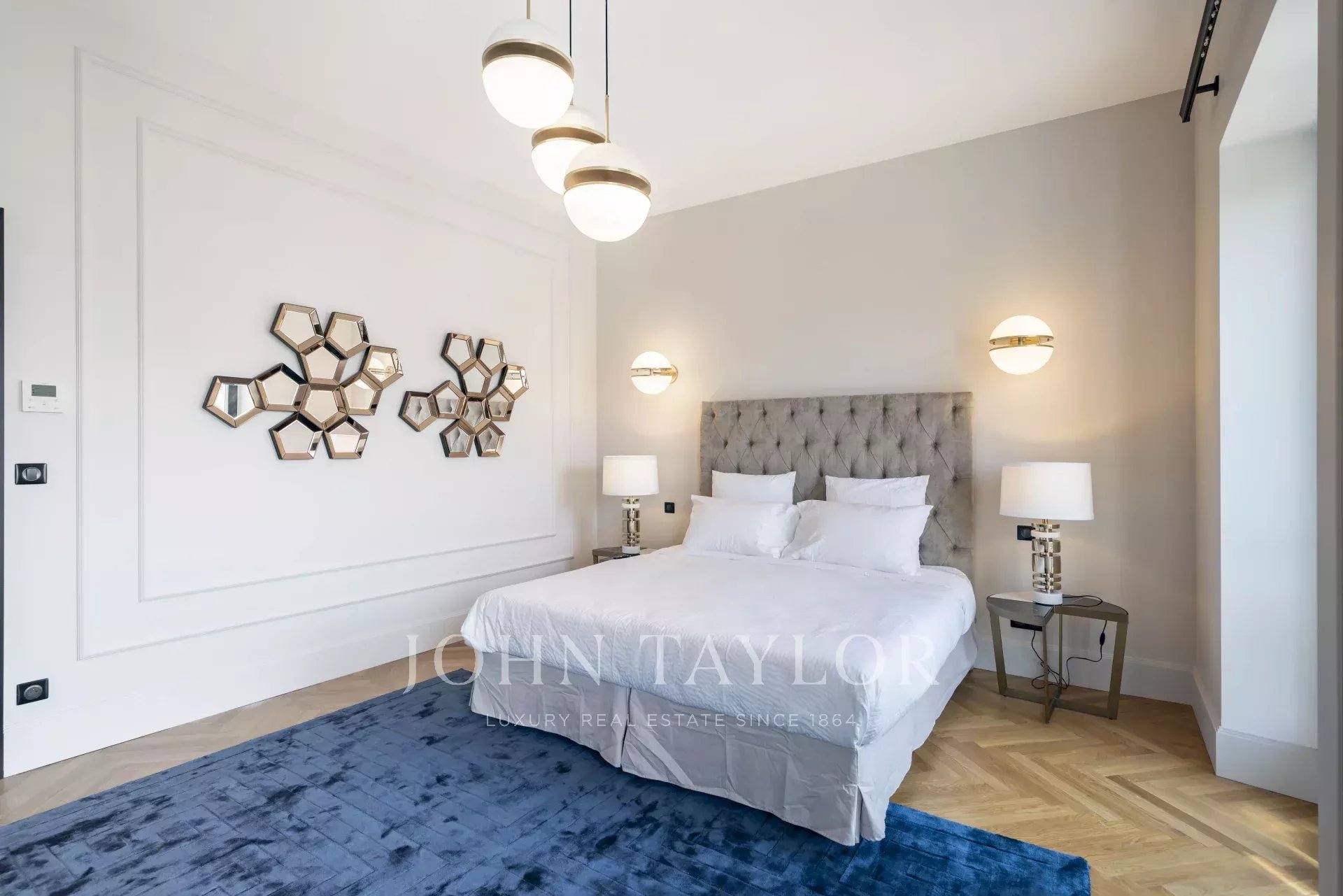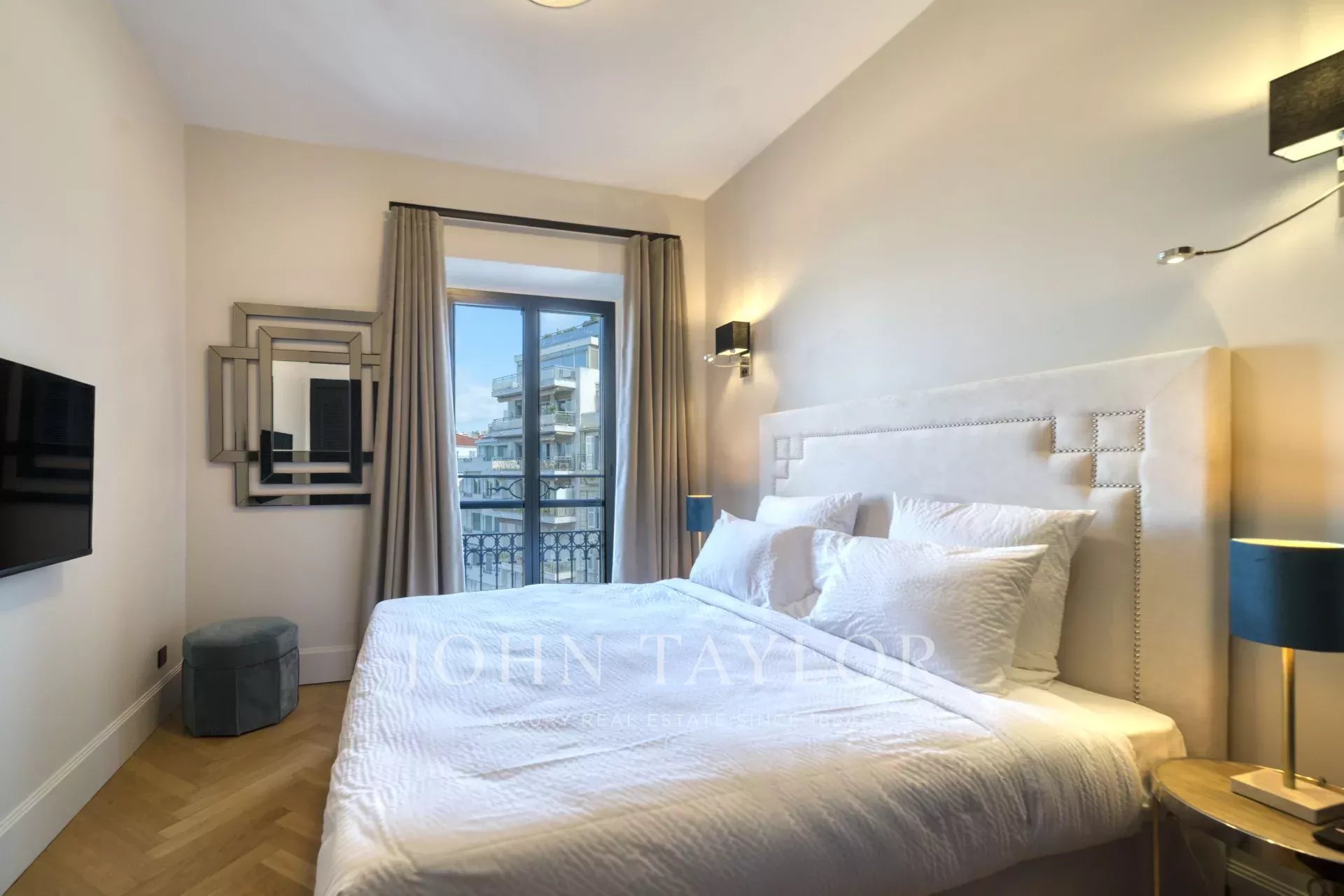 En la 3ª planta de un edificio de clase media, frente al Palais des Festivals y las playas de la Croisette, a 1 minuto de la rue d'Antibes, piso contemporáneo totalmente renovado con aire acondicionado y 195 m2 de superficie habitable:
