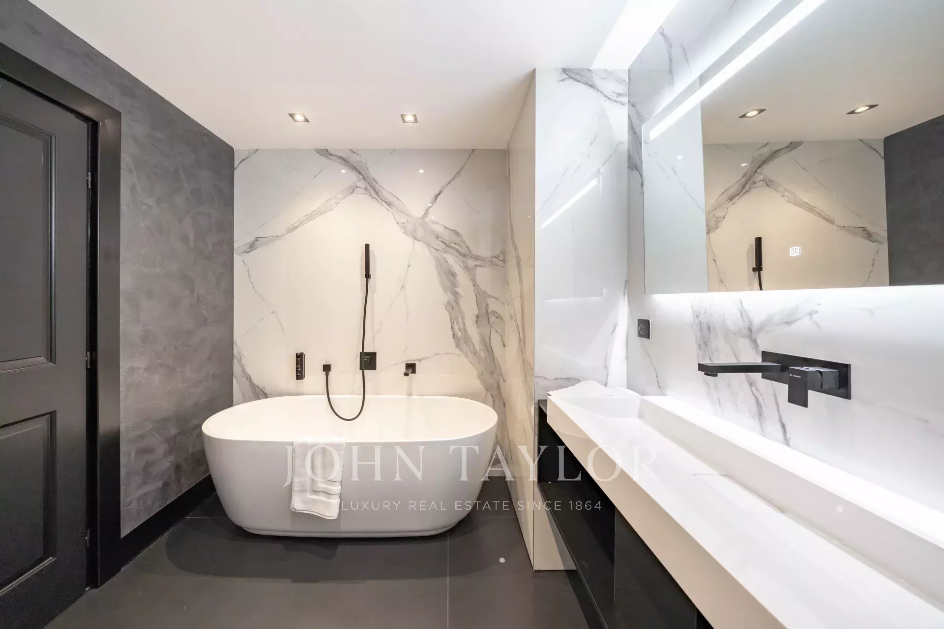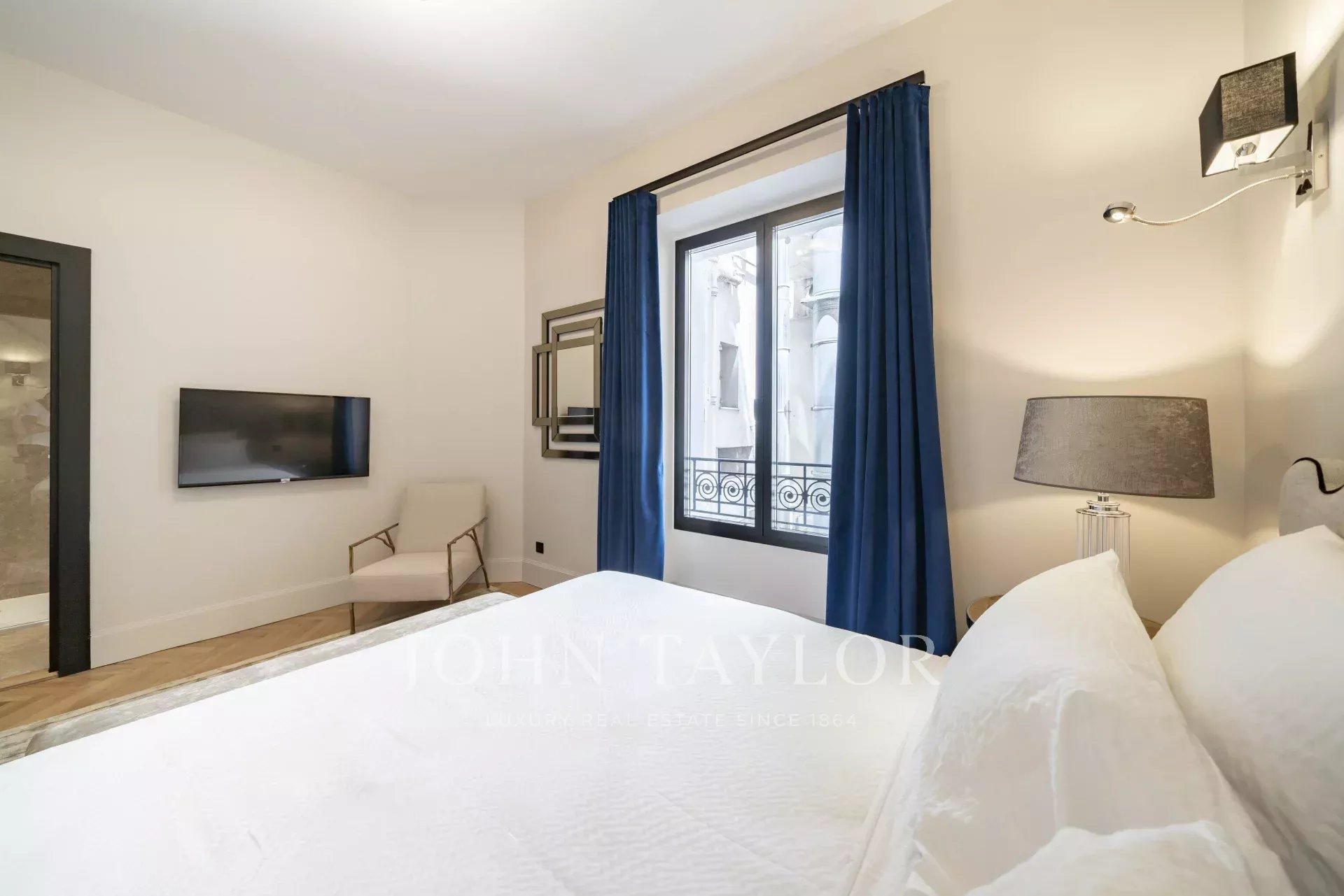 Dormitorio 1 (cama de 180 cm o dos camas individuales), TV, vestidor - vistas al Palais y al mar. Cuarto de baño en suite, bañera, ducha italiana, radiador toallero / WC japonés