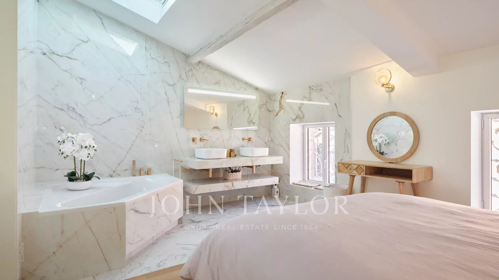 Un dormitorio con cama doble y cuarto de baño en suite (lavabo doble)