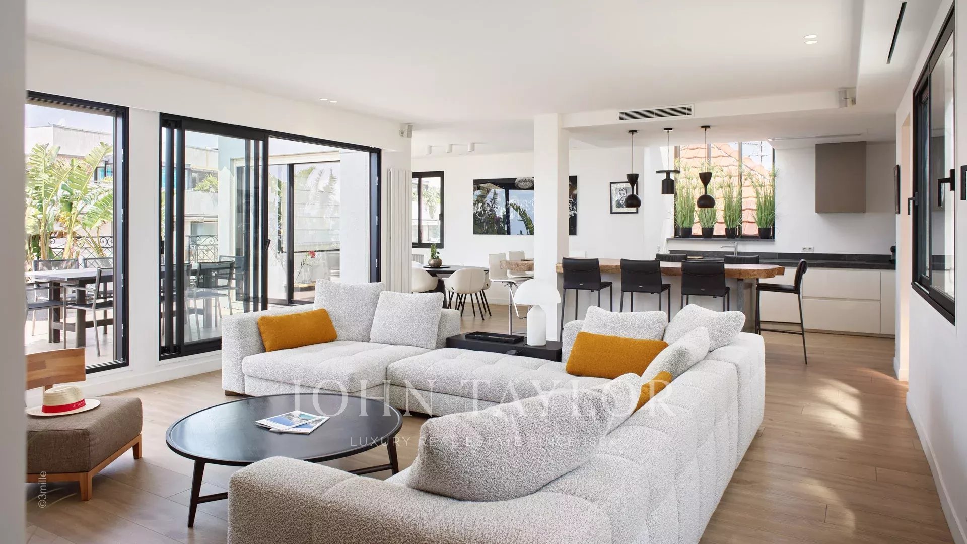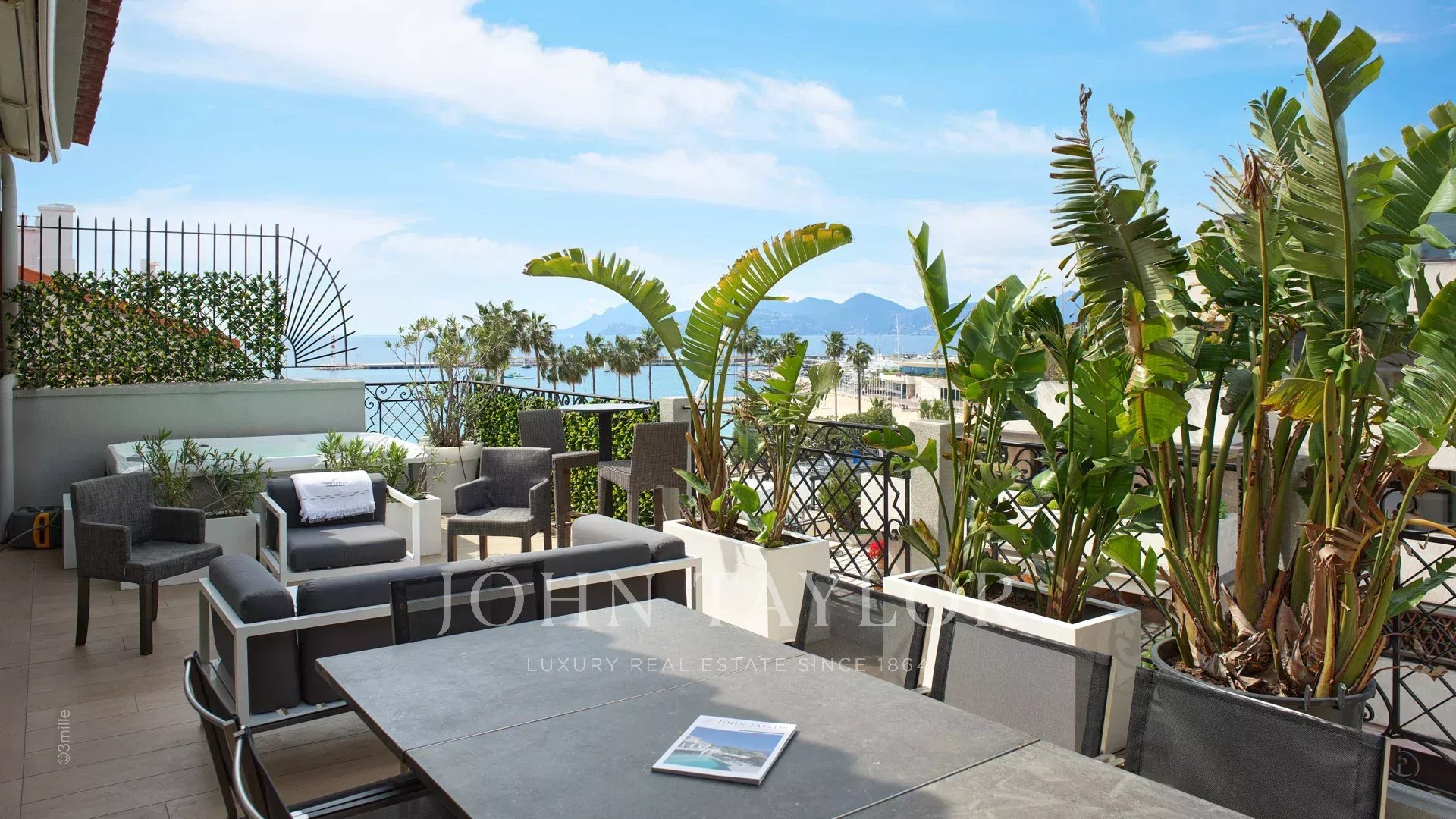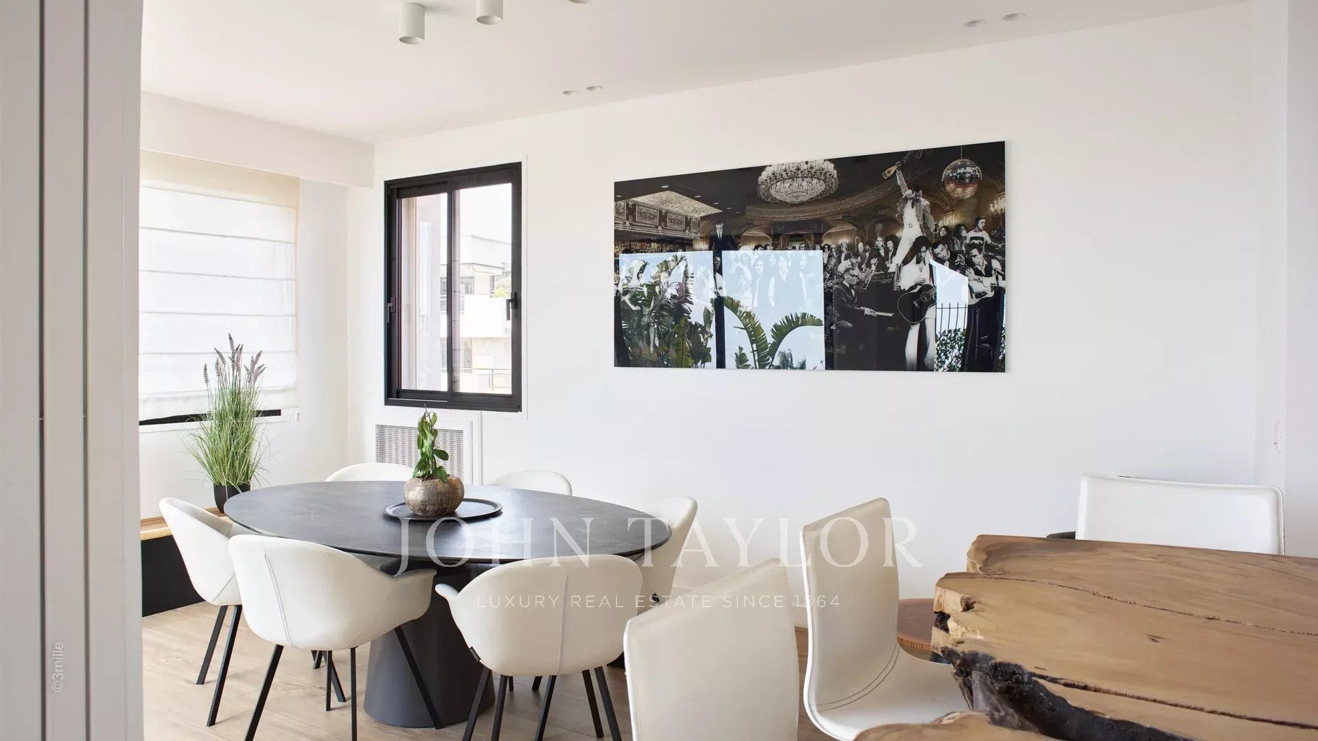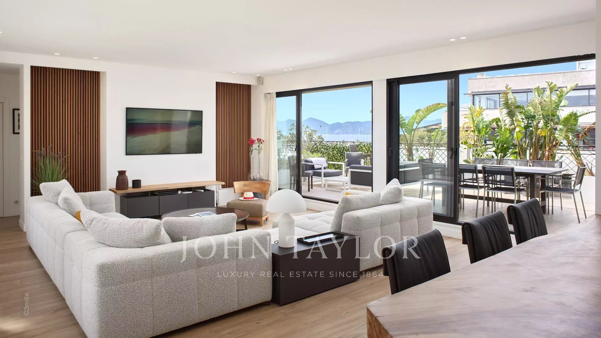 En una zona tranquila cerca del Palais des Festivals, este magnífico piso contemporáneo ofrece 130 m2 de espacio habitable, totalmente climatizado y renovado a un alto nivel, con dos grandes terrazas y preciosas vistas al mar.
