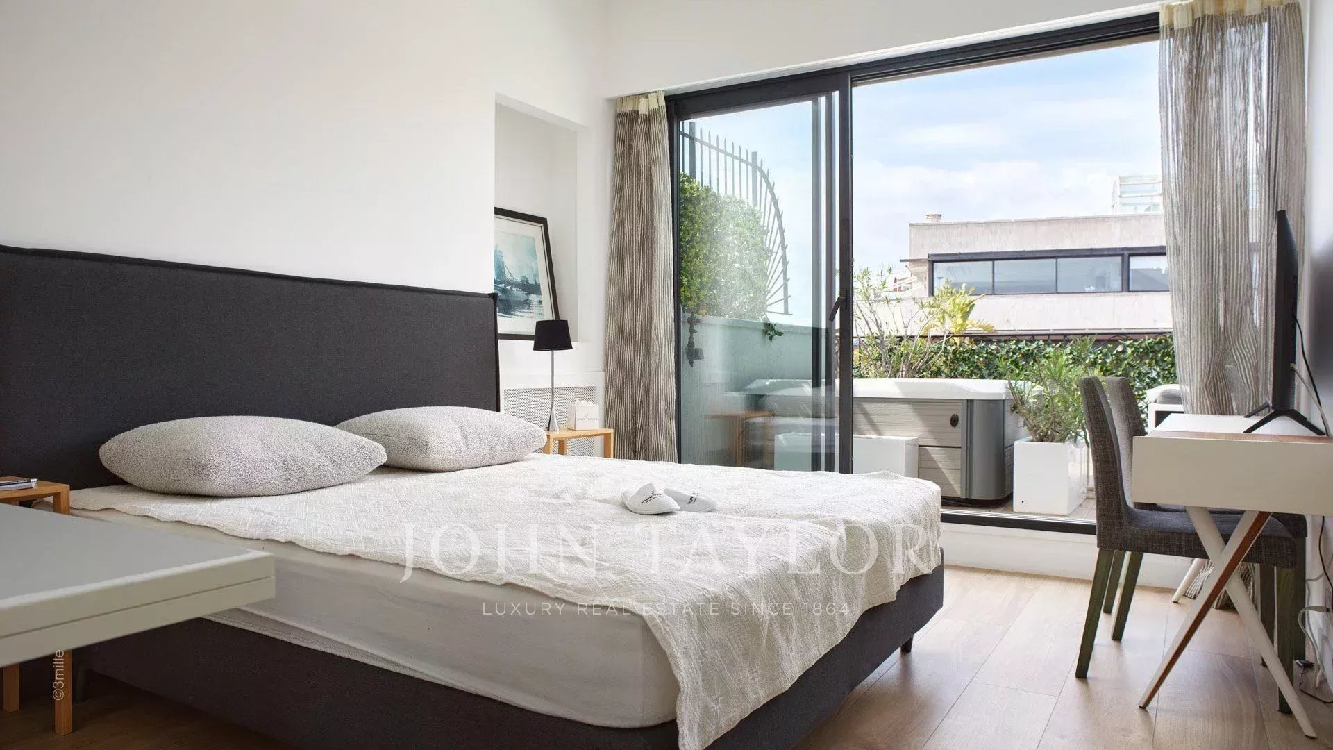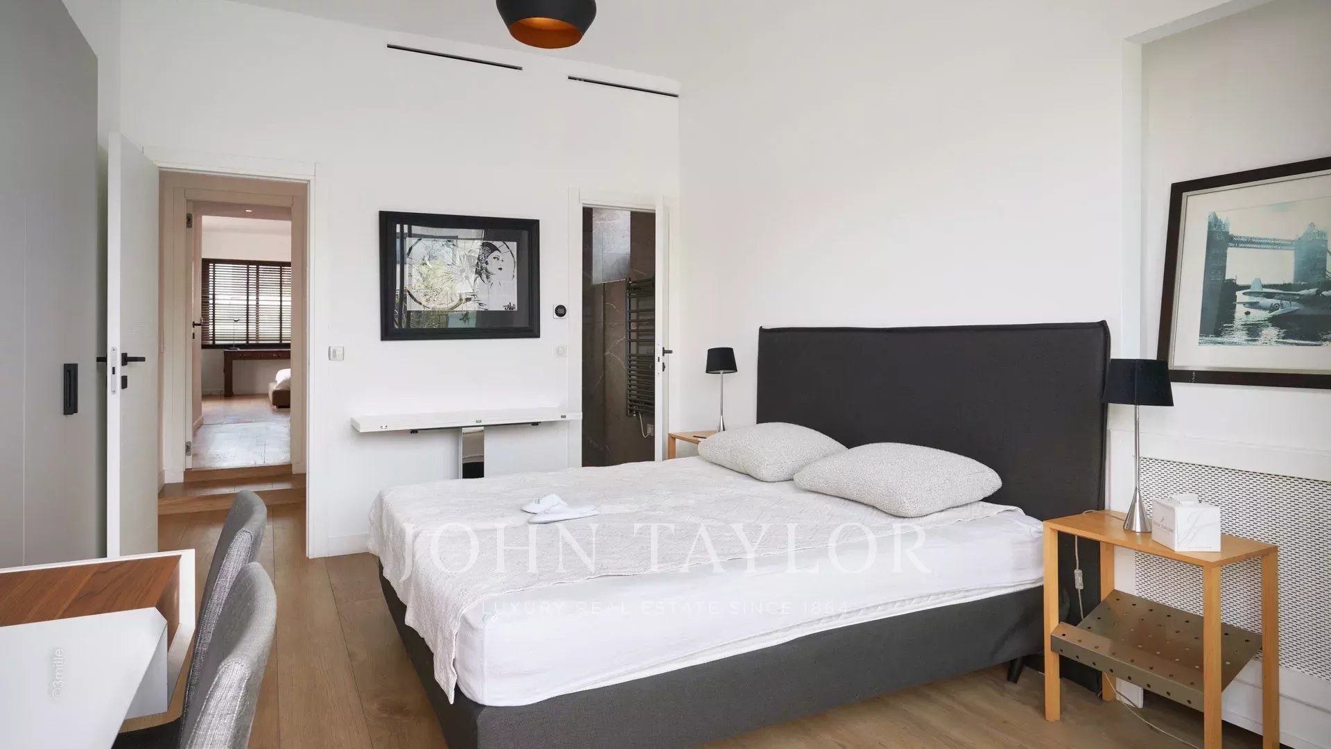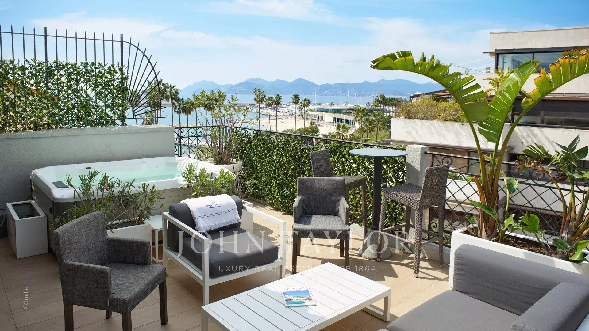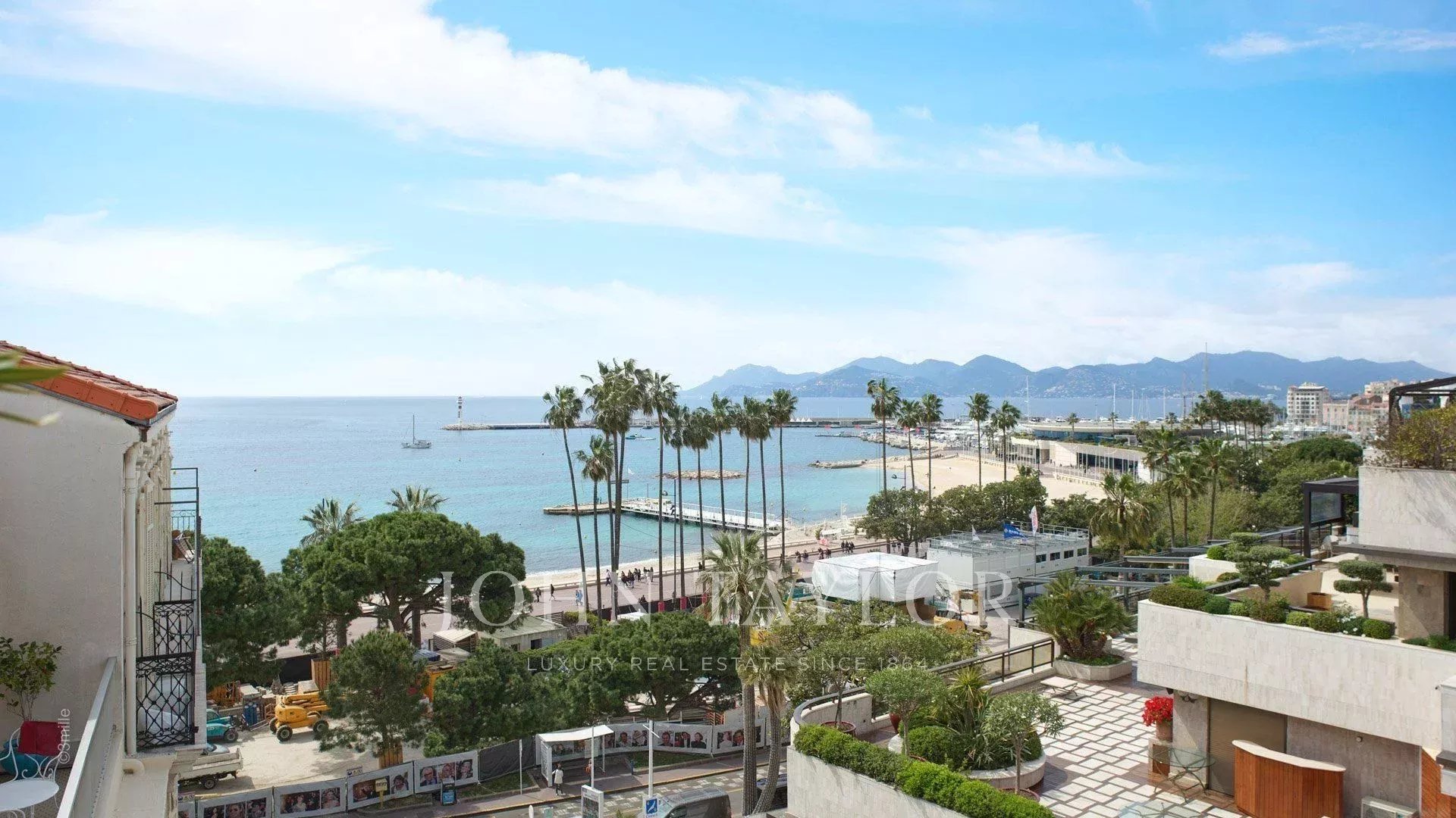 En una zona tranquila cerca del Palais des Festivals, este magnífico piso contemporáneo ofrece 130 m2 de espacio habitable, totalmente climatizado y renovado a un alto nivel, con dos grandes terrazas y preciosas vistas al mar.