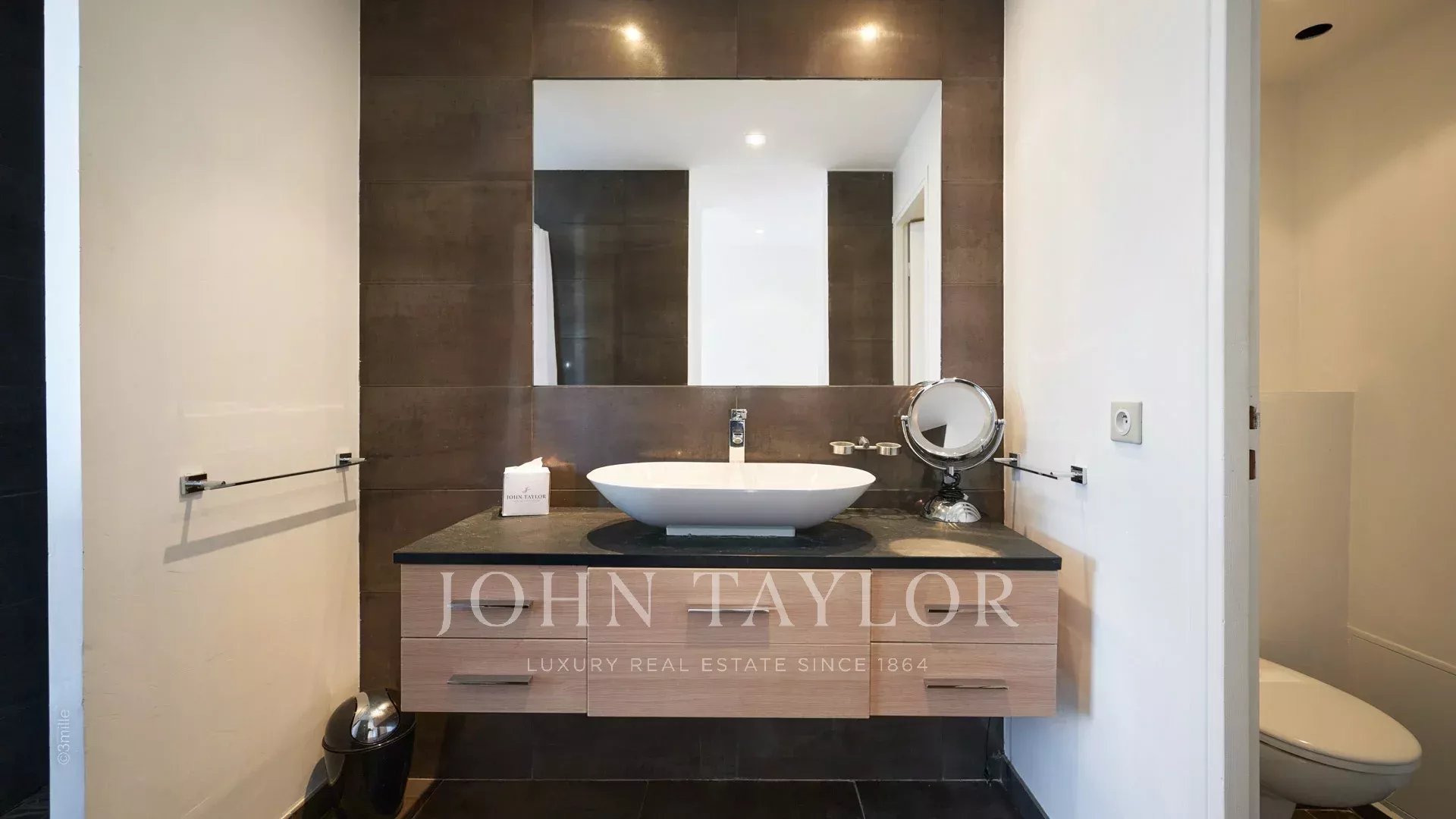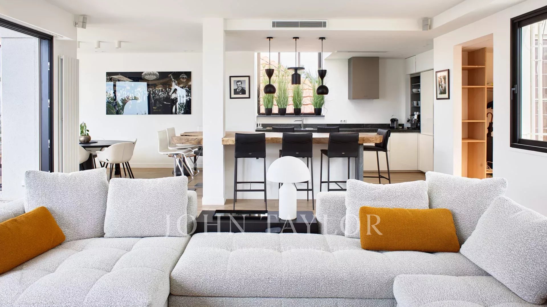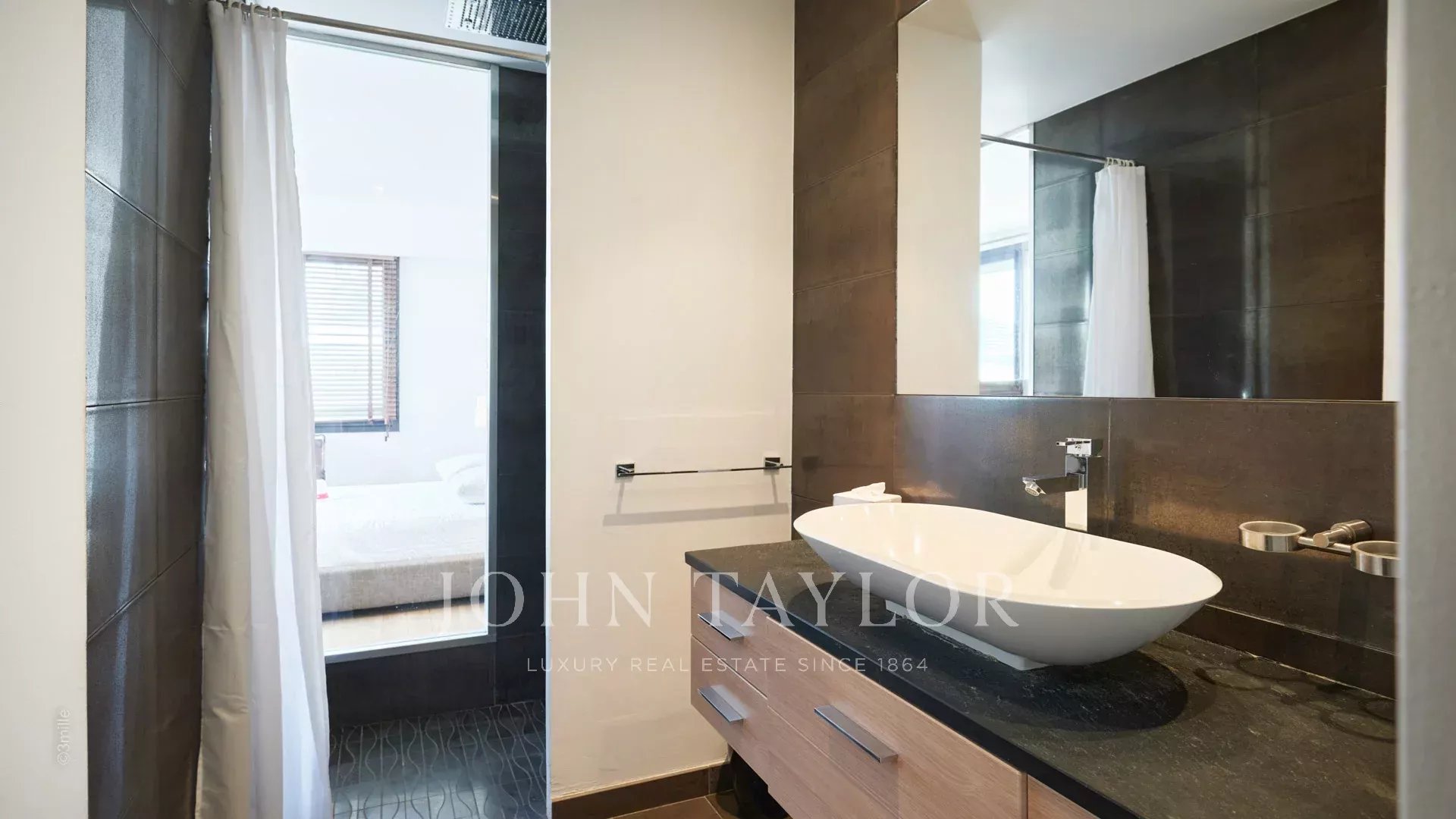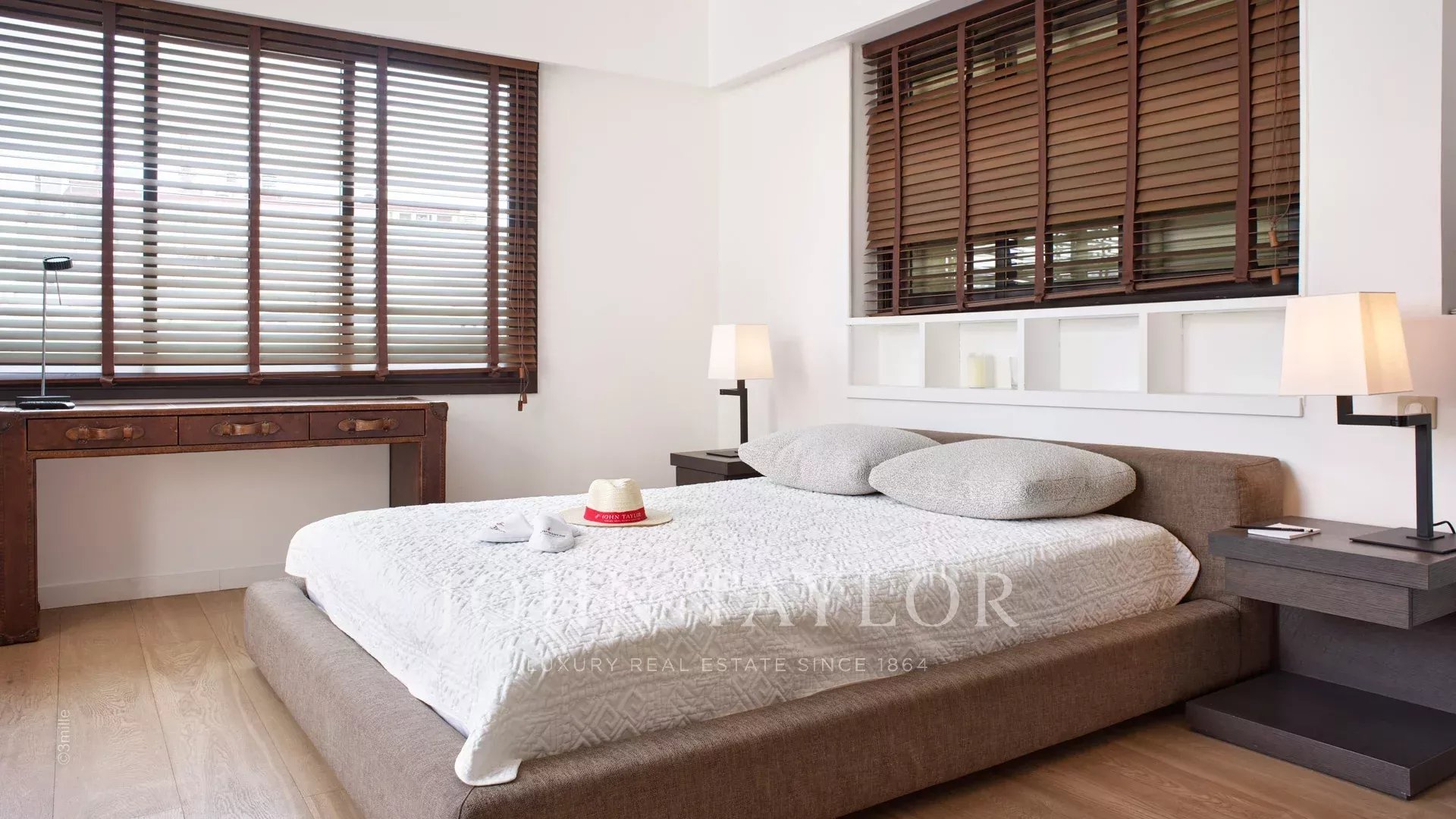 En una zona tranquila cerca del Palais des Festivals, este magnífico piso contemporáneo ofrece 130 m2 de espacio habitable, totalmente climatizado y renovado a un alto nivel, con dos grandes terrazas y preciosas vistas al mar.