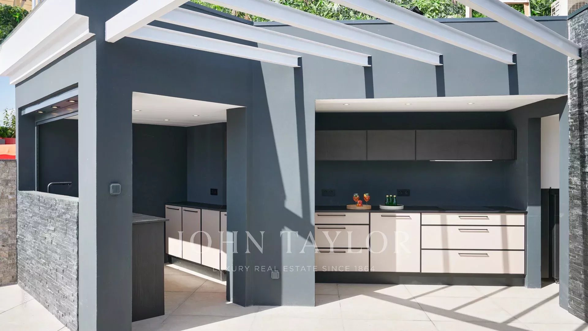 El acceso a la terraza de la azotea se realiza a través de una escalera desde la sala de estar, proporcionando un espacio exclusivo al aire libre para tomar el sol, relajarse en la piscina y disfrutar de las comidas preparadas en la cocina al aire libre.