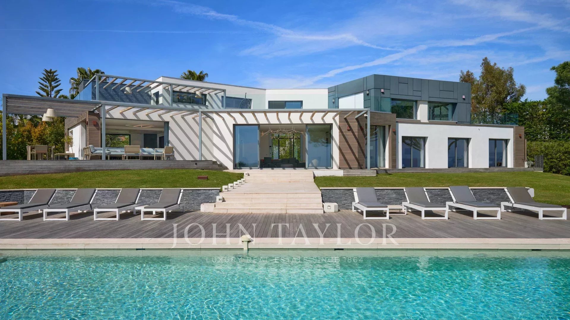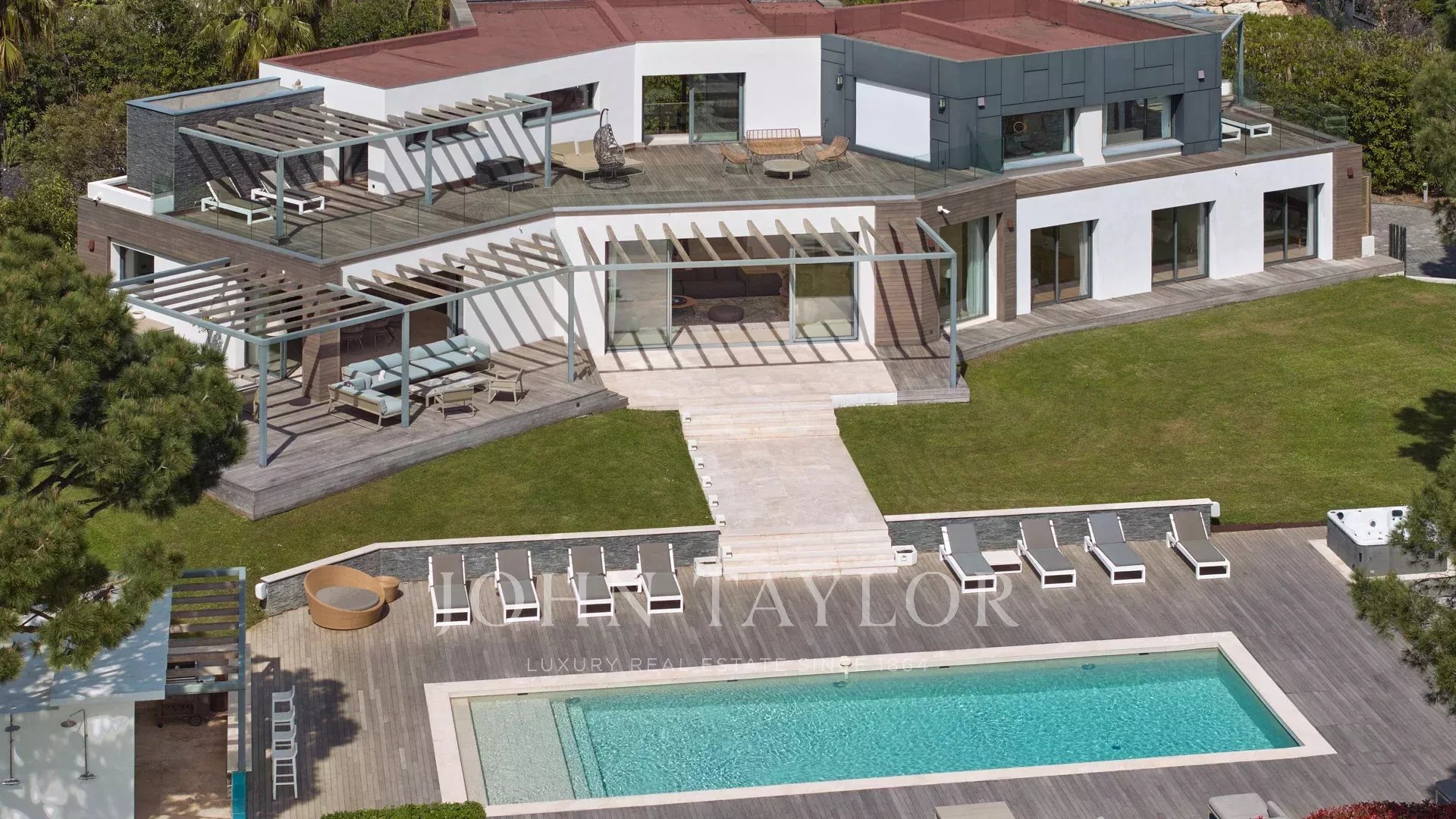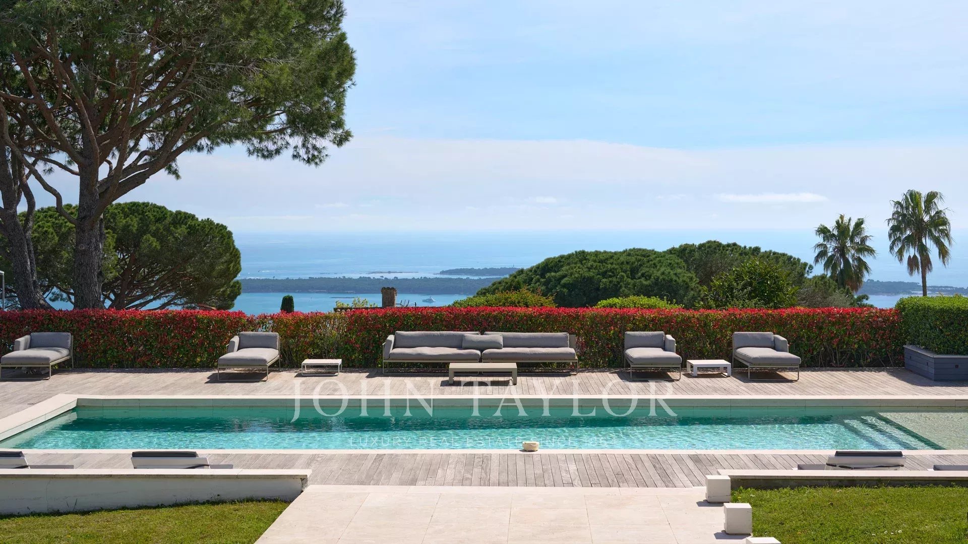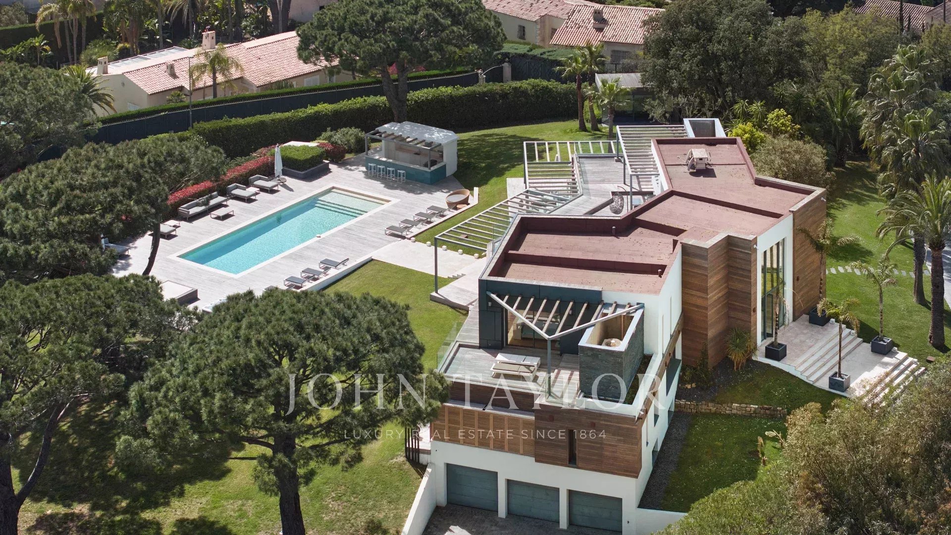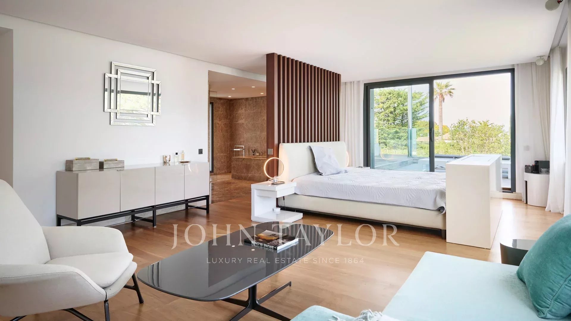 En las colinas de Cannes, con una vista panorámica única de las islas Lérins, esta magnífica villa contemporánea combina madera y hormigón en el corazón de 6.200 m2 de parque. Completamente renovada, la villa cuenta con volúmenes generosos, equipamientos de alta gama y tres grandes terrazas.