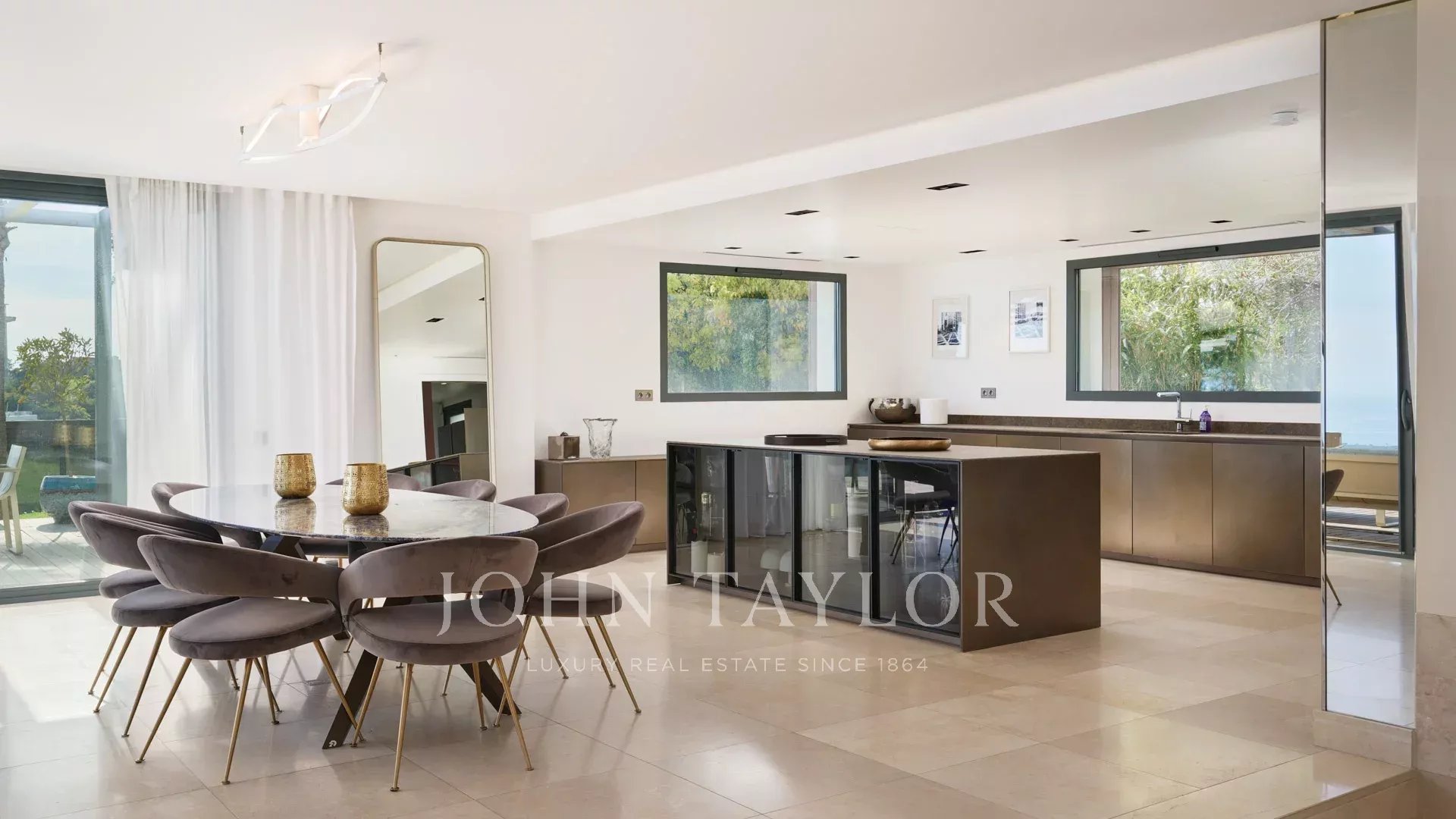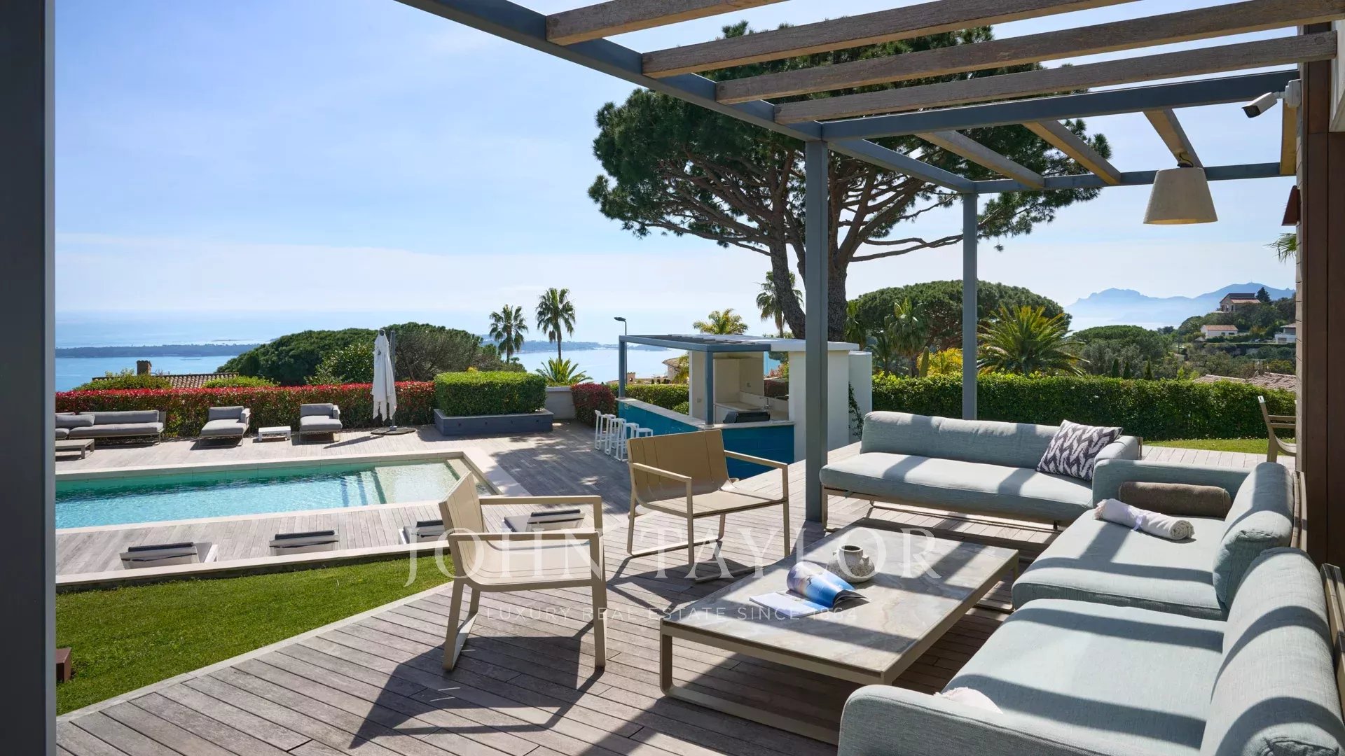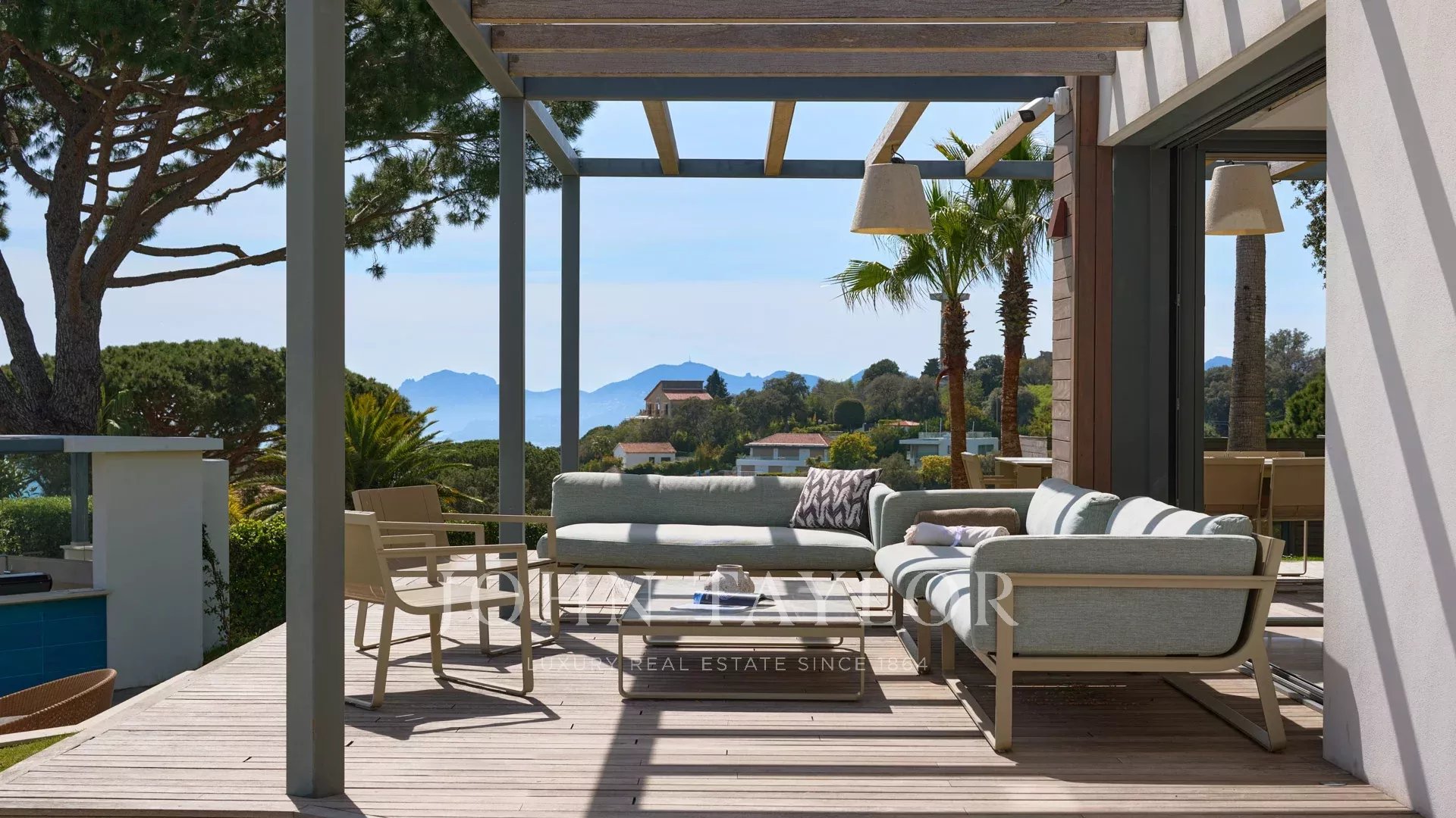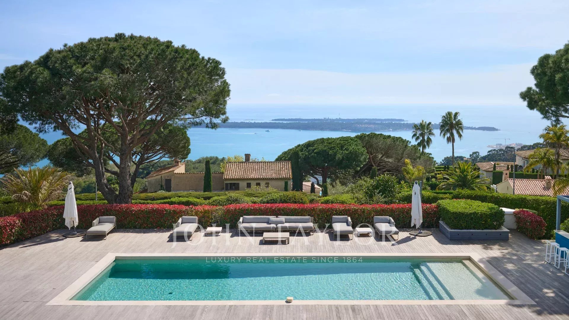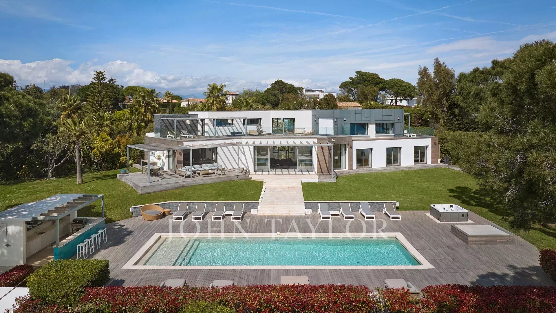En las colinas de Cannes, con una vista panorámica única de las islas Lérins, esta magnífica villa contemporánea combina madera y hormigón en el corazón de 6.200 m2 de parque. Completamente renovada, la villa cuenta con volúmenes generosos, equipamientos de alta gama y tres grandes terrazas.