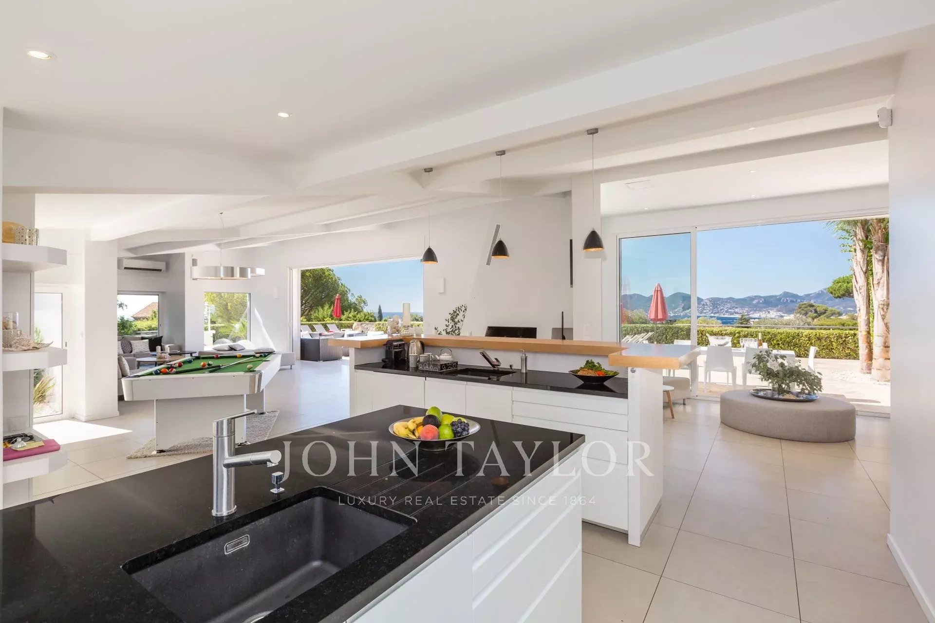 Entrada principal que da a una cocina americana, gran salón, comedor con chimenea, todo ello con salida a la terraza y a la piscina, vistas al mar.