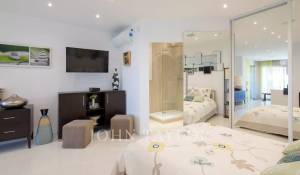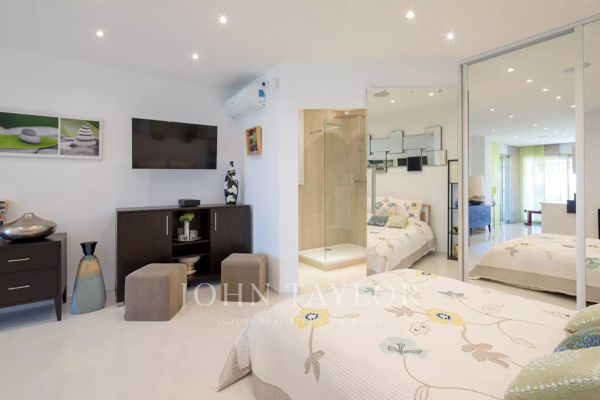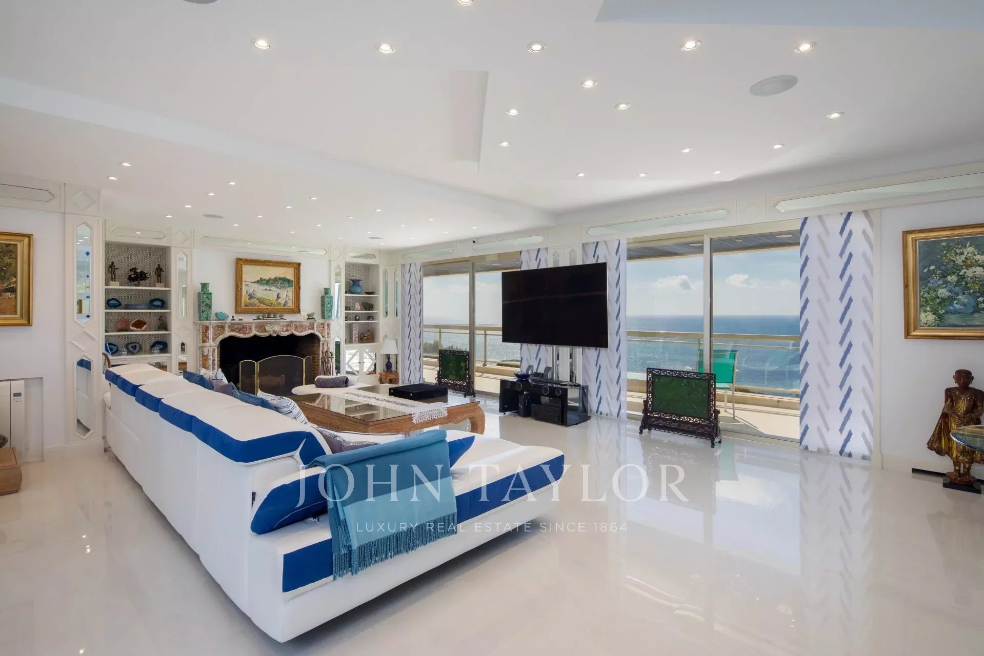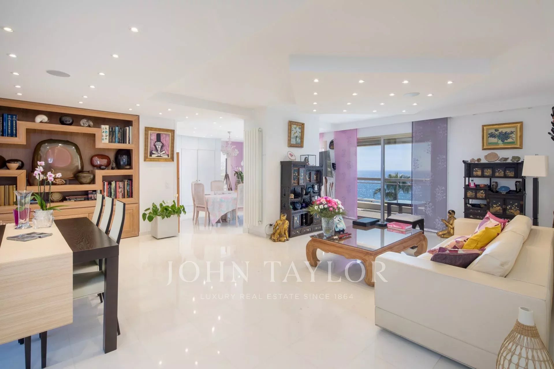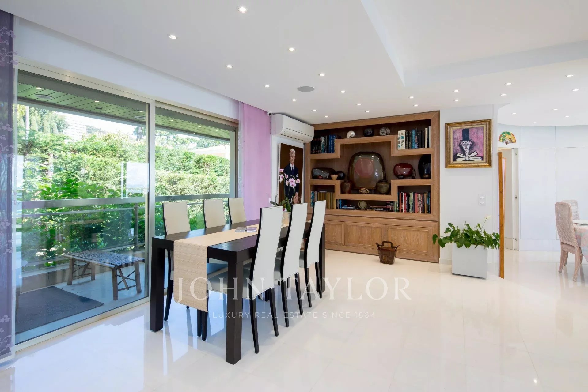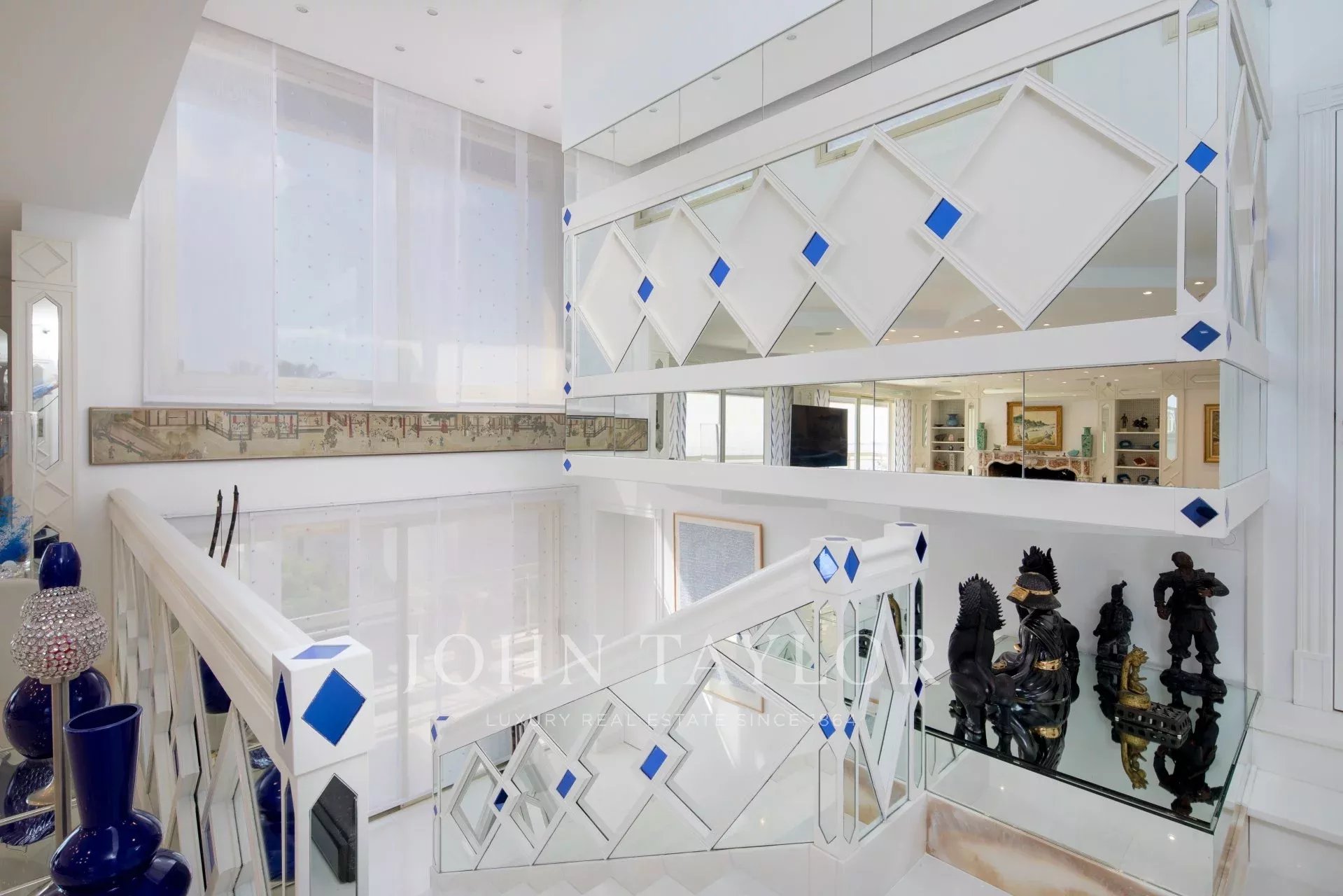 Hall de entrada que conduce a un salón comedor doble con salida a una terraza con vistas a la bahía de Cannes y a las islas de Lérins.