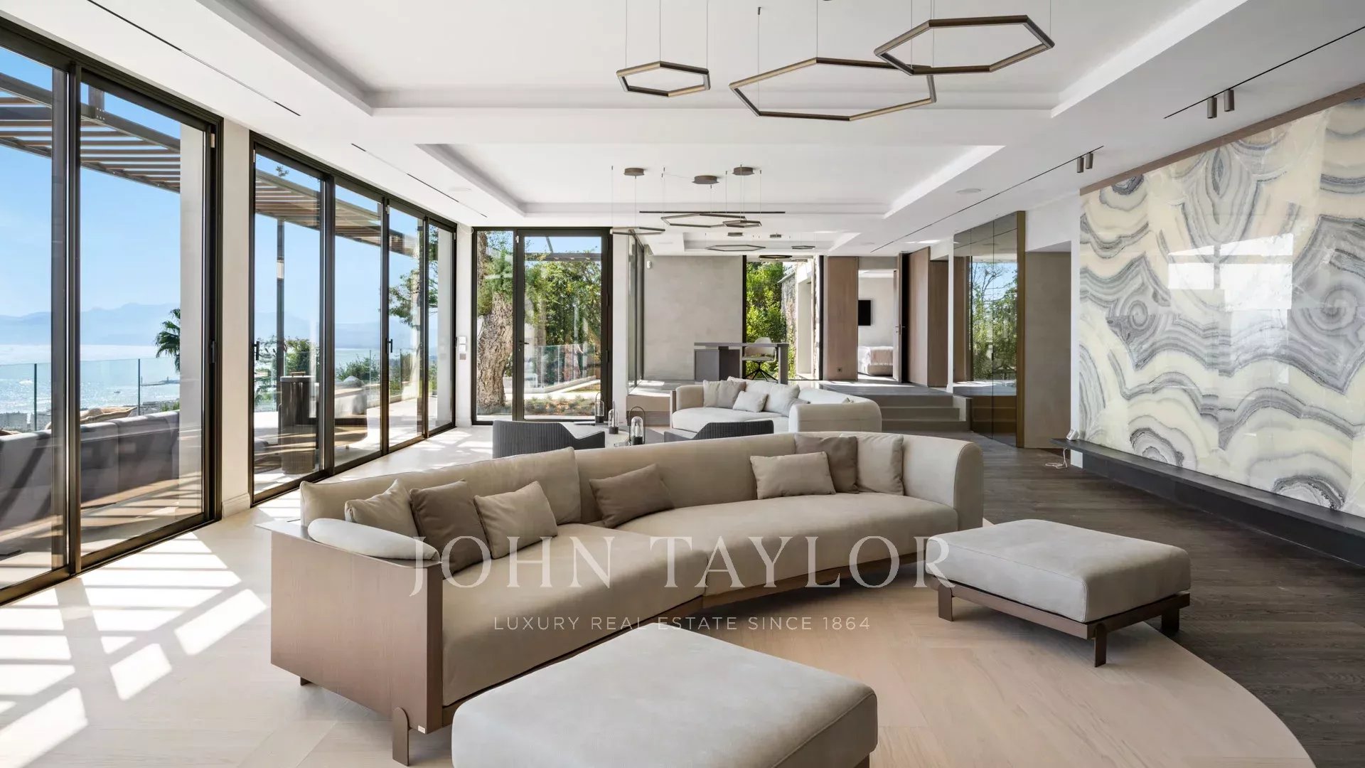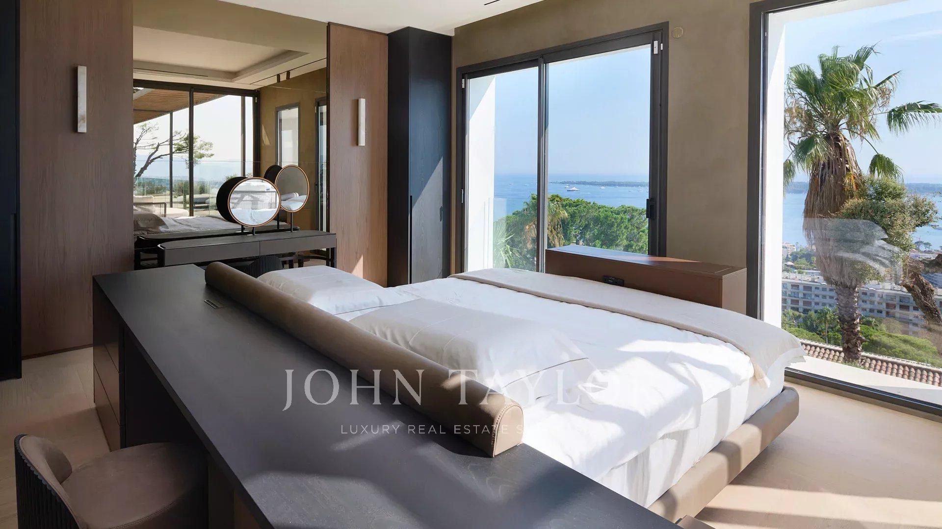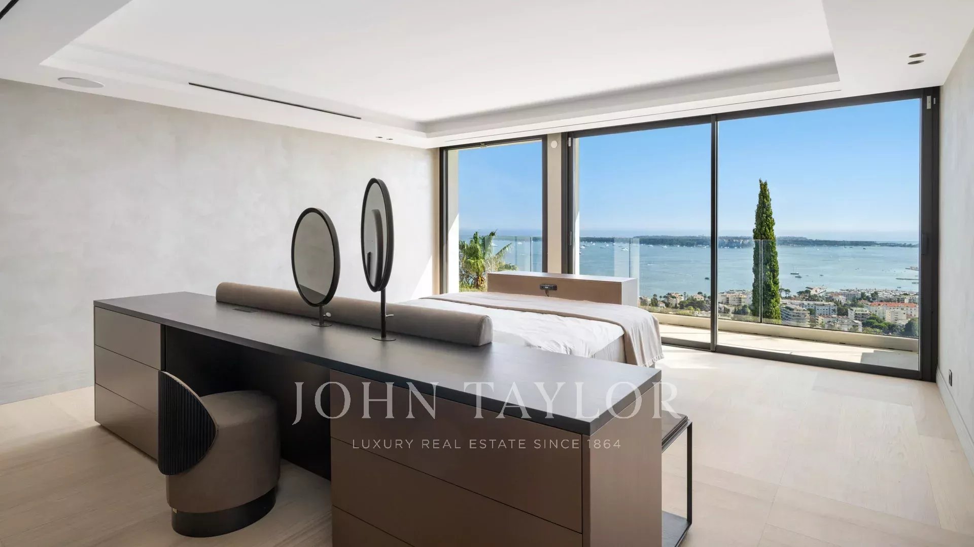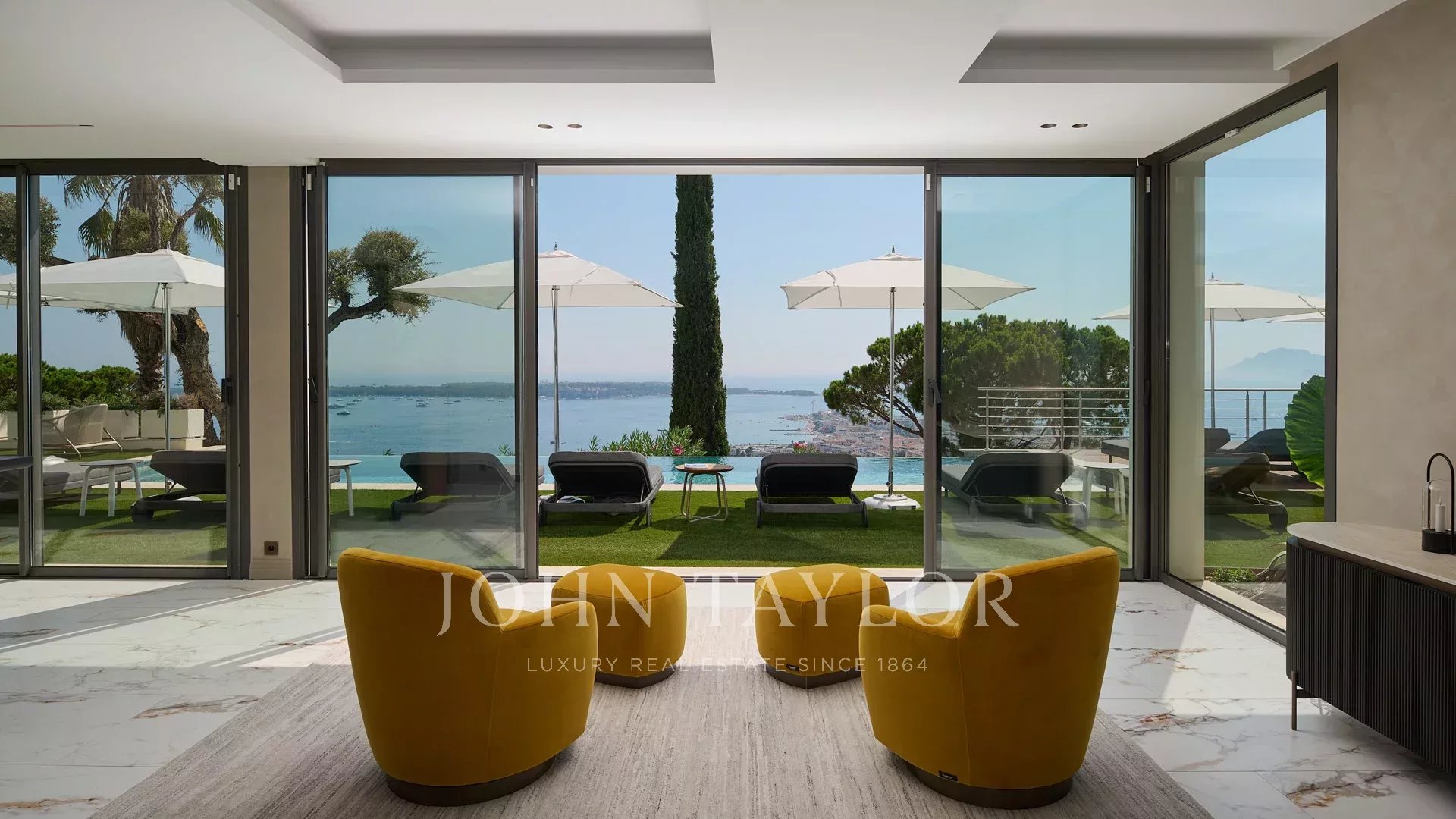 Con 550 m² de espacio habitable, la villa cuenta con una decoración sofisticada y vistas ininterrumpidas sobre la bahía de Cannes y las islas Lérins, lo que garantiza unas panorámicas impresionantes.
