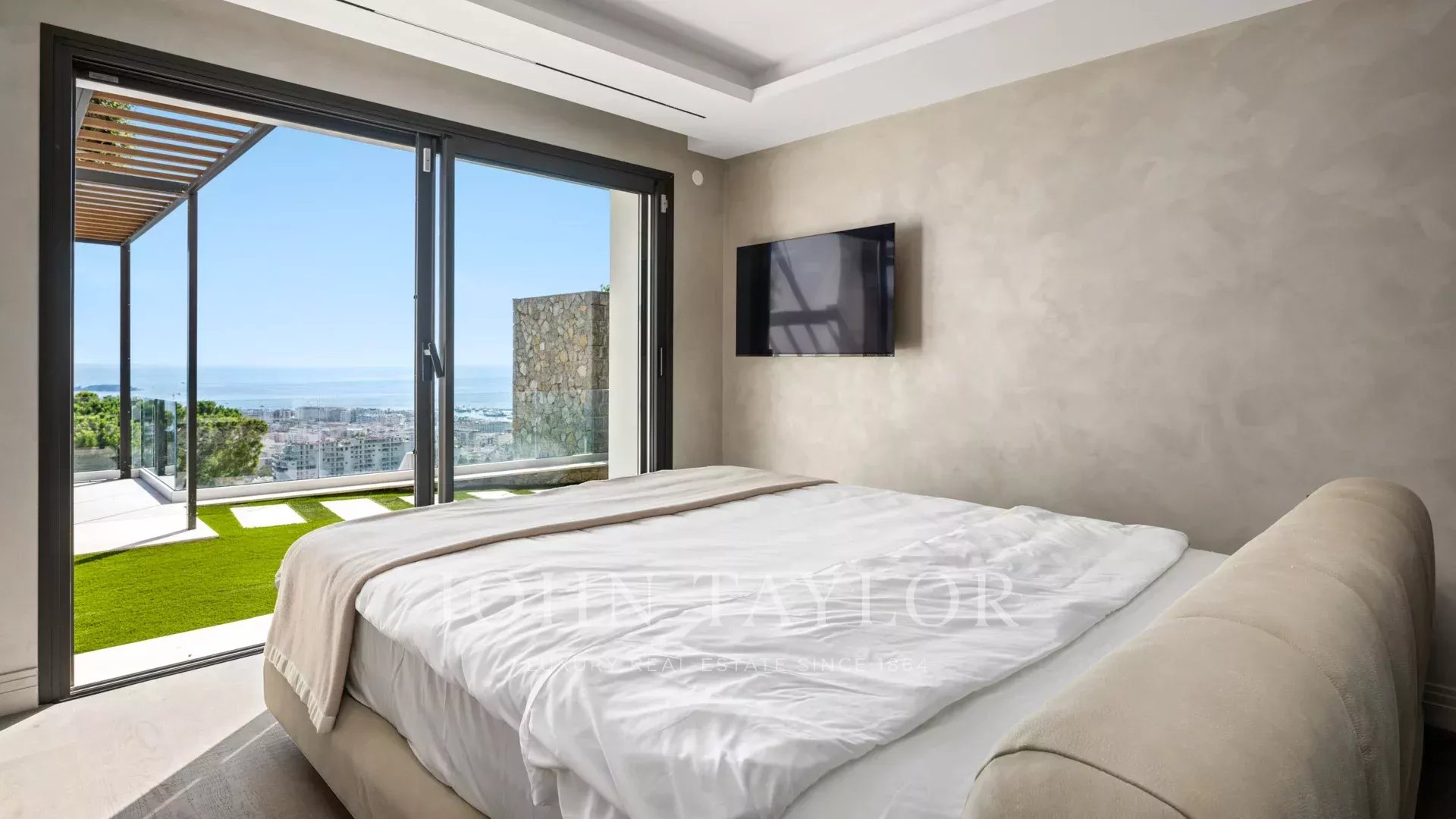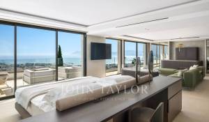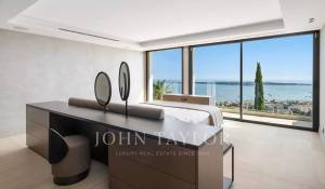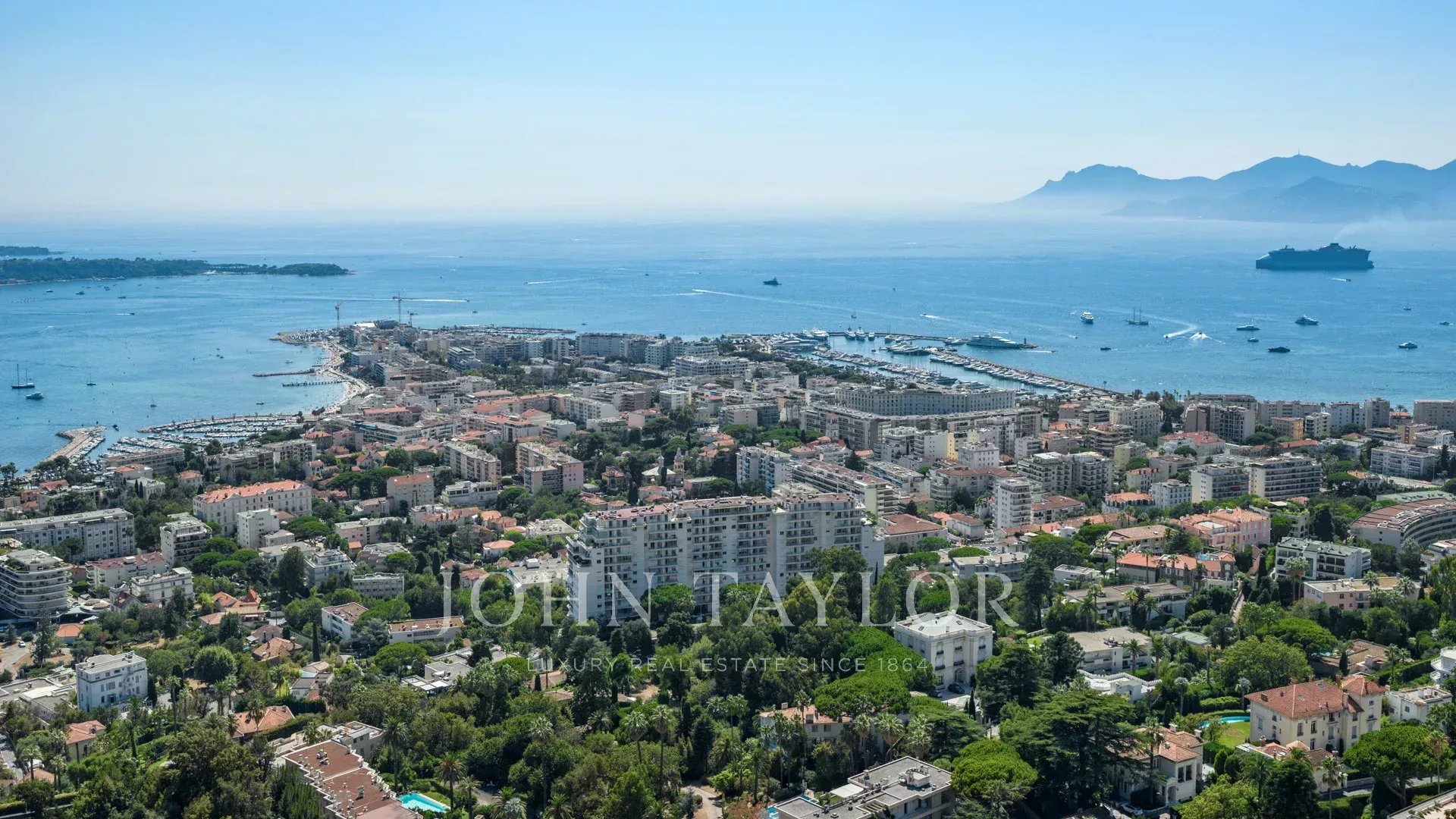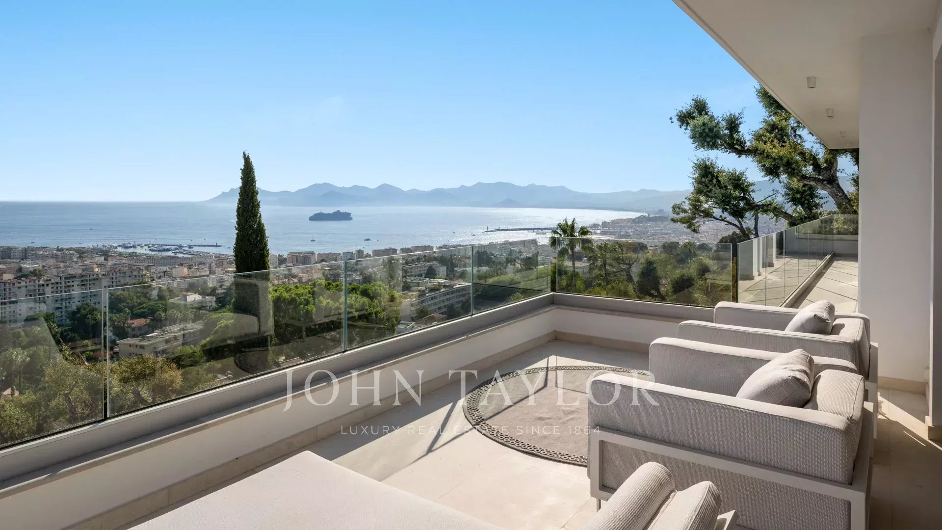 Con 550 m² de espacio habitable, la villa cuenta con una decoración sofisticada y vistas ininterrumpidas sobre la bahía de Cannes y las islas Lérins, lo que garantiza unas panorámicas impresionantes.