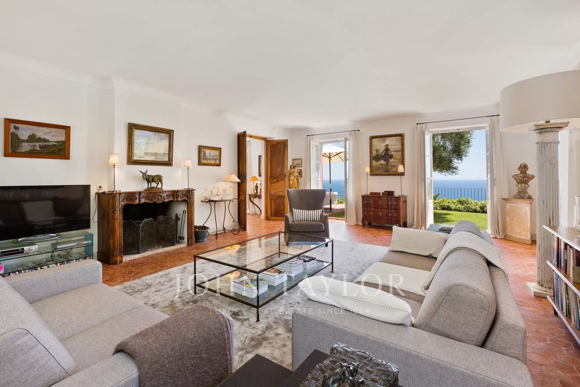 Hall de entrada que conduce al salón (TV) con salida a la terraza y al jardín, vistas al mar
