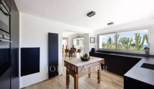 Cocina totalmente equipada abierta al comedor y con vistas al jardín, al comedor de verano y a la piscina
