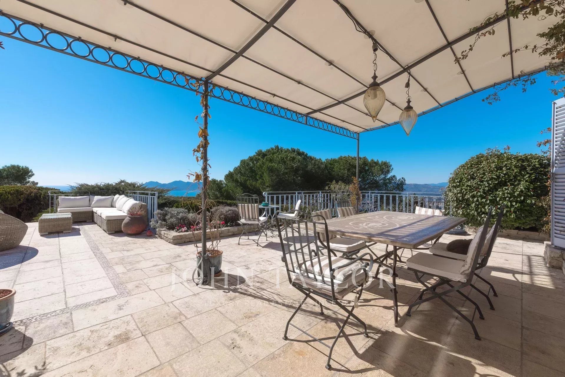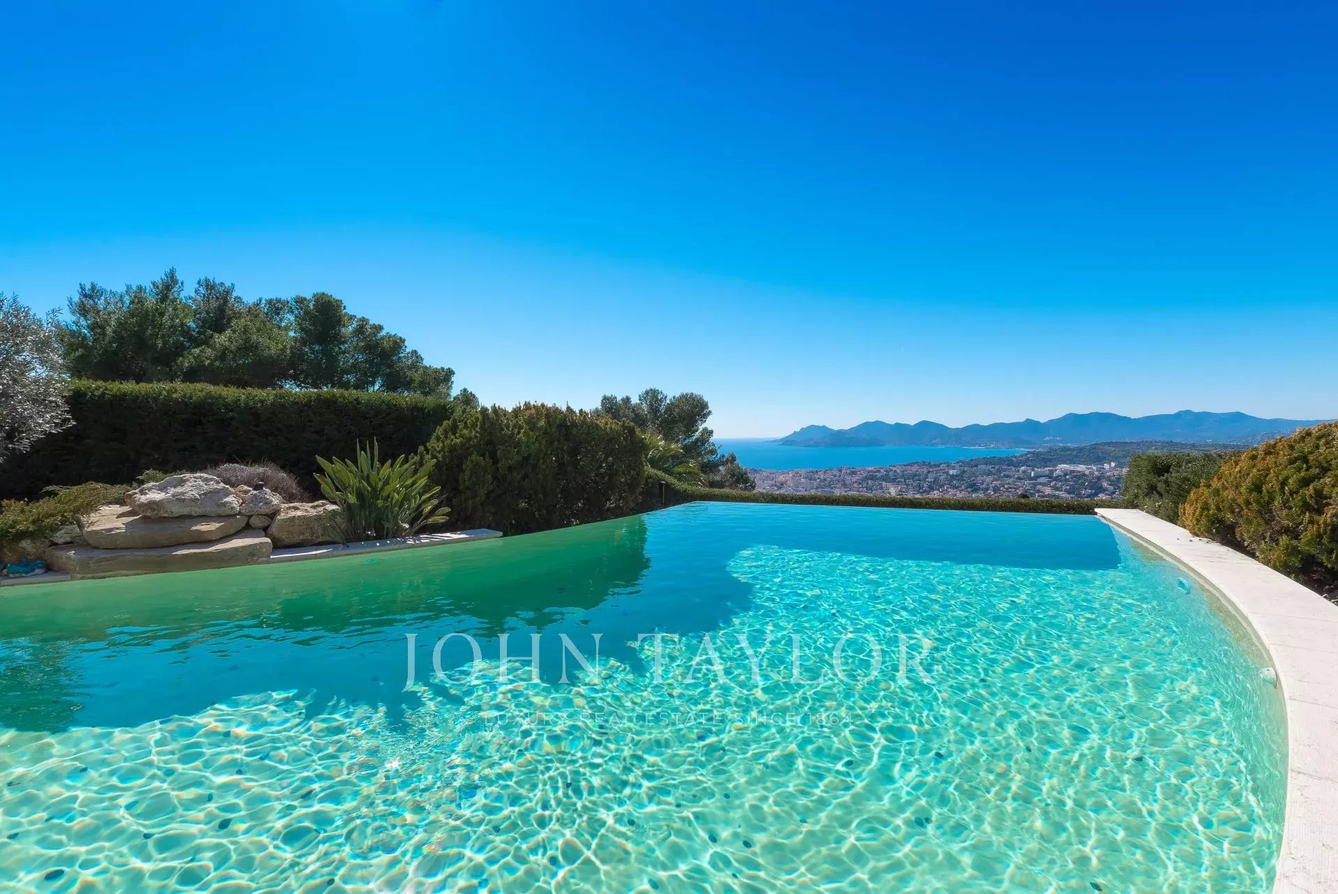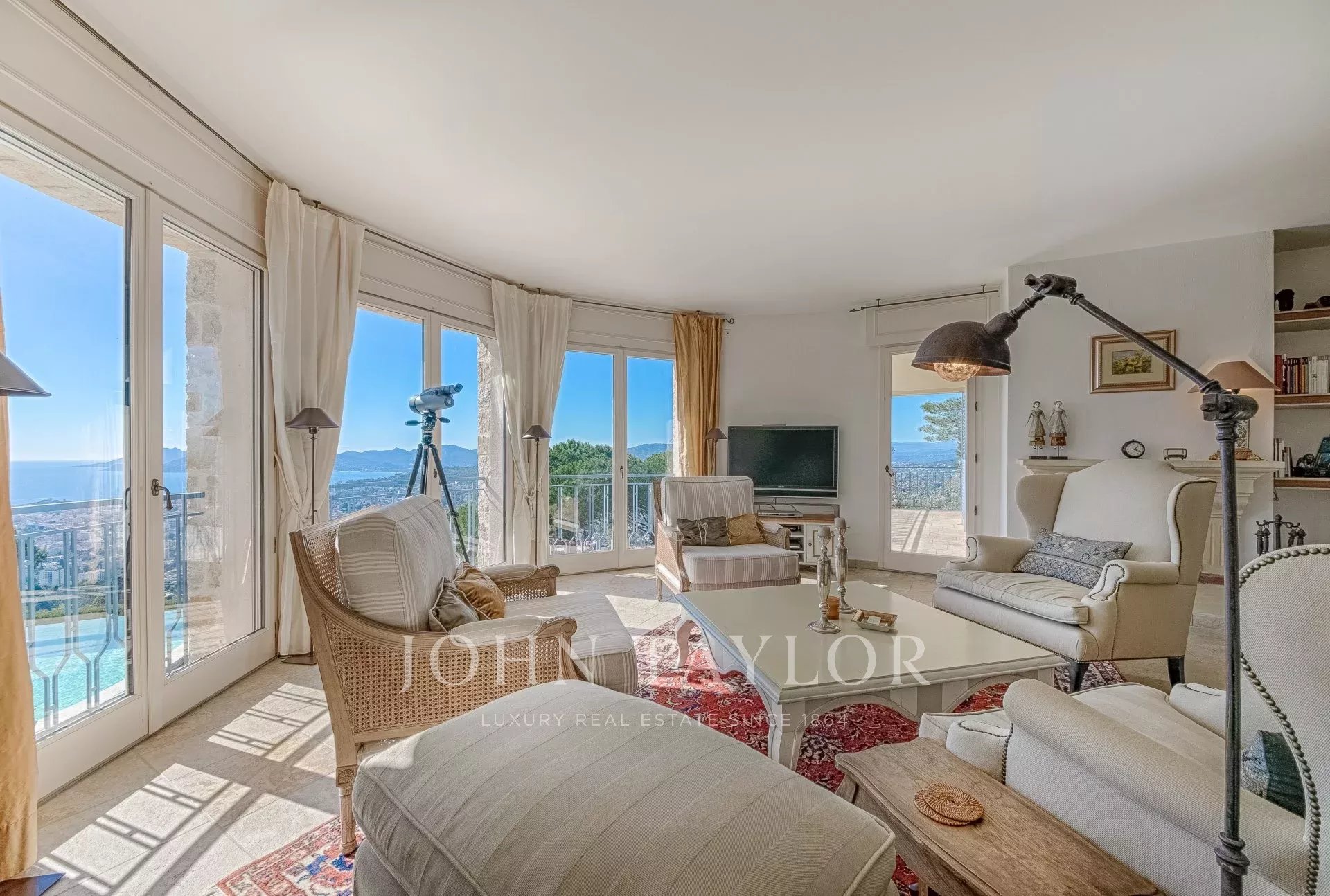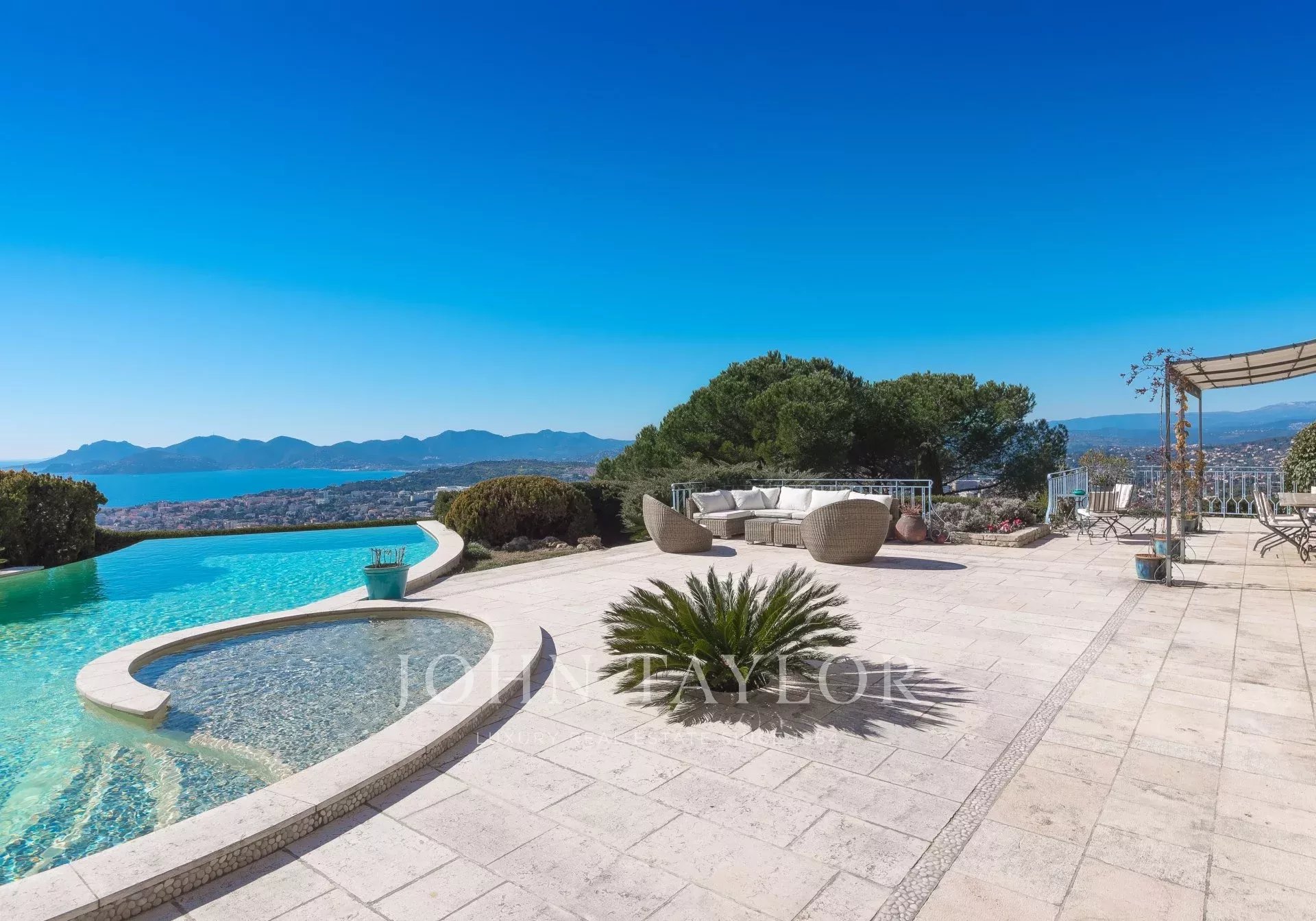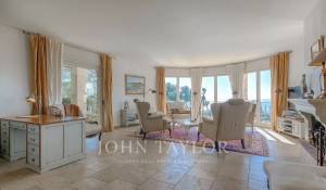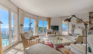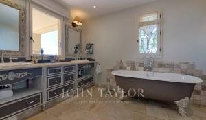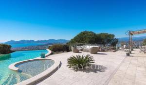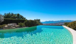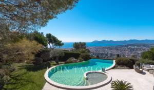 En las alturas de Cannes, hermosa y amplia villa climatizada de 350 m2 de superficie habitable sobre un terreno de 2.000 m2 que goza de vistas panorámicas sobre la bahía de Cannes y el macizo del Esterel.