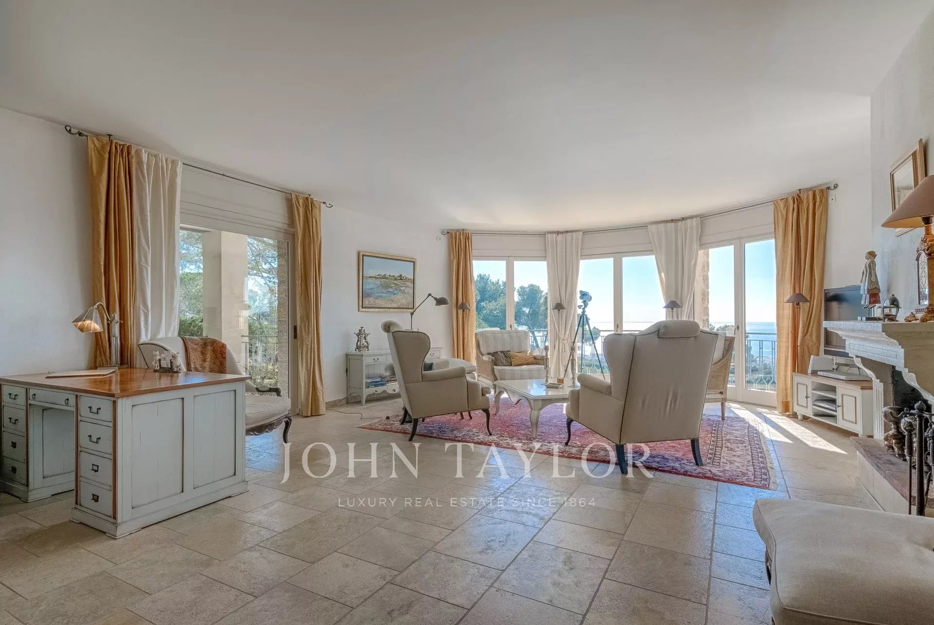 Gran salón con chimenea, TV, estudio con salida a dos terrazas con vistas al mar