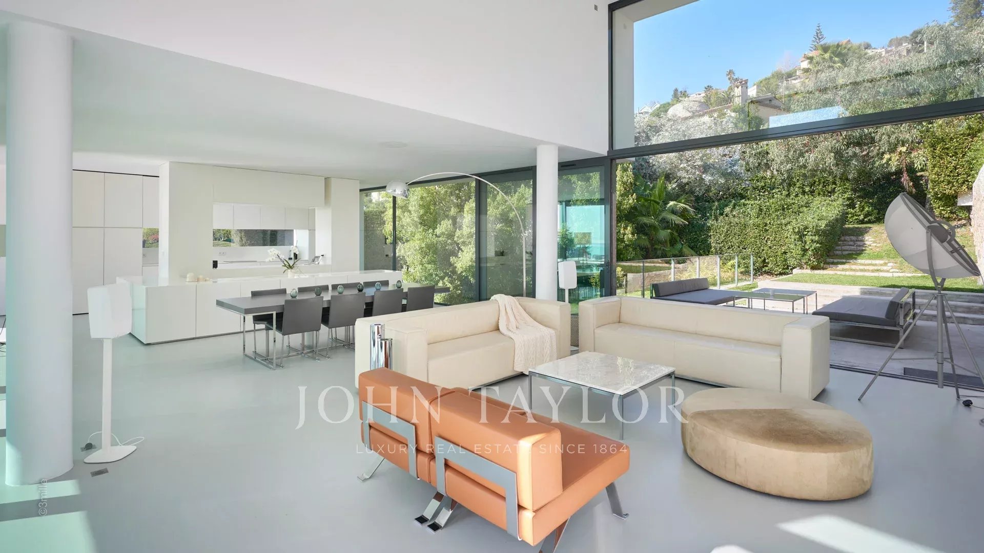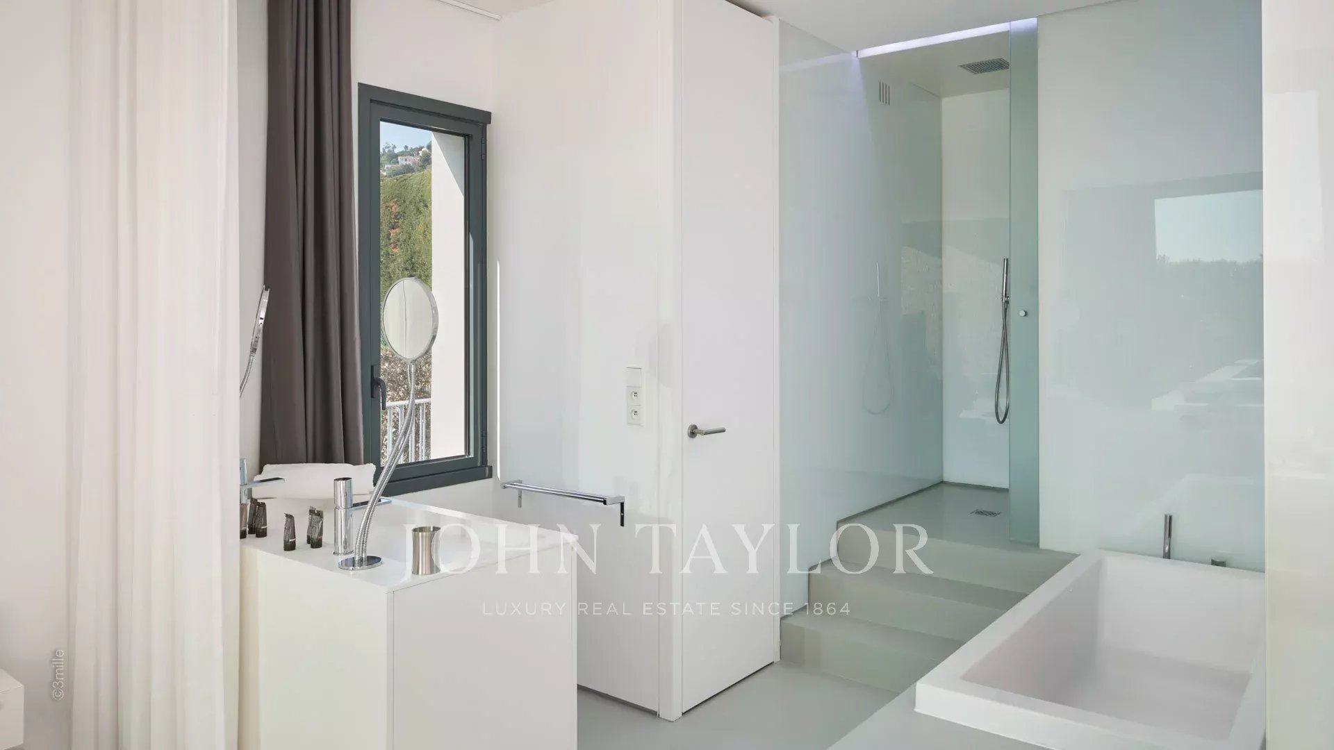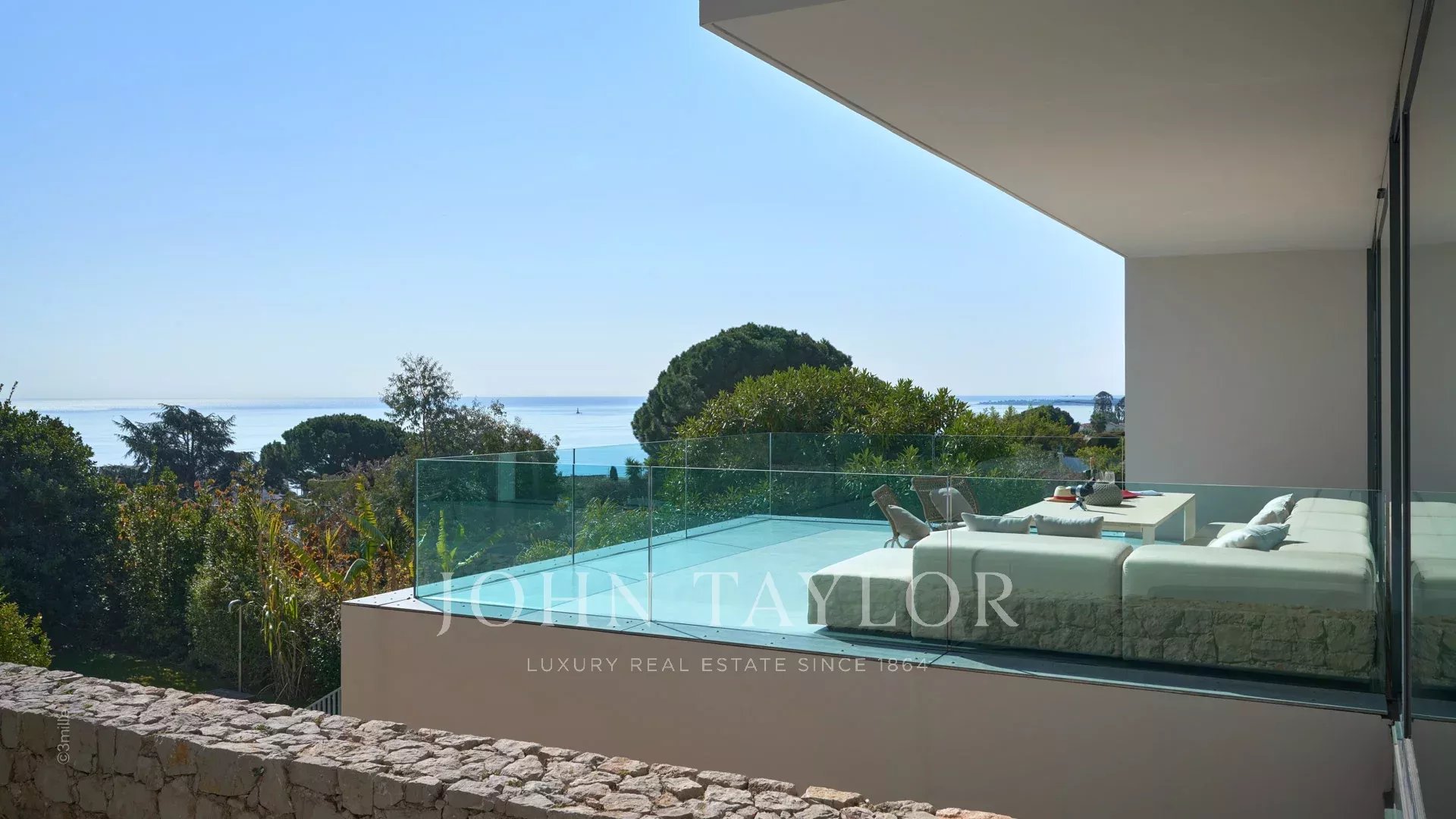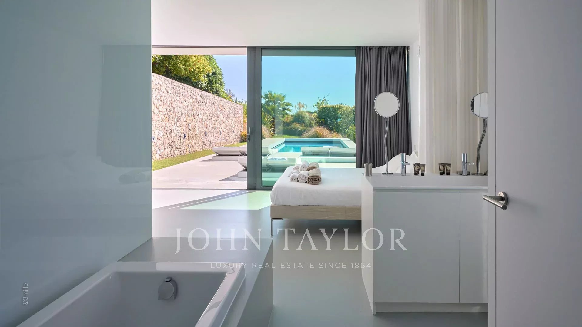 En las alturas de Golfe-Juan y totalmente climatizada, esta hermosa propiedad de arquitectura moderna construida en 2 niveles se compone de la siguiente manera: