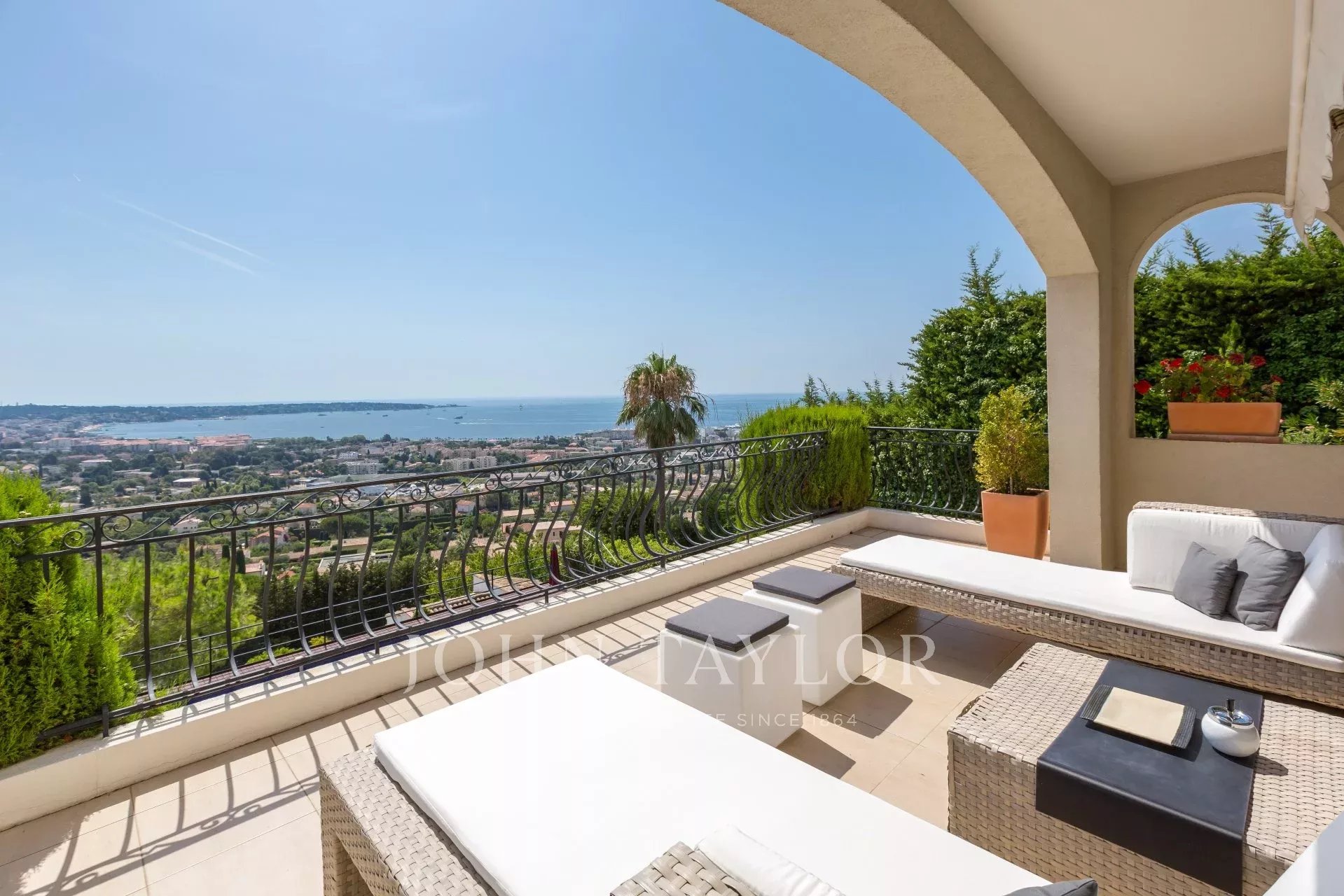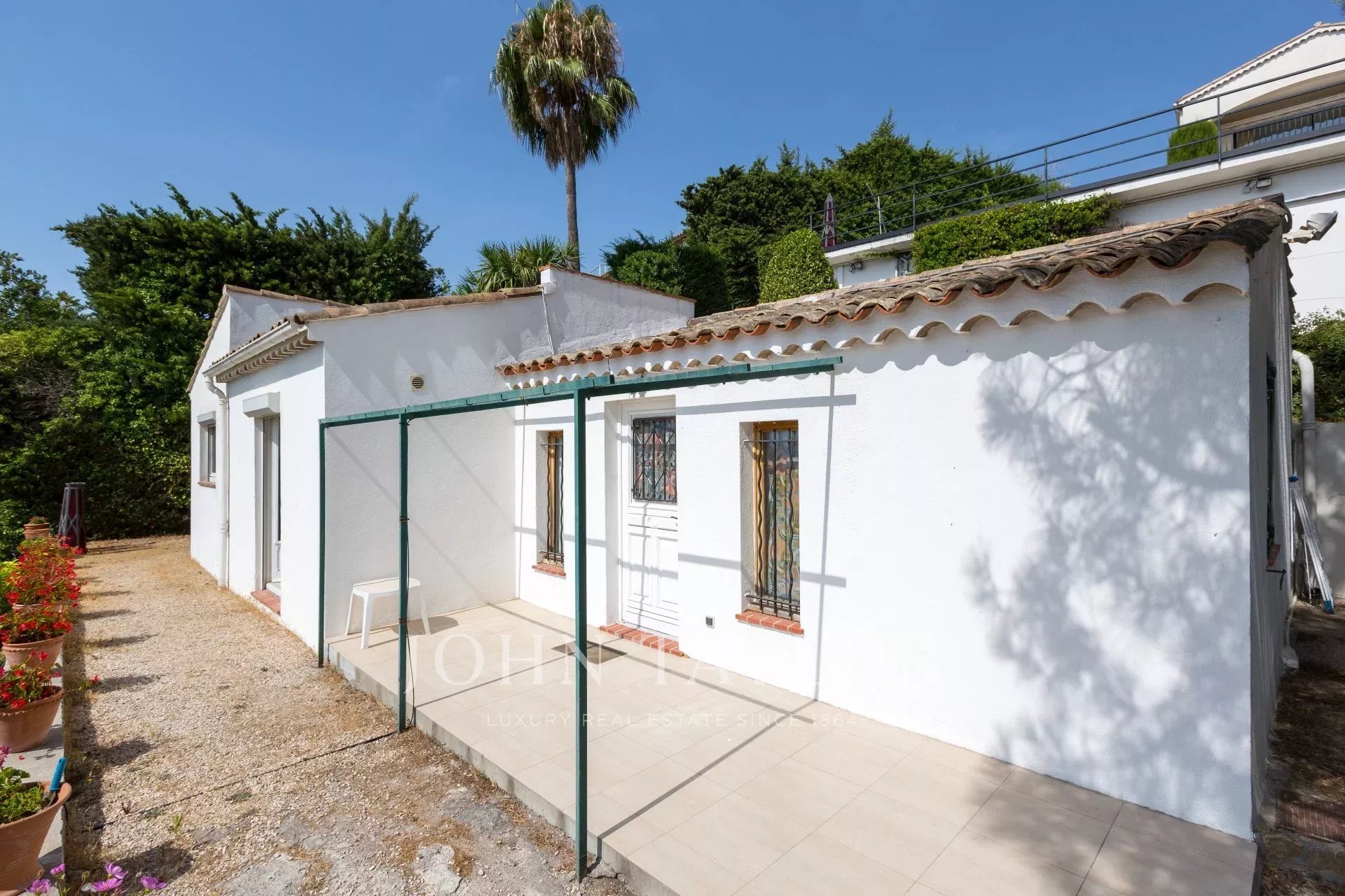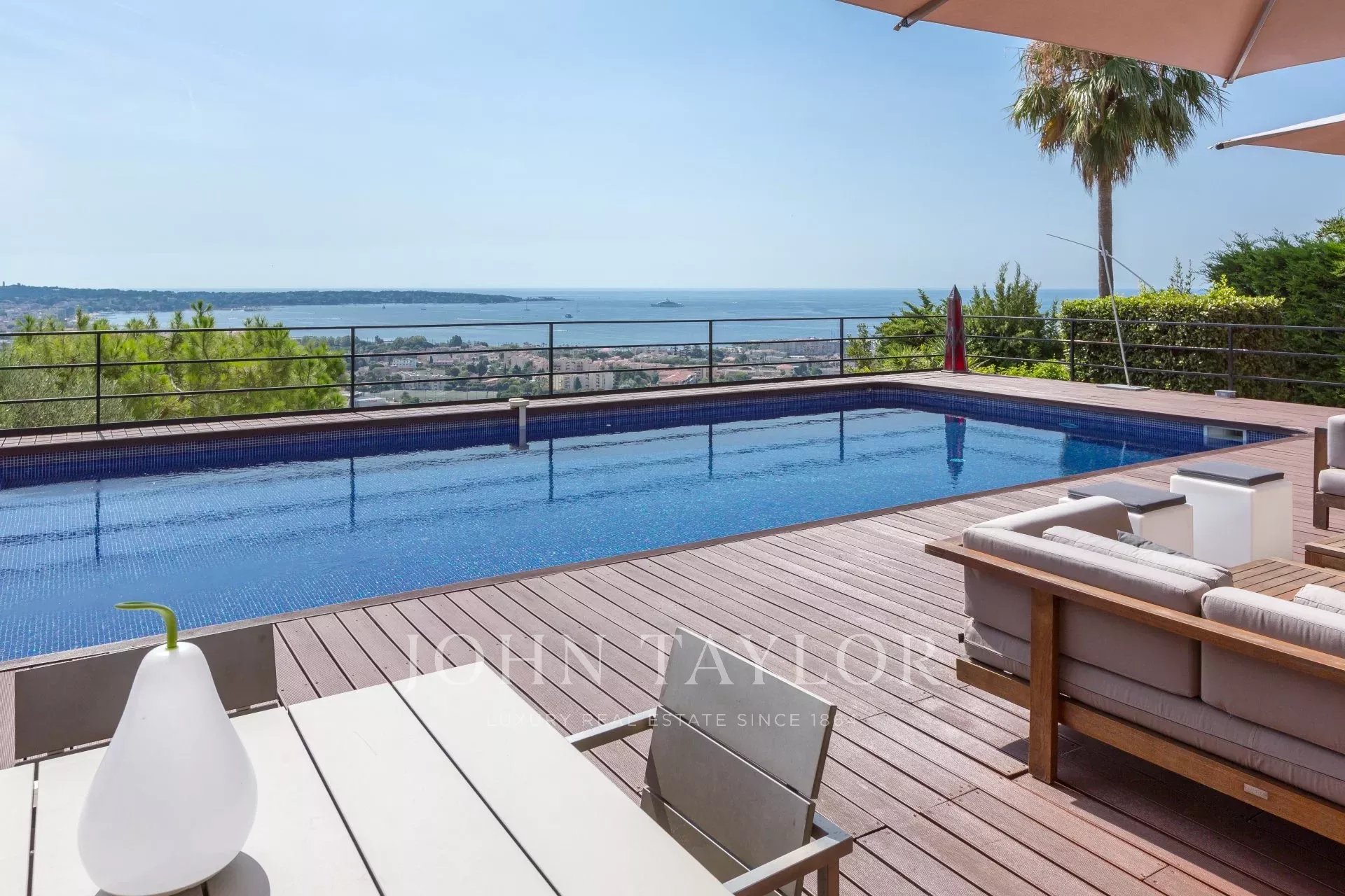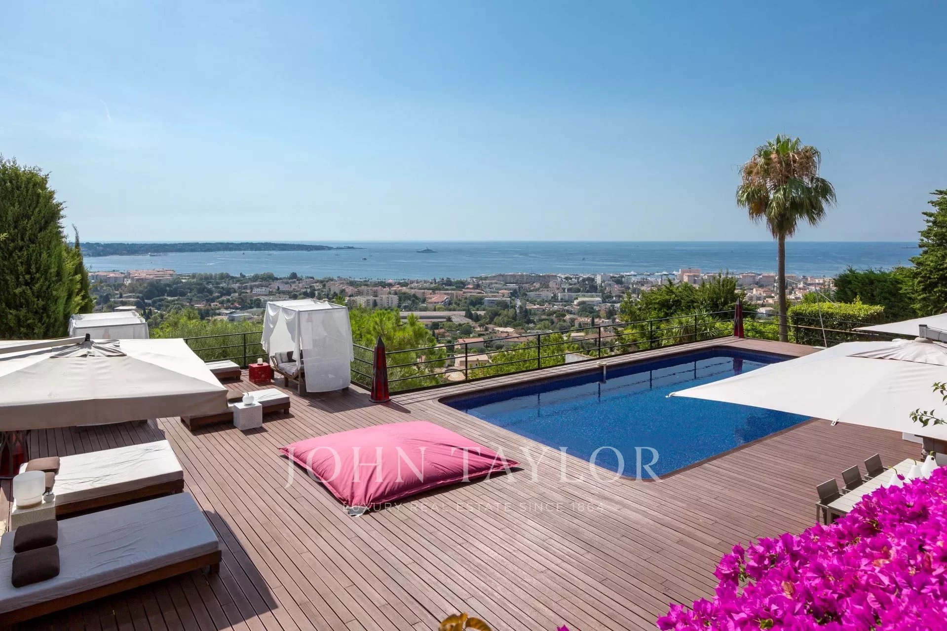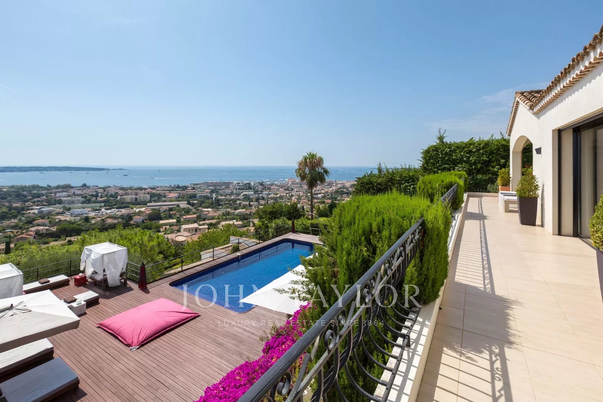 En las alturas de Golfe-Juan, en el corazón de un jardín paisajista de unos 3.000 m², esta magnífica villa cuenta con características contemporáneas de alta calidad y una vista panorámica excepcional sobre el mar hasta Cap d'Antibes.