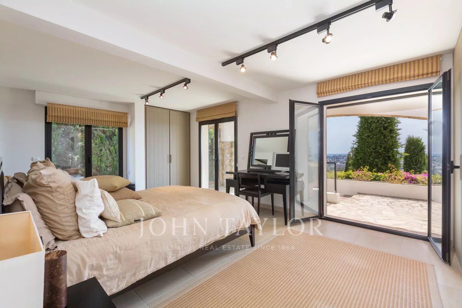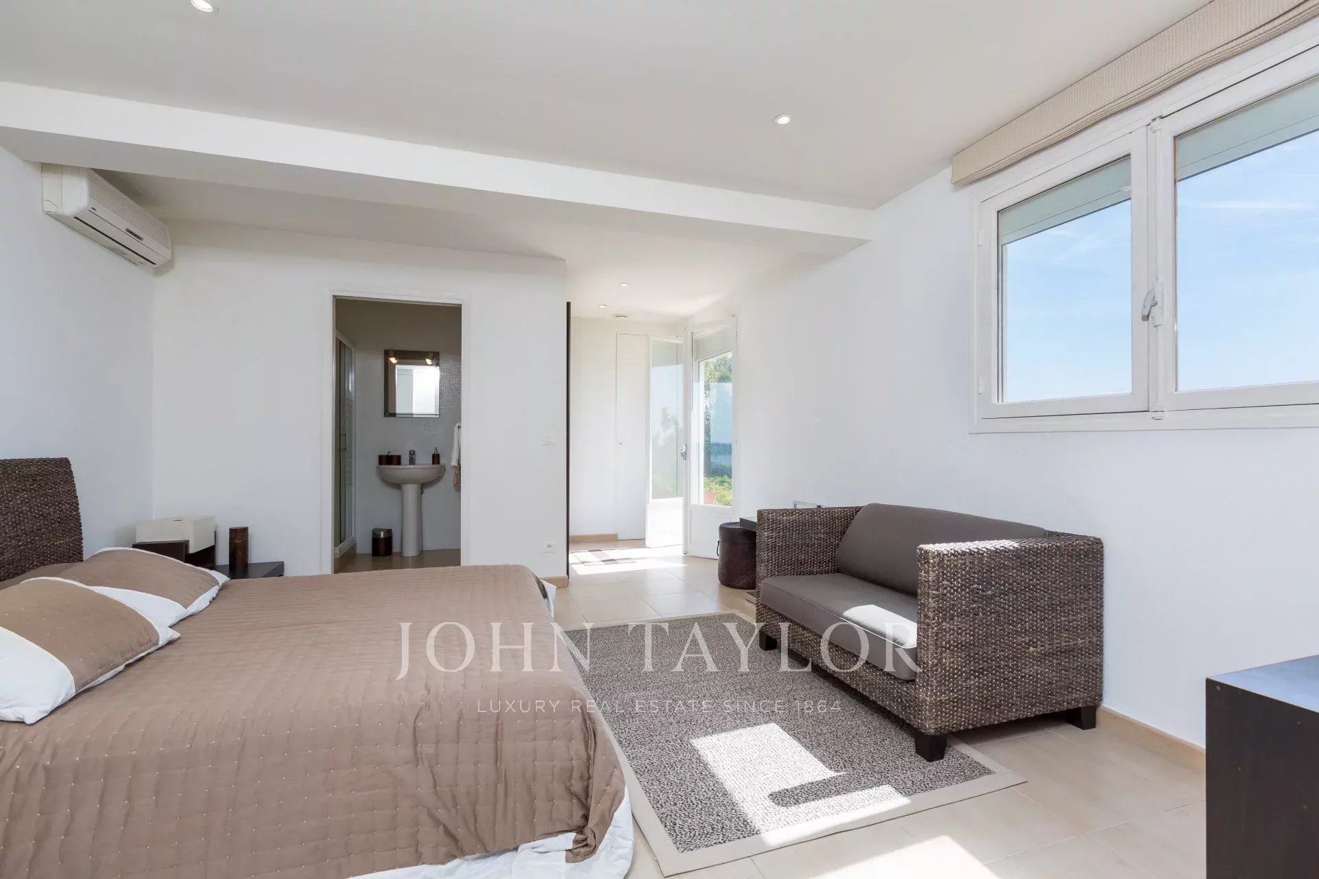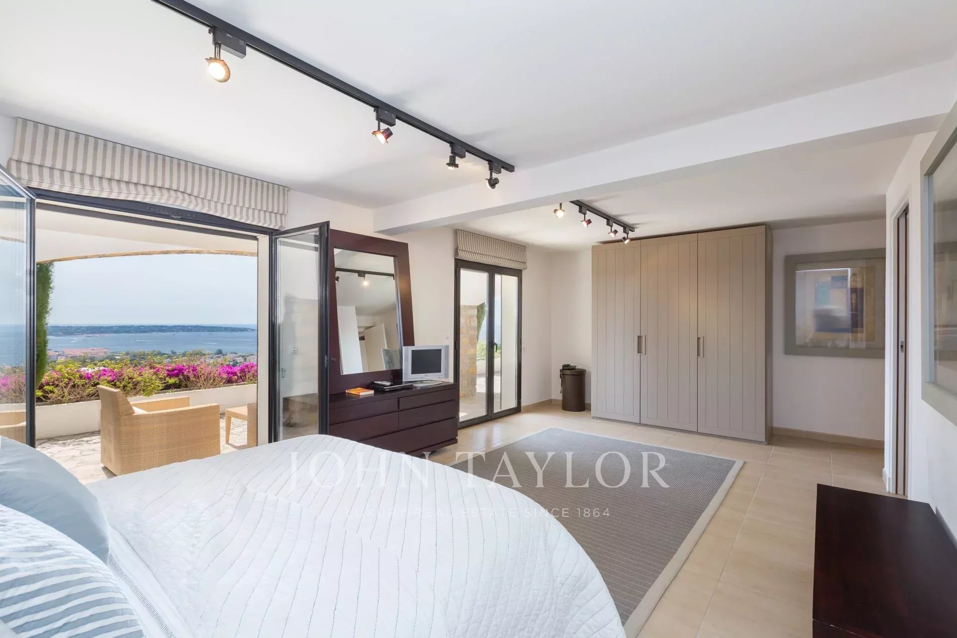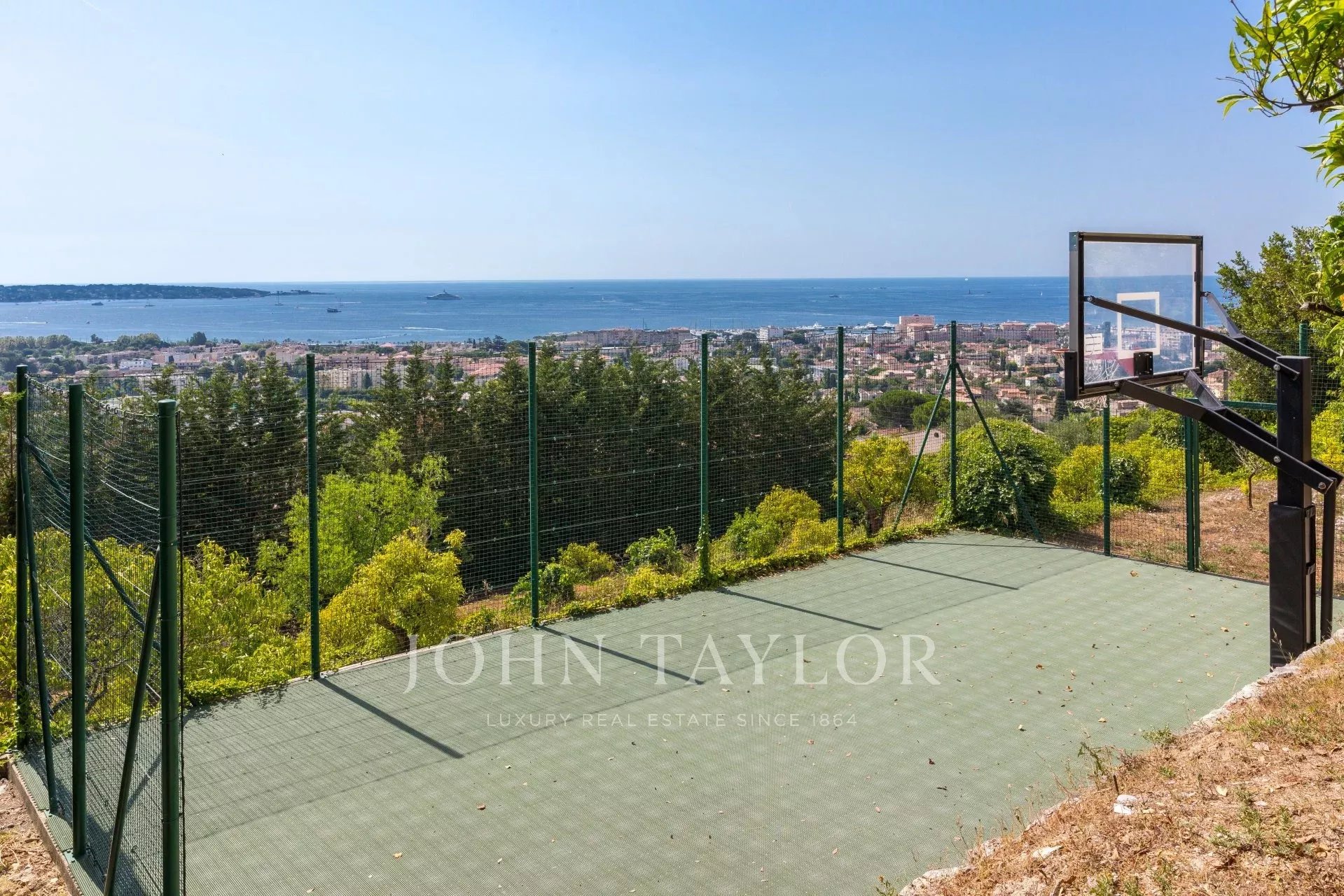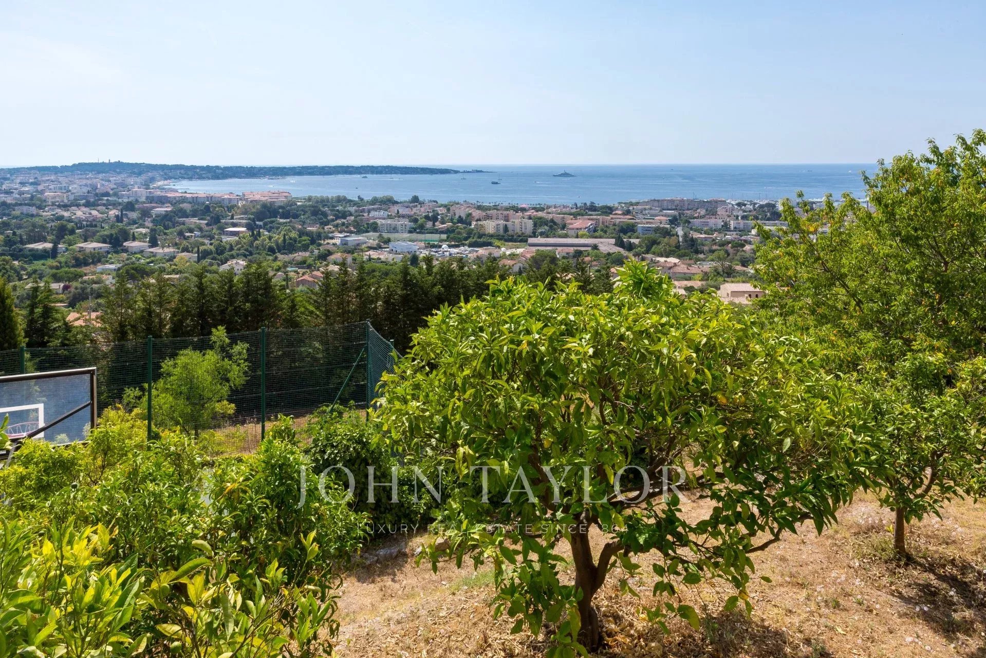 En las alturas de Golfe-Juan, en el corazón de un jardín paisajista de unos 3.000 m², esta magnífica villa cuenta con características contemporáneas de alta calidad y una vista panorámica excepcional sobre el mar hasta Cap d'Antibes.