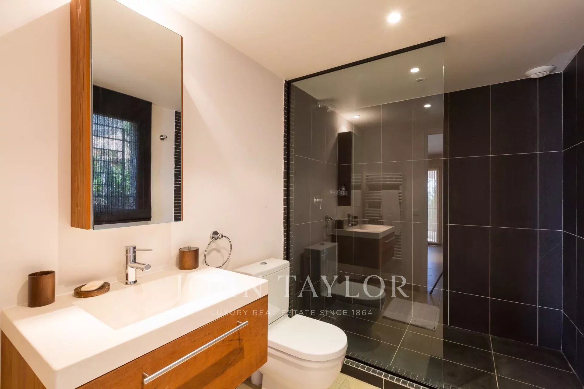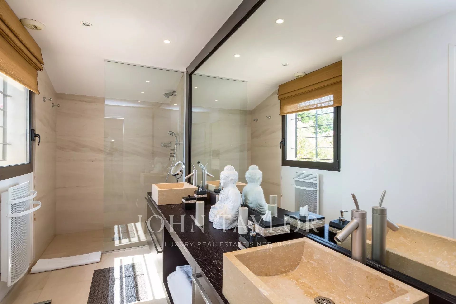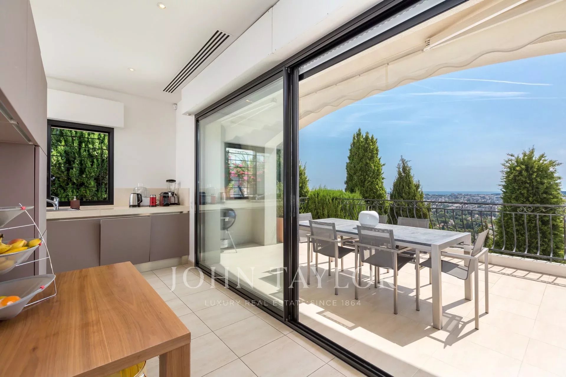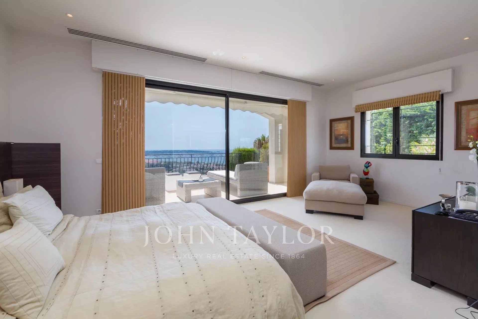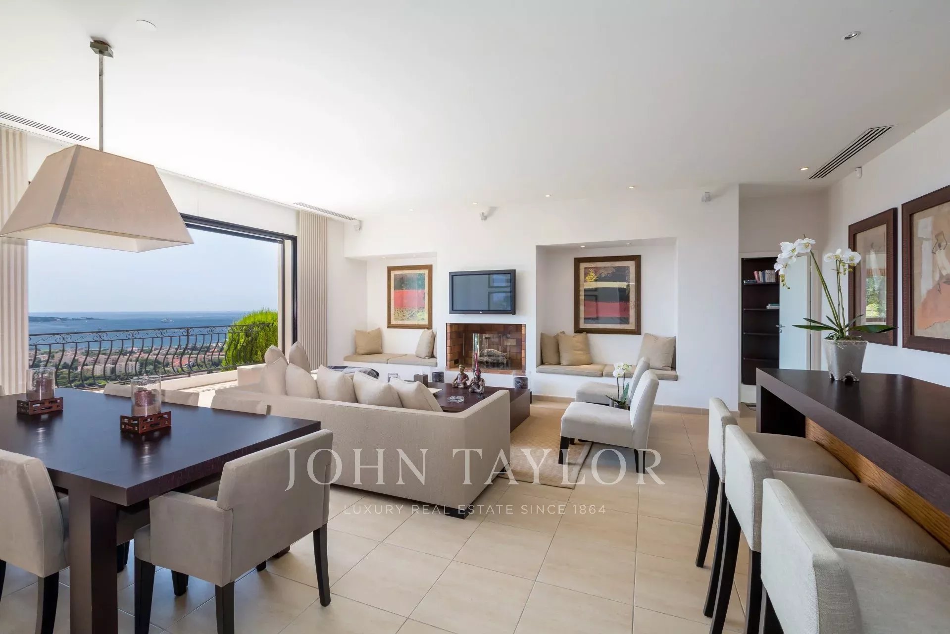 En las alturas de Golfe-Juan, en el corazón de un jardín paisajista de unos 3.000 m², esta magnífica villa cuenta con características contemporáneas de alta calidad y una vista panorámica excepcional sobre el mar hasta Cap d'Antibes.