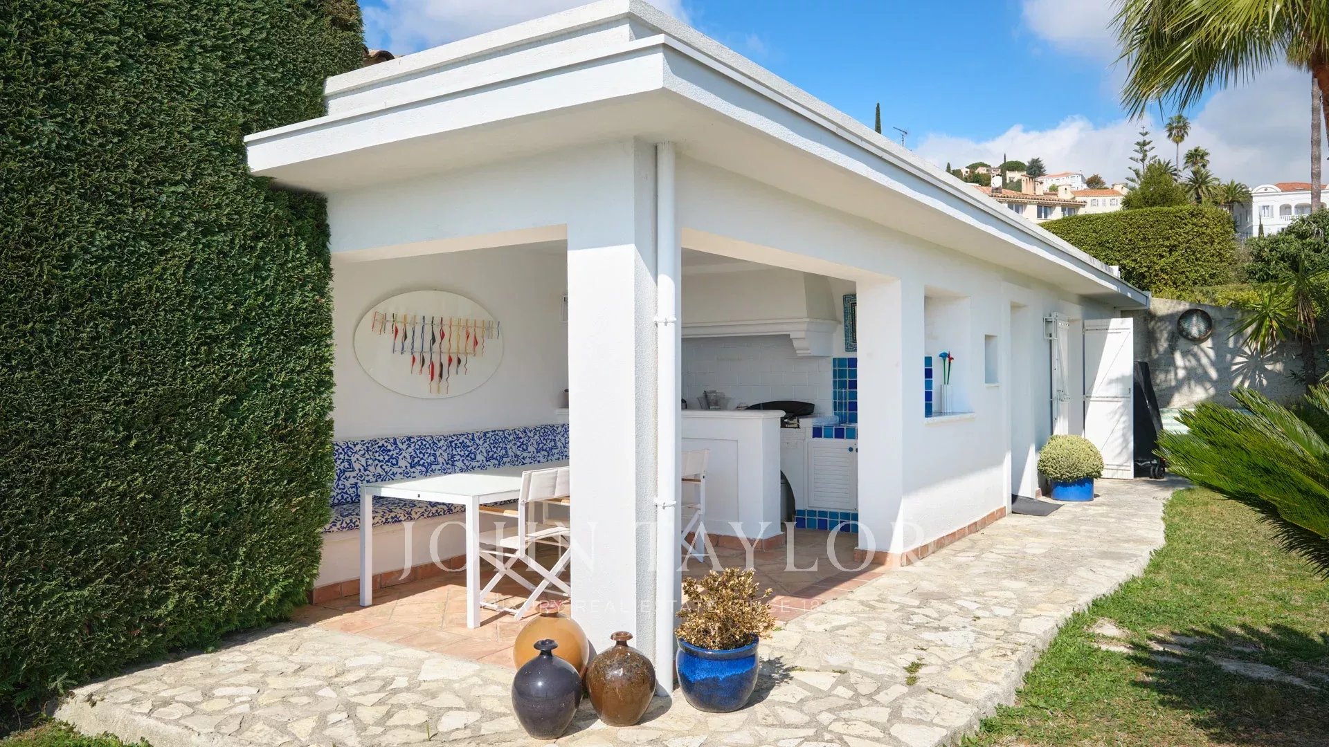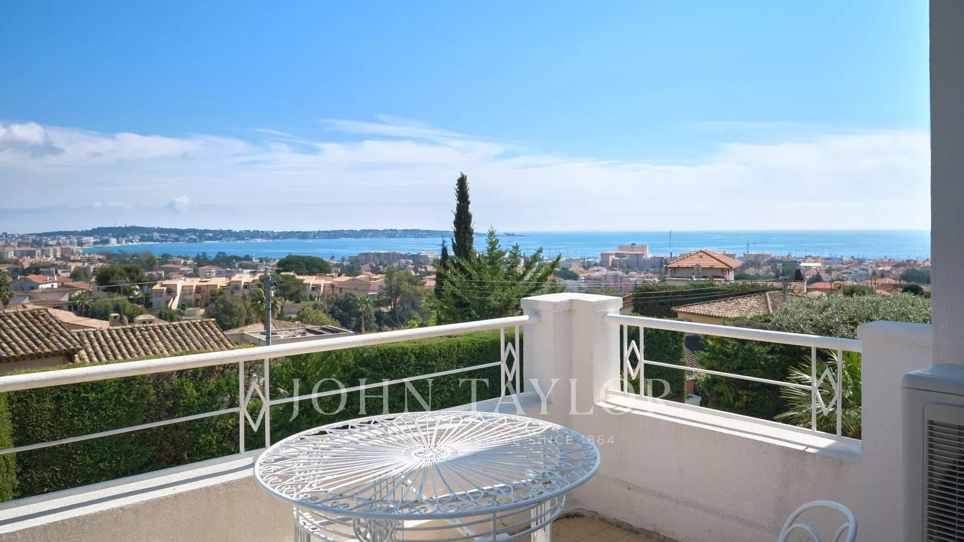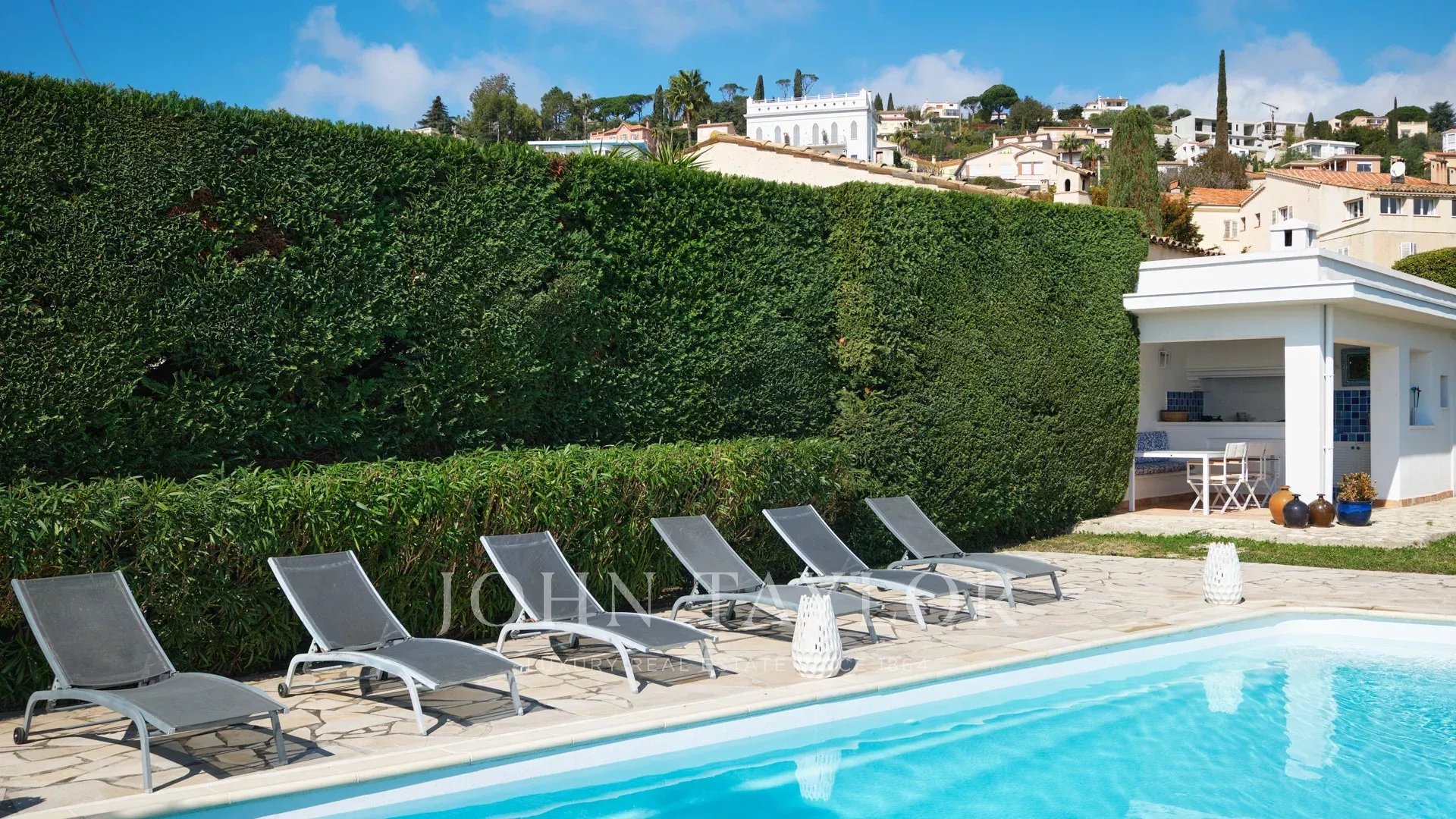 En las alturas de Golfe-Juan y a 800 m de las playas, en el corazón de un jardín de 1.000 m2, villa moderna que ofrece unos 180 m2 de superficie habitable y preciosas vistas al mar.