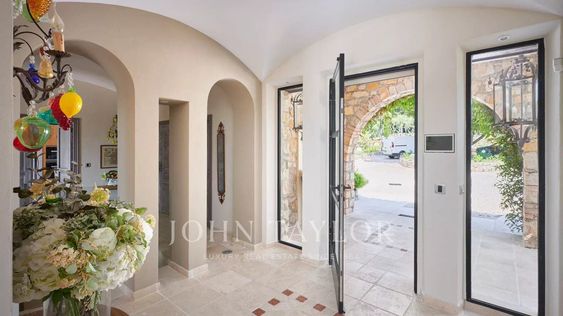 Hall de entrada que conduce a la sala de recepción, compuesta por un gran salón y un comedor que se abren a las terrazas a través de grandes ventanales.
