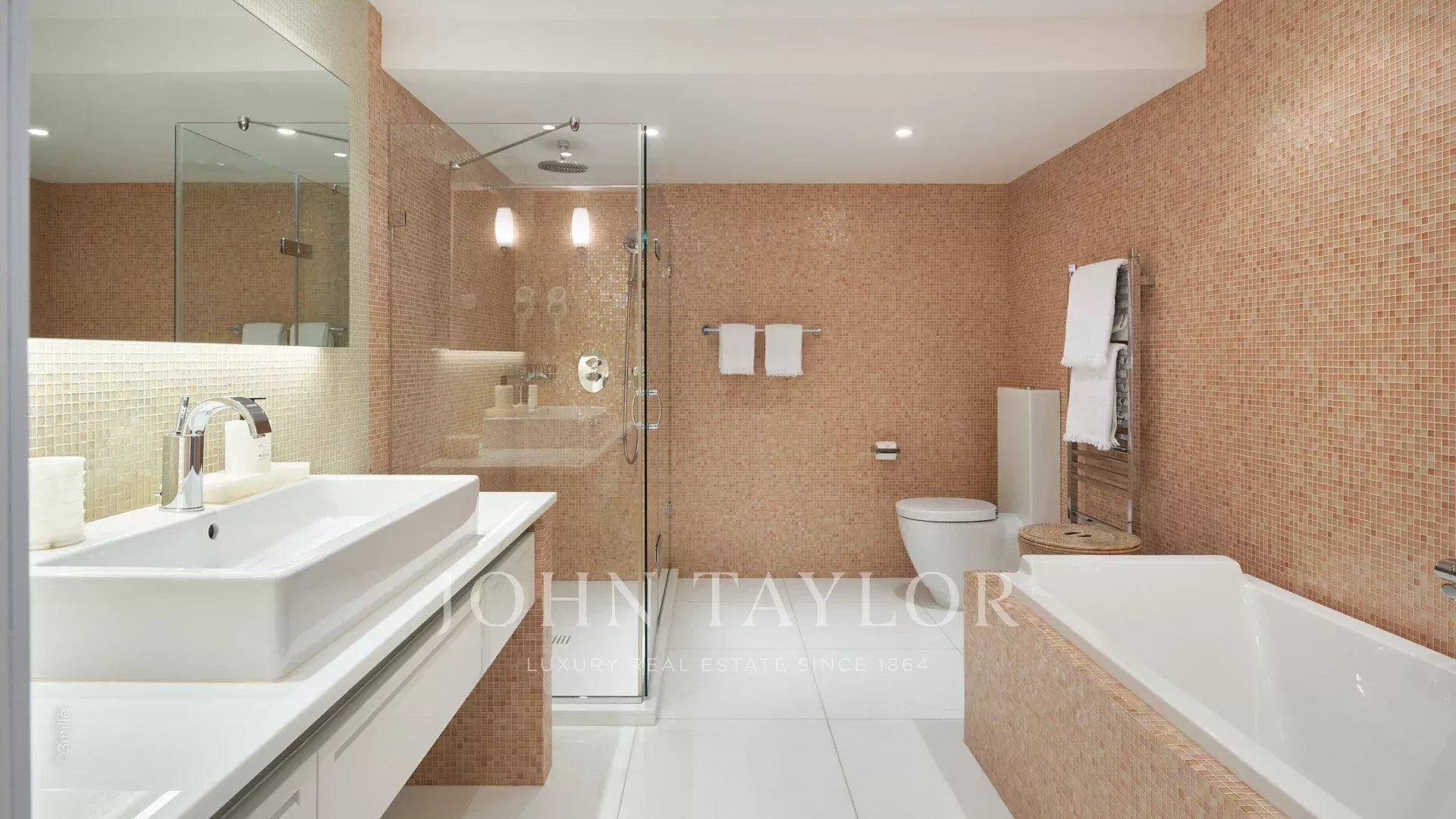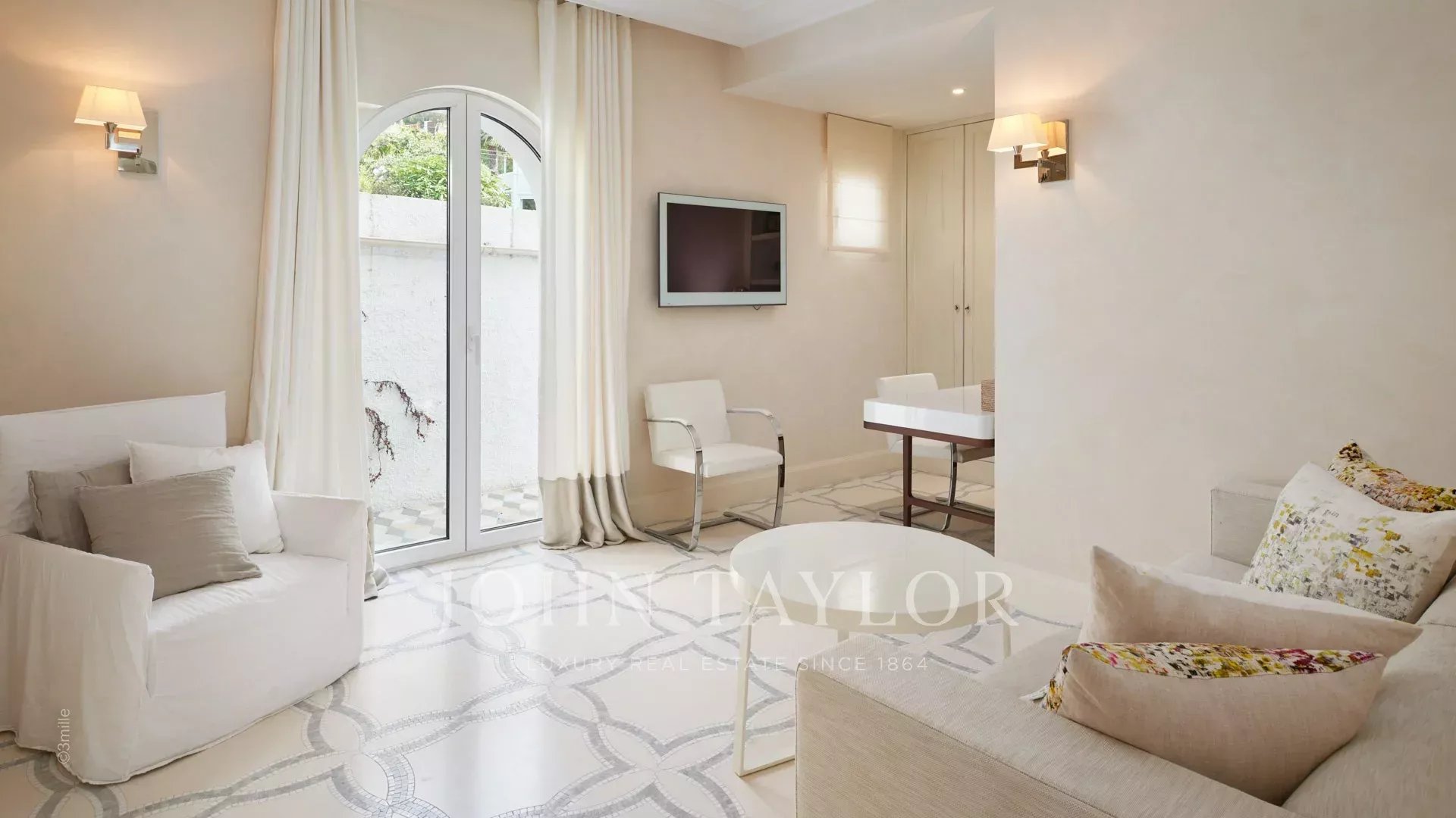 La entrada le conduce a una amplia sala de recepción que se abre a una magnífica terraza con vistas al mar y al casco antiguo de Antibes, compuesta por un salón y un comedor con capacidad para 12 personas.