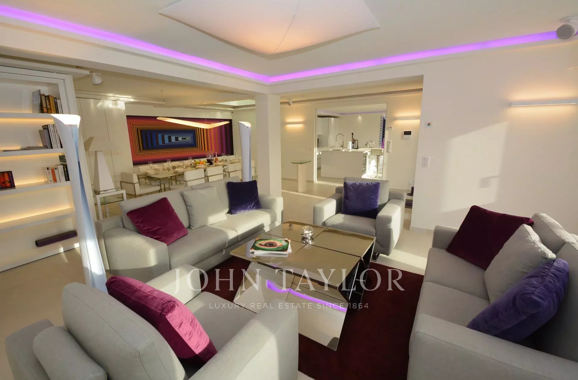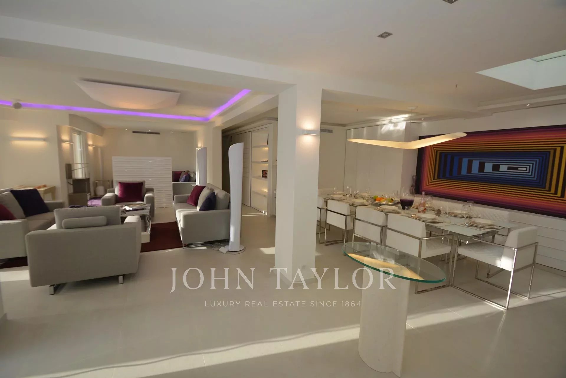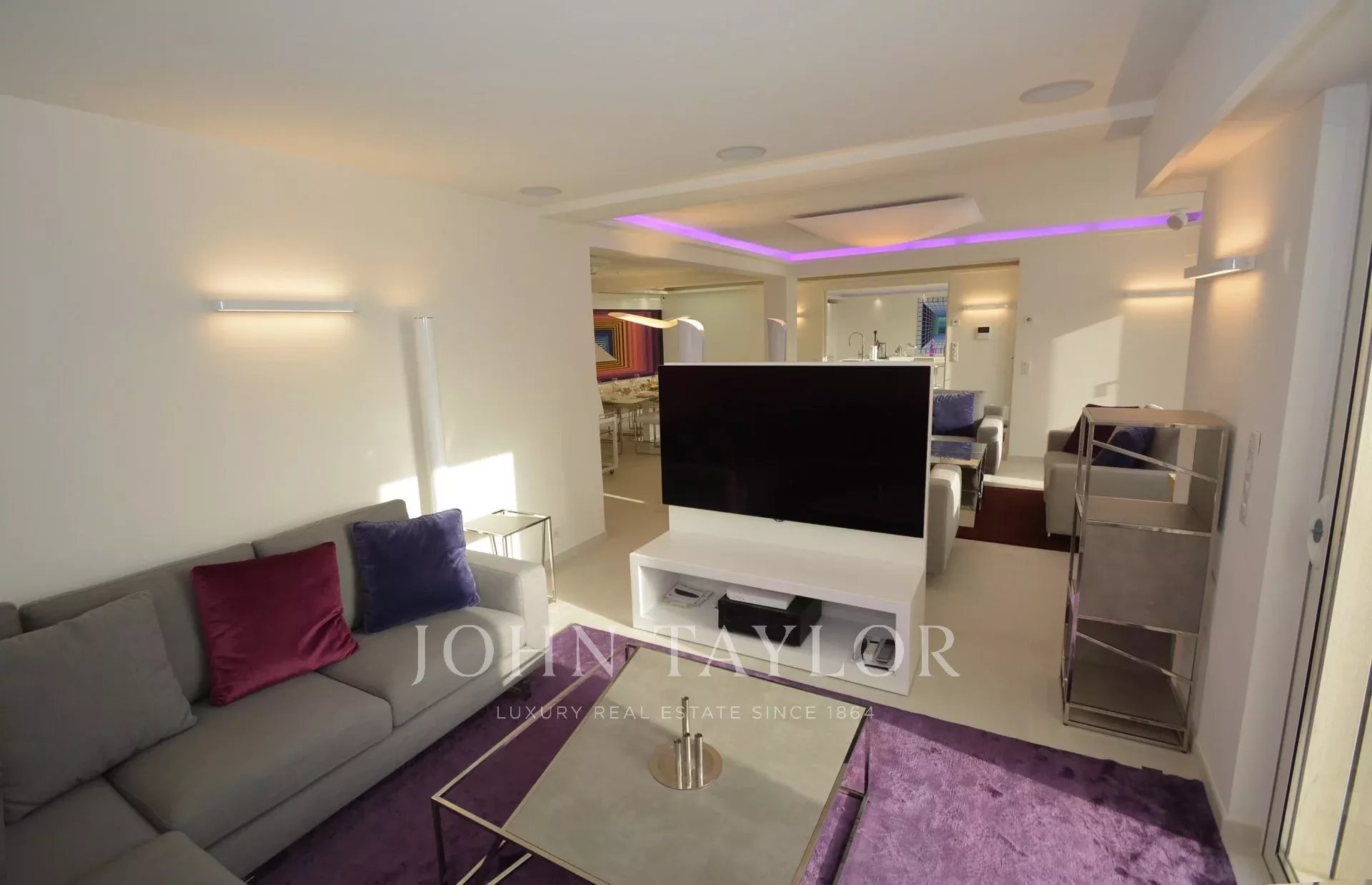 Entrada que da a una gran sala de recepción que consta de salón, comedor (10 personas), sala de televisión.