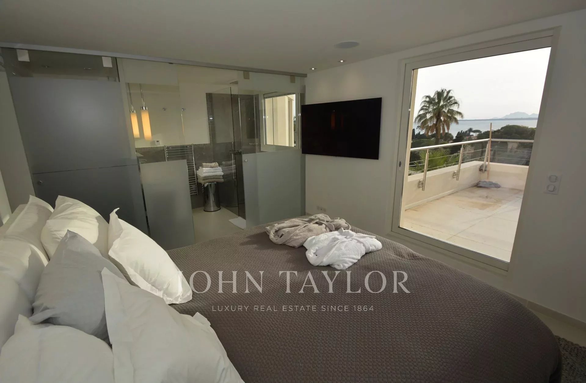 Dormitorio (cama doble - caja fuerte) que da a una terraza independiente, vista al mar - Cuarto de ducha abierto / WC